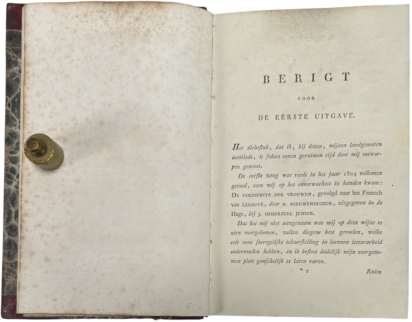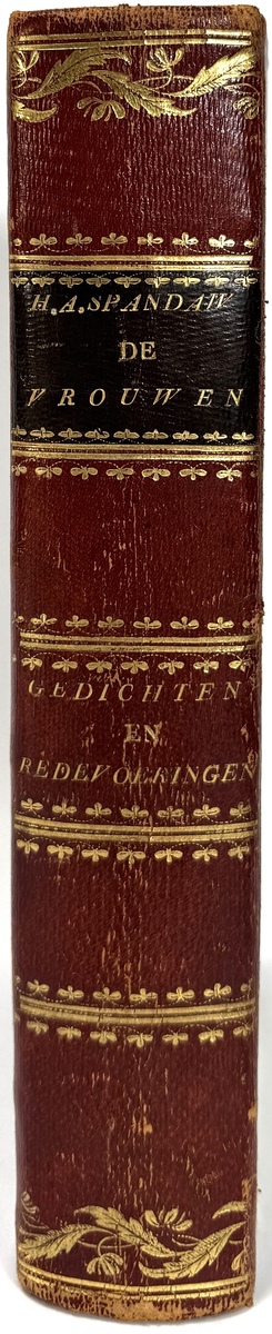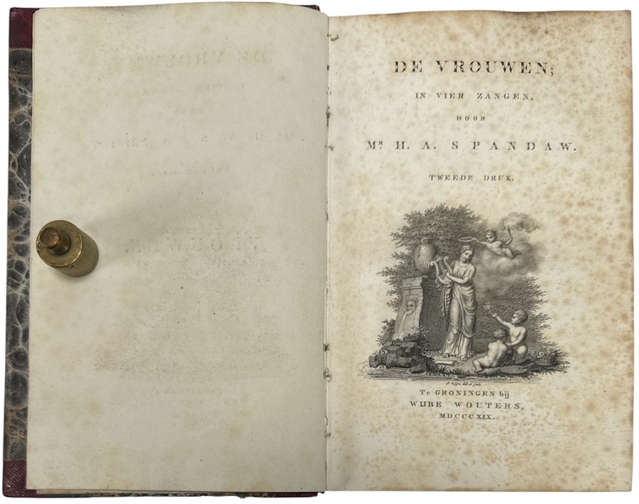 Boek De Vrouwen, in vier zangen door Mr. H.A. Spandaw (1777–1855), tweede druk, Groningen, Wubbe Wouters, 1819. Uitgevoerd met rood leren rug met goudkleurige versiering en zwart titelschild. Gedrukt in boekdruk op papier, met titelvignet in klassieke allegorie. Met voorrede “Berigt voor de eerste uitgave” en rugtitel Gedichten en Redevoeringen. Geïnteresseerd? Bezoek onze kijkdagen voor een persoonlijke bezichtiging! |