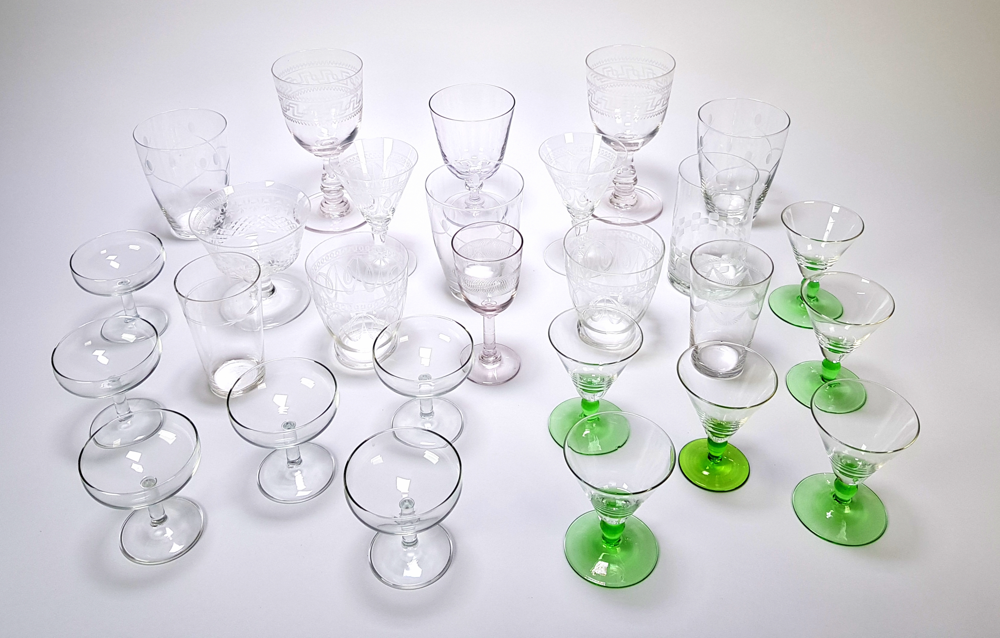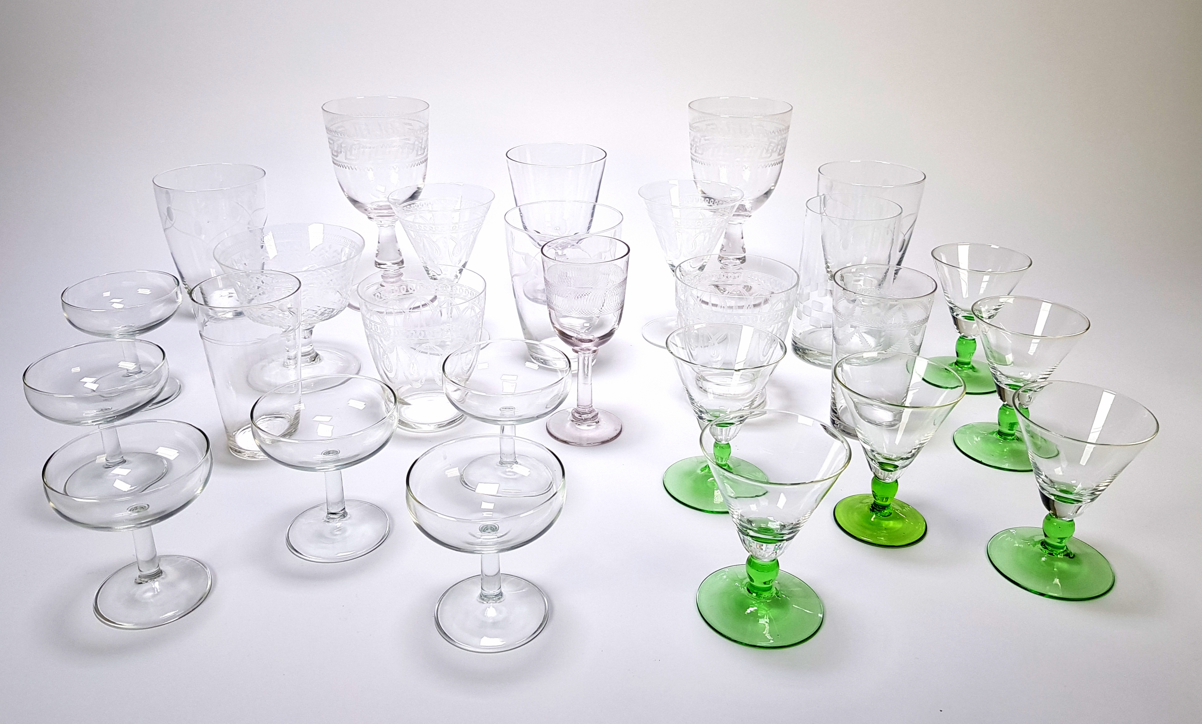 Verzameling van diverse glazen, waaronder drinkglazen en coupes. De glazen dateren uit de tweede helft van de 20e eeuw tot heden. De glazen zijn gemaakt van helder en gekleurd glas, waarvan een aantal met een geëtst patroon. Zeker zijn van deelname? Plaats vanaf 22 augustus een schriftelijk bod online! |