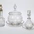 Glaswerk, eind 19e eeuw tot begin 20e eeuw, bestaande uit twee kristallen karaffen met goudkleurig gegraveerde decoratie, een grote kom met deksel en schotel, een kleinere karaf met schotel en een amberkleurige pot met deksel. Uitgevoerd in handgeslepen en gegraveerd glas. Kenmerkend zijn de gefacetteerde stoppen, florale gravures en het gebruik van helder en gekleurd glas. Voeg deze glas set toe aan je verzameling en doe een bod! |