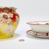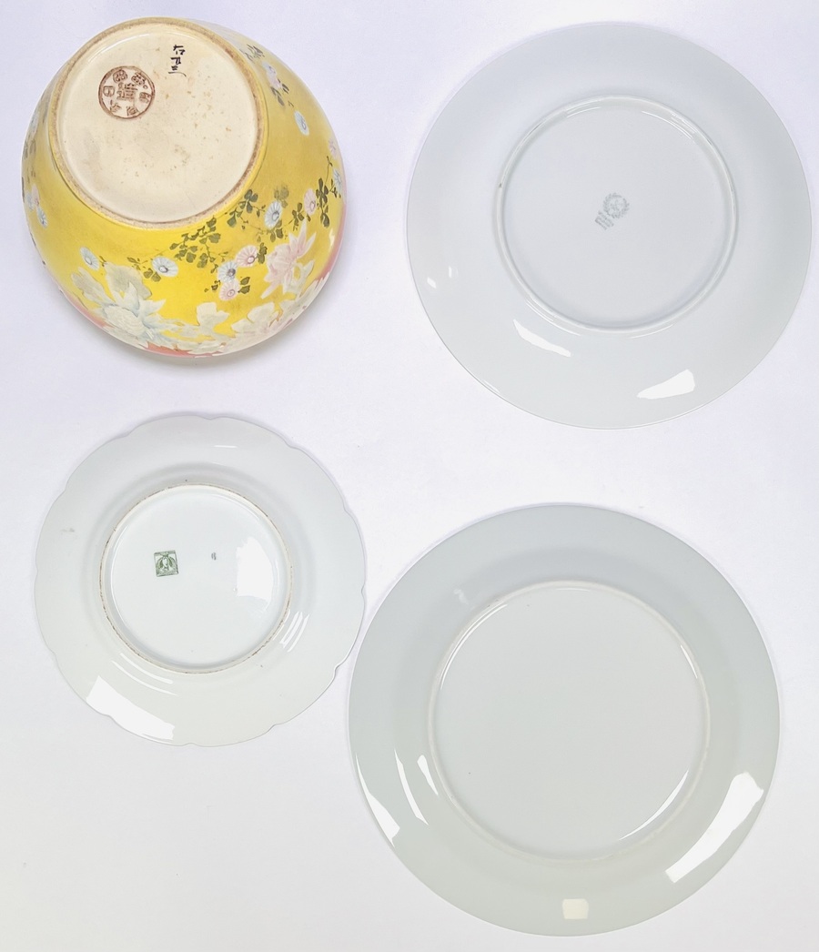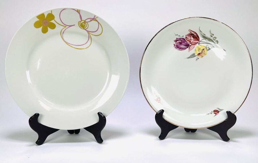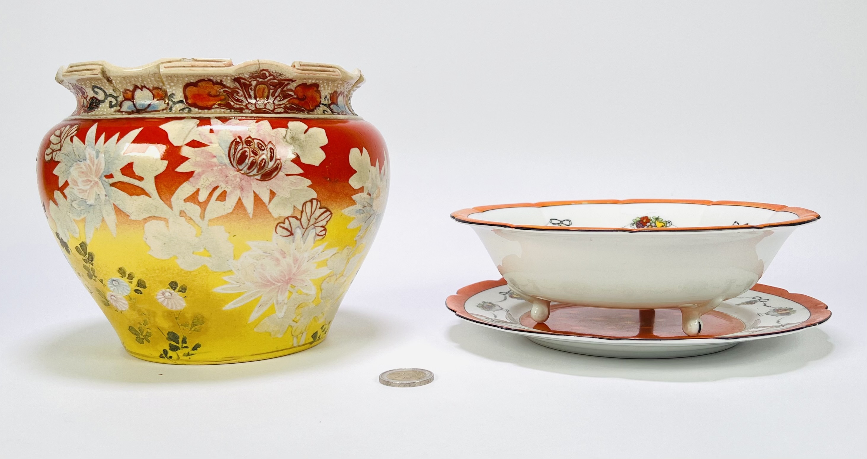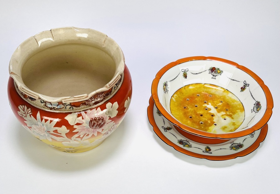 Verzameling van vier keramische objecten uit de 20e eeuw, bestaande uit twee borden, een bloempot en een fruittest met schotel, beschilderd met een floraal of een abstract patroon in verschillende kleuren. De schotel met schaal heeft een oranje rand en een geperforeerde bodem. Geïnteresseerd? Bezoek onze kijkdagen op 29, 30 of 31 augustus van 11:00 tot 17:00 uur! |