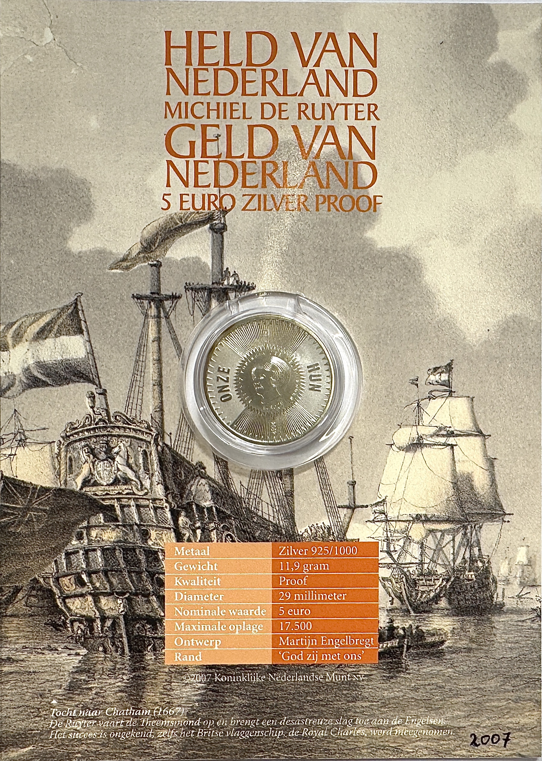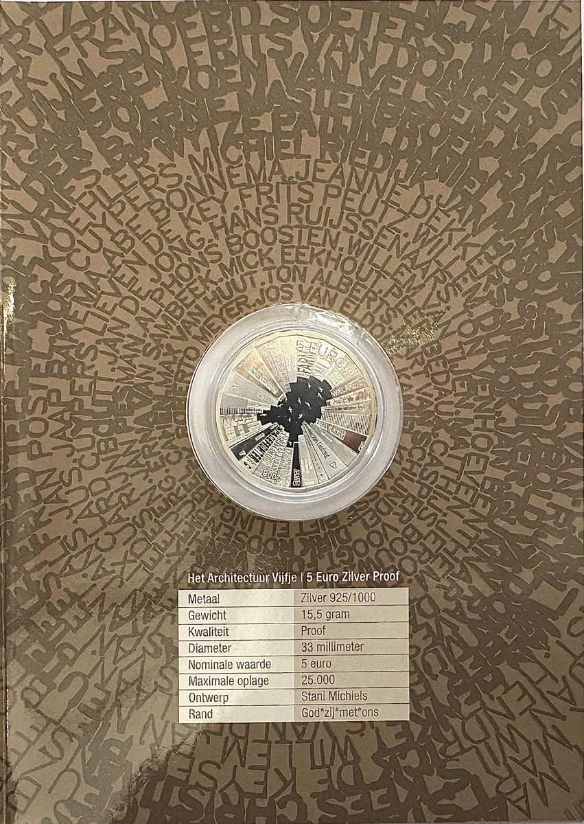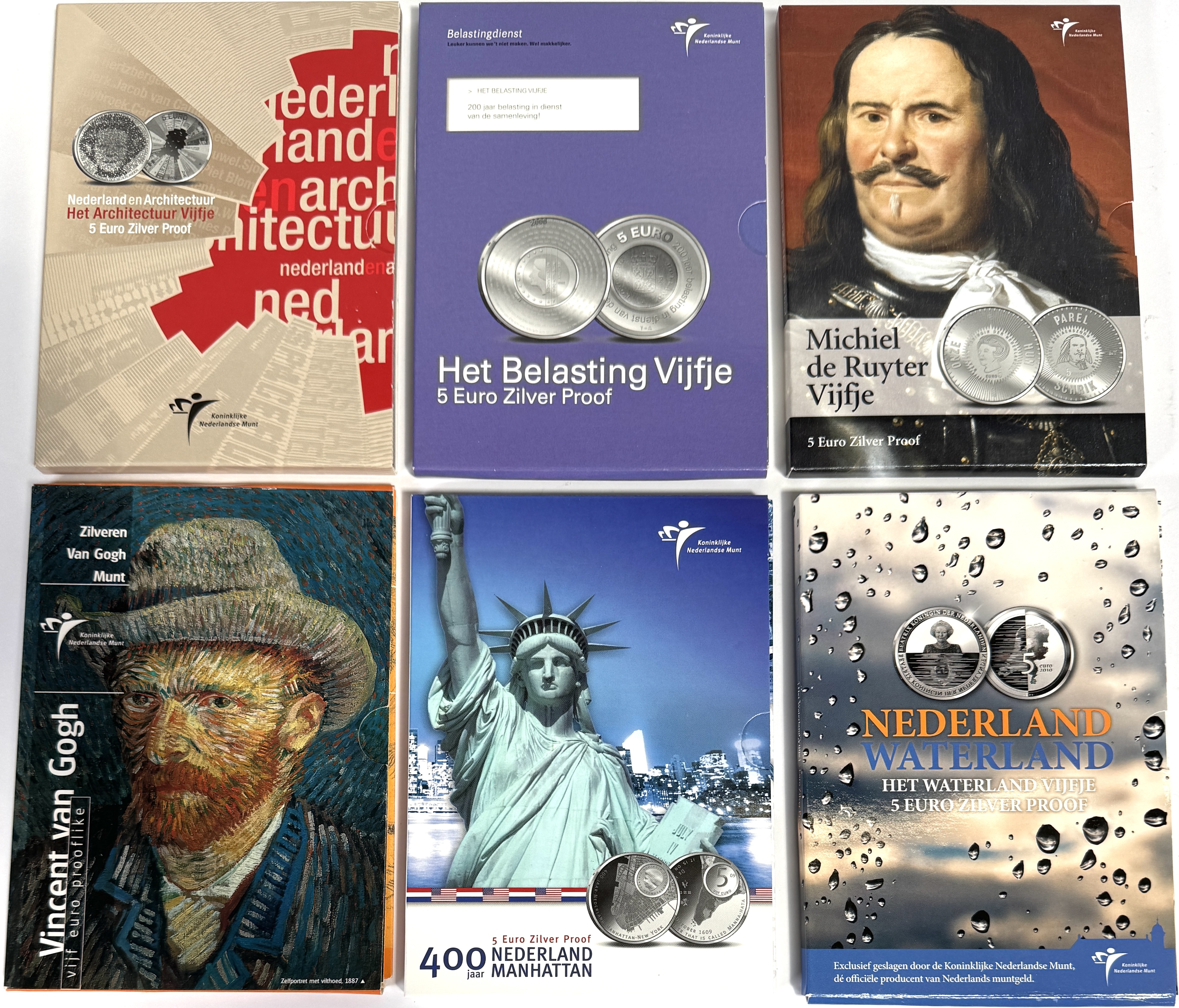 Zes Nederlandse 5 euro zilver proof munten uit 2006–2009, vervaardigd in zilver 925/1000. Makers zijn onder meer Ronald van Tienhoven (1956), Esther Tielemans (1976), Hennie Bouwe (1950), Martijn Engelbregt (1970) en Stani Michiels (1969). Ontwerpen thematisch gewijd aan Van Gogh, Manhattan, Waterland, belastingen, Michiel de Ruyter en architectuur. Met originele verpakking en oplagevermelding. Wil je de munten in het echt bekijken? Kom naar de kijkdagen op 29, 30 en 31 augustus! |