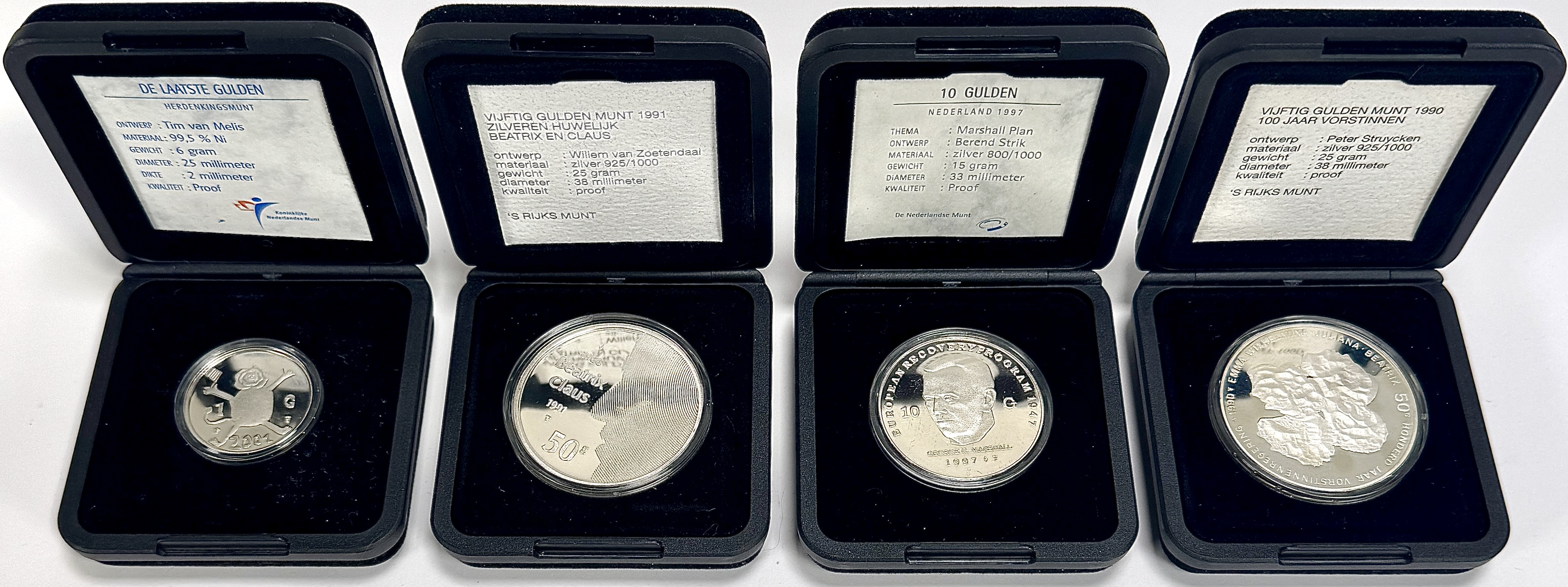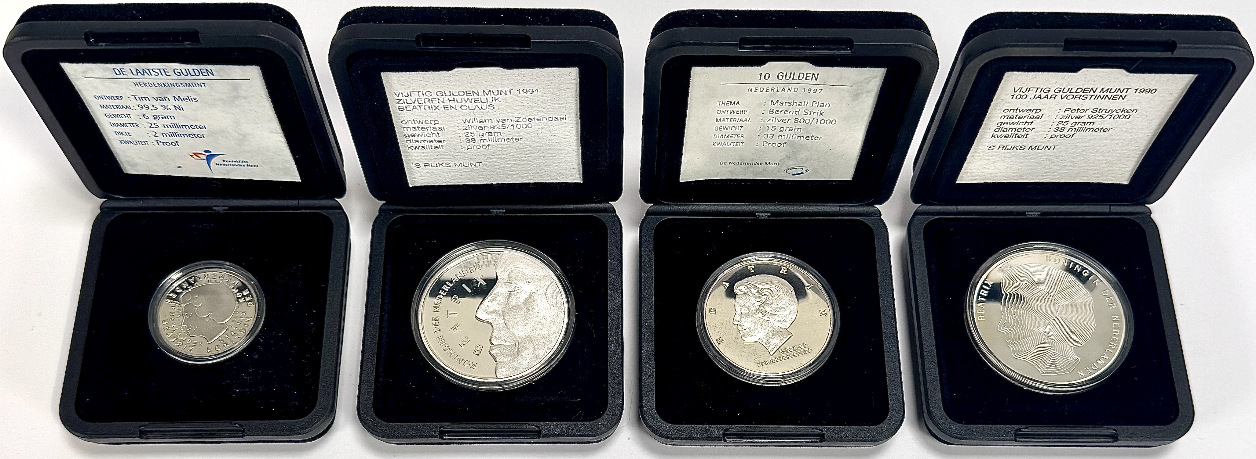 Vier Nederlandse proof munten in etui: 50 gulden 1990 (Peter Struycken), 50 gulden 1991 (Willem van Zoetendaal), 10 gulden 1997 (Berend Strik) en 1 gulden 2001 “De Laatste Gulden”. Twee keer zilver 925/1000, één keer zilver 800/1000 en één keer nikkel 99,5%; stempelslag. Thematische portretten en typografie; officiële Koninklijke Nederlandse Munt presentatie met specificatiekaartjes. Geïnteresseerd? Bezoek onze kijkdagen op 29, 30 of 31 augustus van 11:00 tot 17:00 uur! |