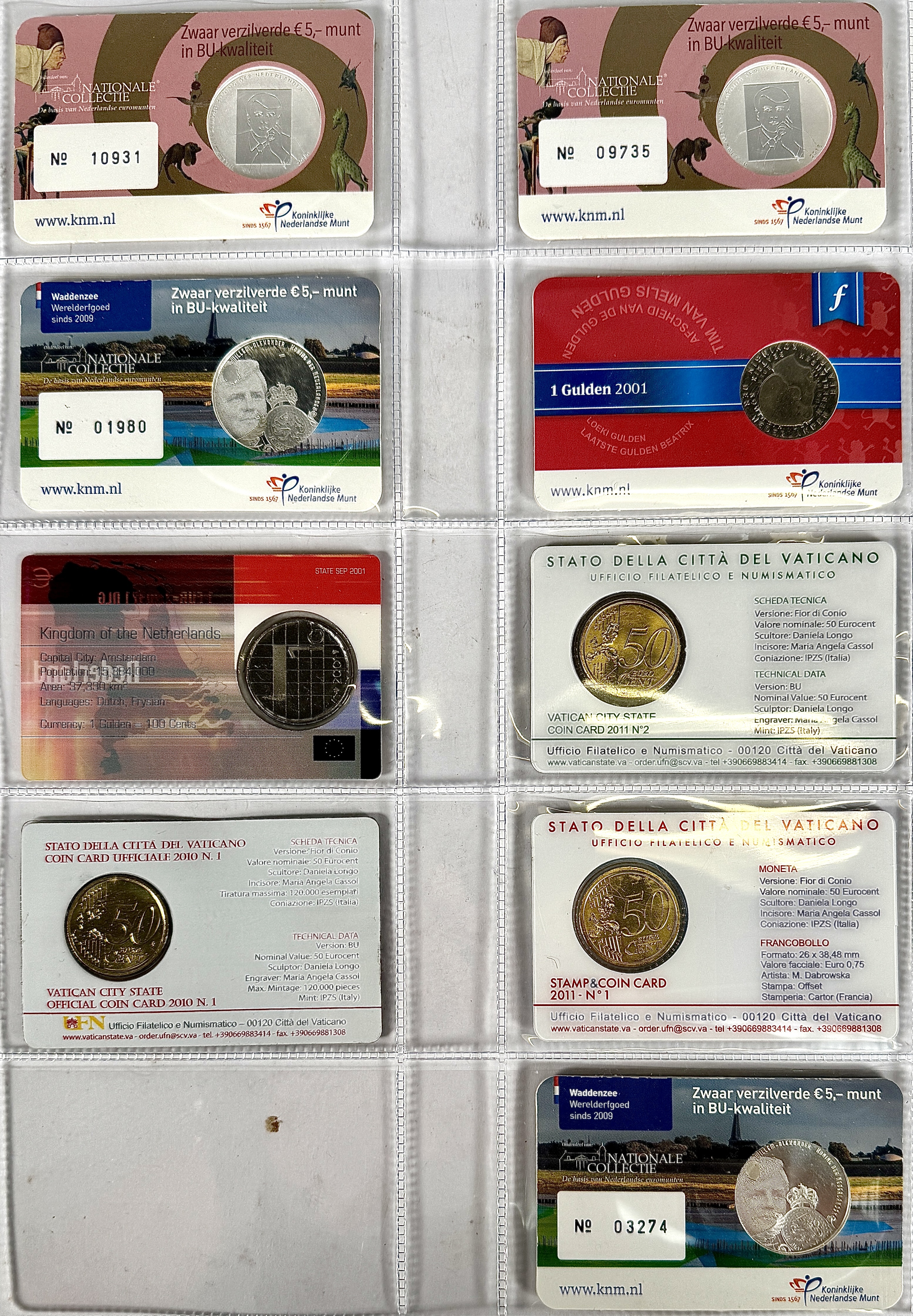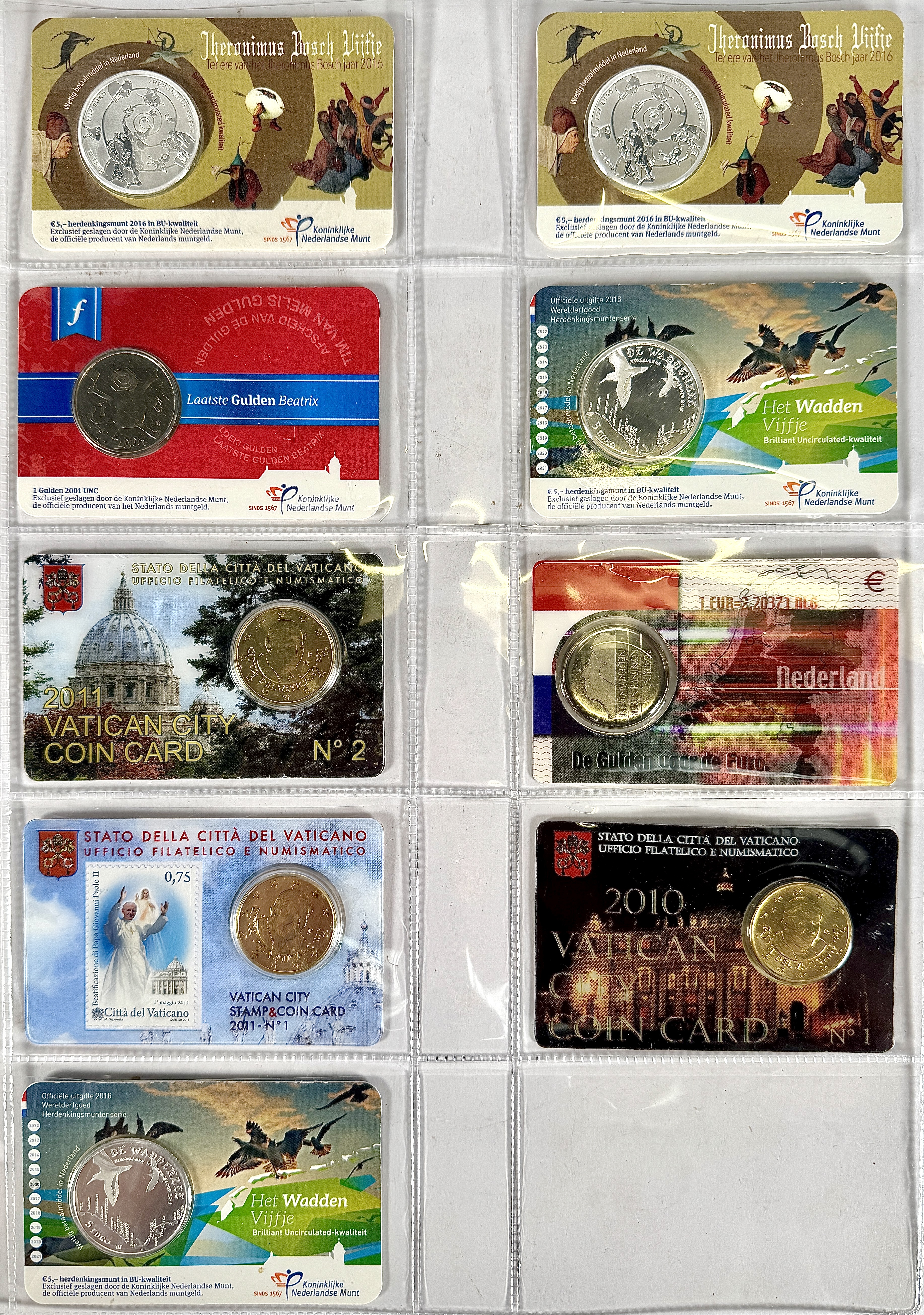 Verzameling van negen munten in hun originele verpakking, gedateerd tussen 2001 en 2016. De collectie omvat vier zwaar verzilverde munten van De Koninklijke Nederlandse Munt en diverse munten, waaronder de laatste gulden en een speciale uitgifte van Vaticaanstad. De munten zijn vervaardigd van verschillende materialen zoals koper en zwaar verzilverd koper. De munten zelf beoordelen? Je bent welkom op onze kijkdagen op 29, 30 en 31 augustus! |
