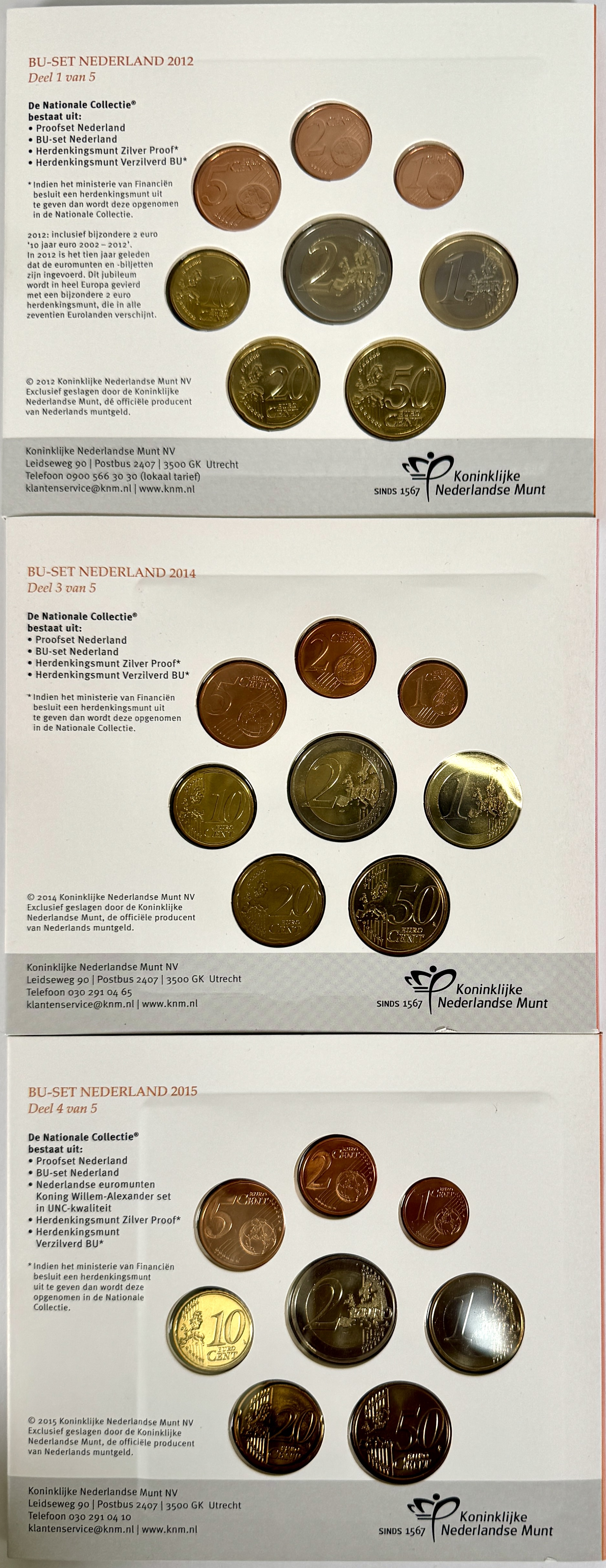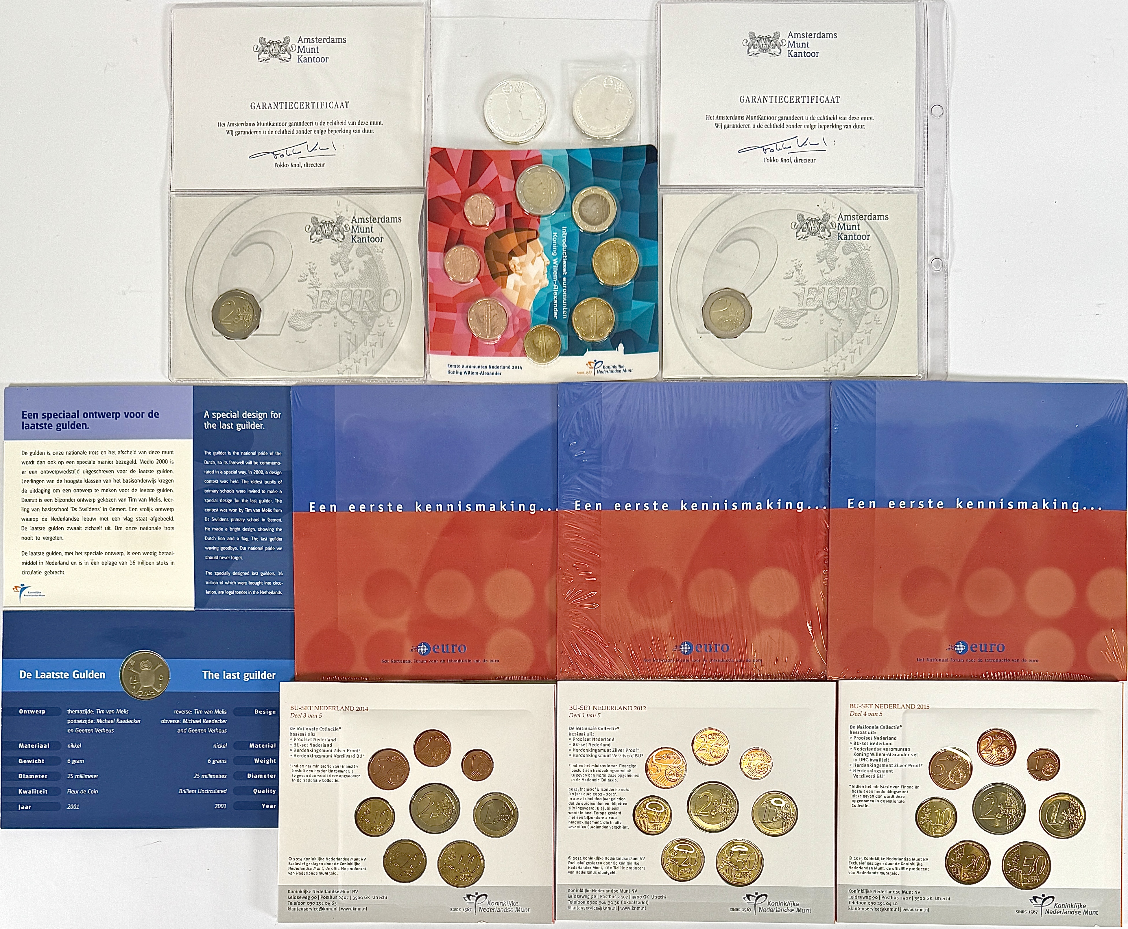 Een verzameling van Nederlandse munten, waaronder de laatste gulden en diverse euromunten in speciale verpakkingen. De sets zijn uitgegeven door de Koninklijke Nederlandse Munt en het Amsterdams Muntkantoor en dateren uit de periode 2001 tot 2016. De munten zijn vervaardigd uit diverse metalen en zijn geslagen met een muntslag. De sets bevatten onder meer de "Nationale Collectie" uit 2014, 2015 en 2016. Dit is een verzameling van de overgang van de gulden naar de euro. Klaar om te bieden? Registreer je nu en doe mee aan de veiling! |