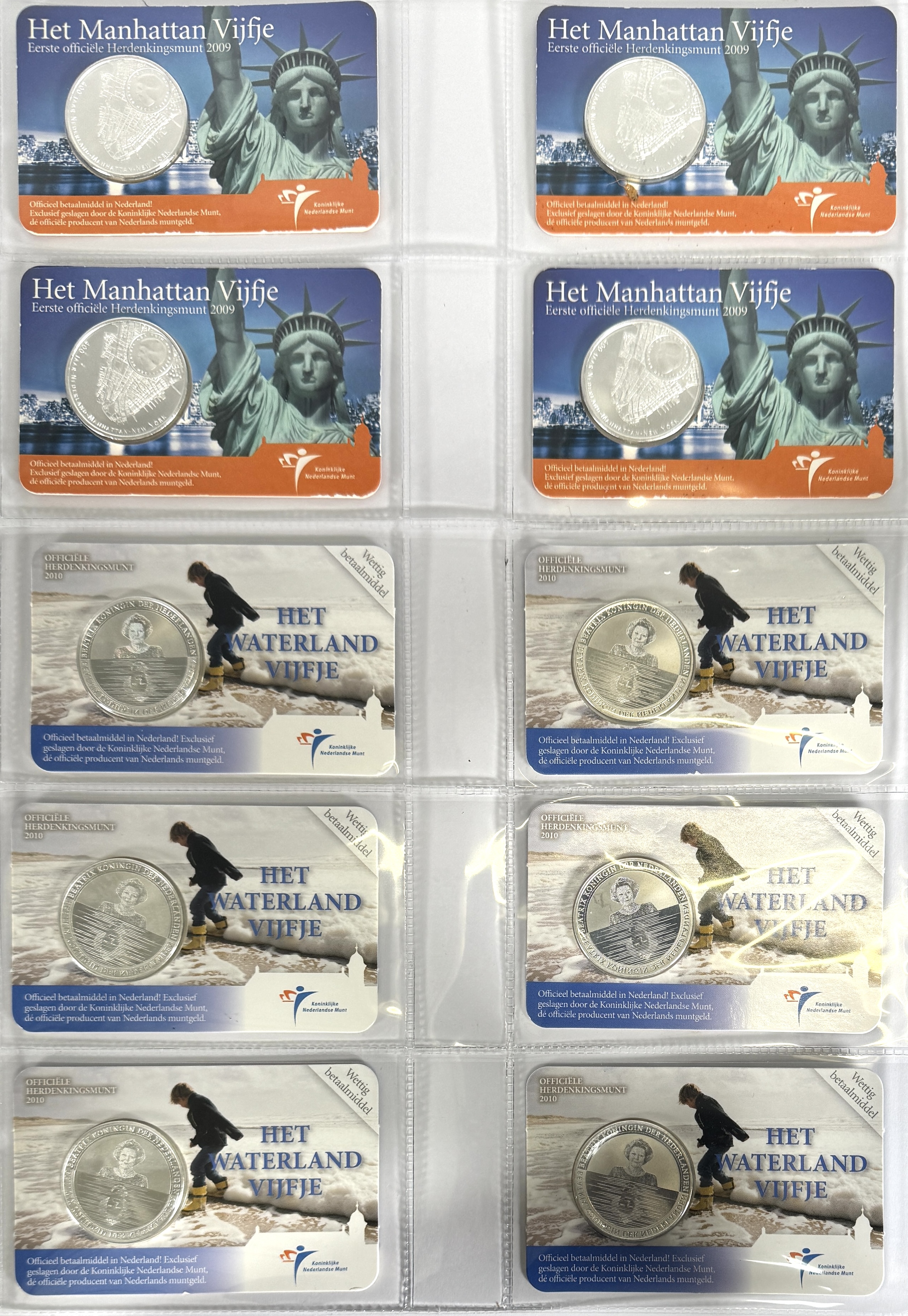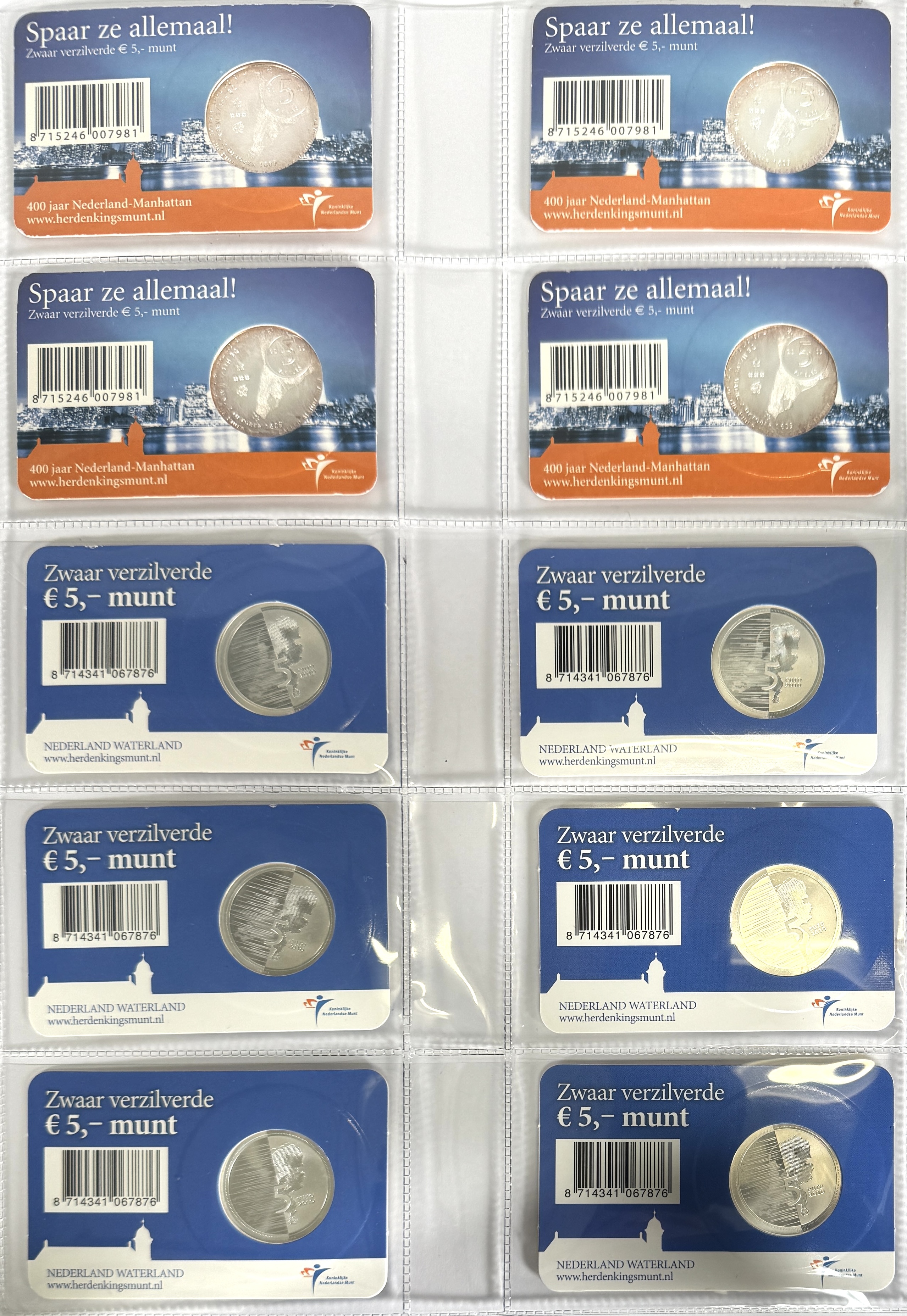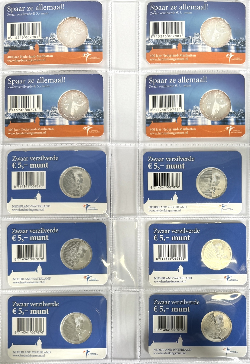 Tien Nederlandse zwaar verzilverde herdenkingsmunten van €5,-, uitgegeven door de Koninklijke Nederlandse Munt in 2009 en 2010. Uitgevoerd in verzilverd koper/nikkel met stempelslag. Thema’s: 400 jaar Nederland–Manhattan en Nederland Waterland. Alle munten in originele coincards, voorzien van thematische vormgeving zoals skyline, Vrijheidsbeeld en watermotieven met portret van koningin Beatrix. .