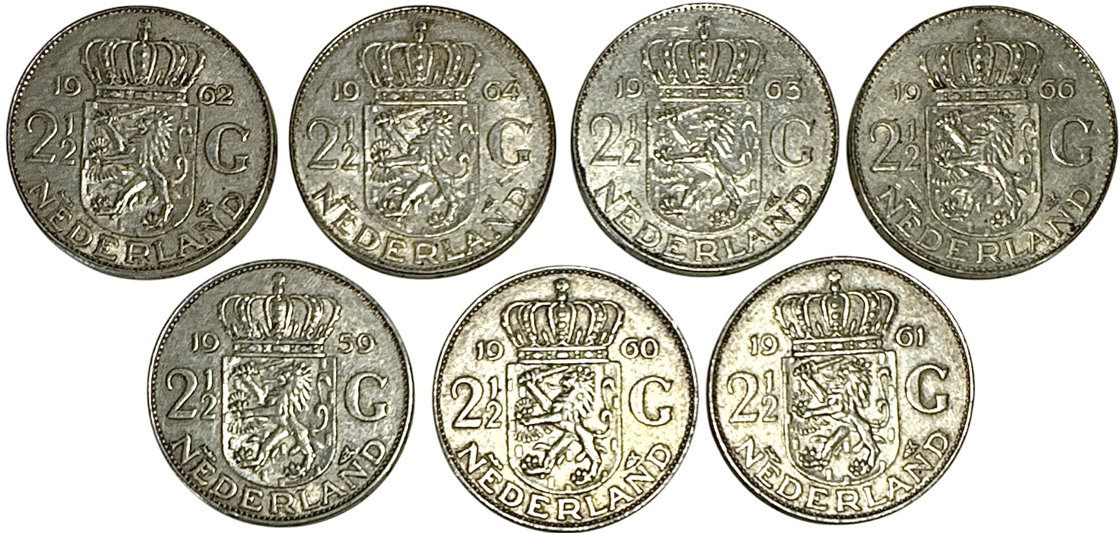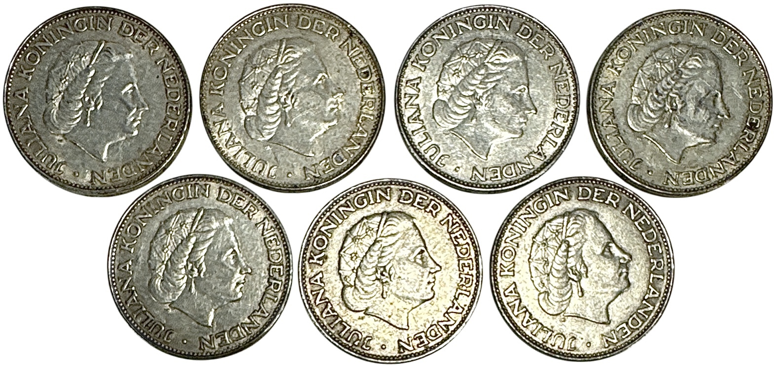 Zeven zilveren rijksdaalders uit Nederland, geslagen onder koningin Juliana (1909–2004), gedateerd 1959, 1960, 1961, 1962, 1964, 1965 en 1966. Voorzijde met beeltenis en omschrift “Juliana Koningin der Nederlanden”, keerzijde met wapen, kroon en waarde aanduiding 2½ gulden. Uitgevoerd in zilver (720/1000) met munttechniek door slag. Deze munten zelf beoordelen? Je bent welkom op onze kijkdagen op 29, 30 en 31 augustus! |