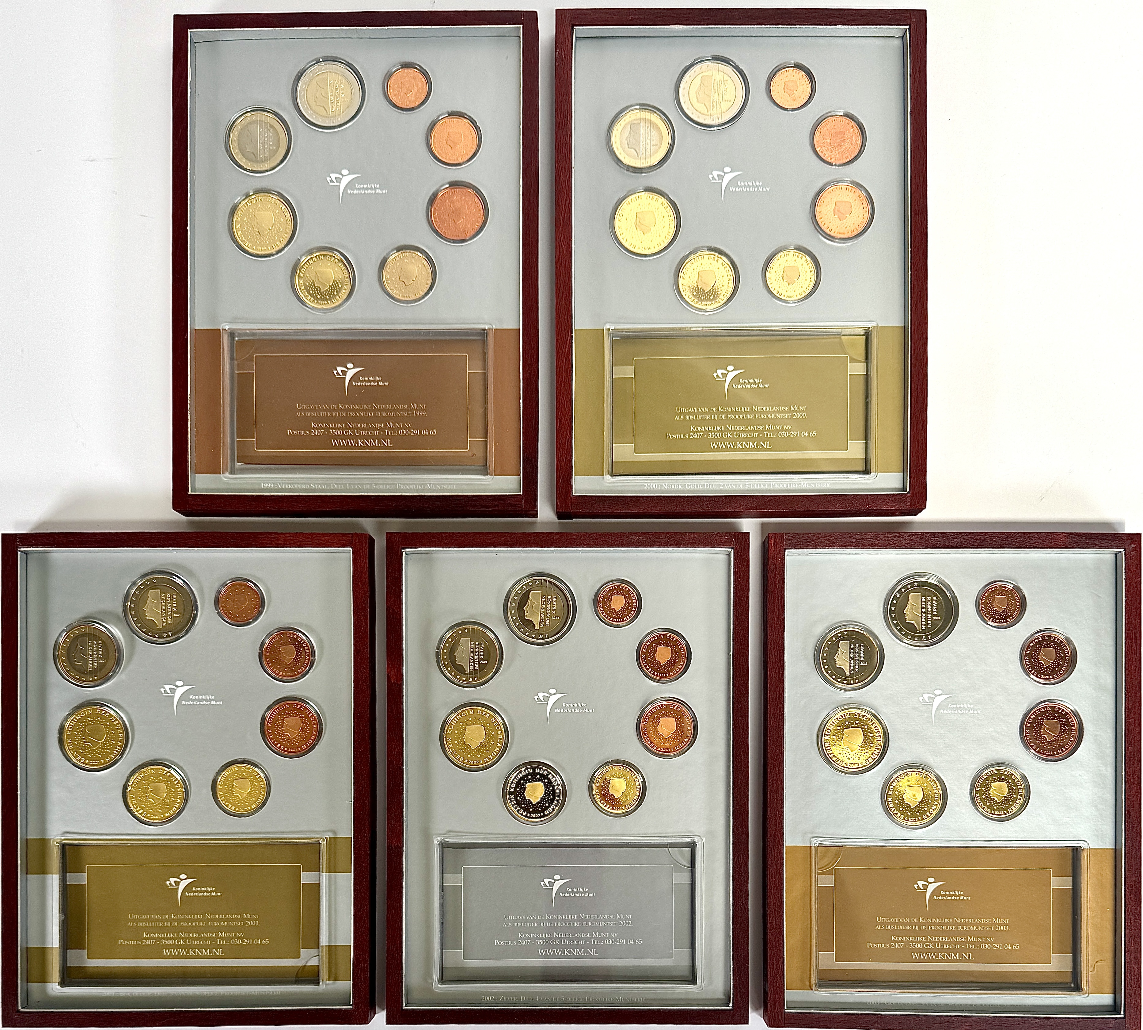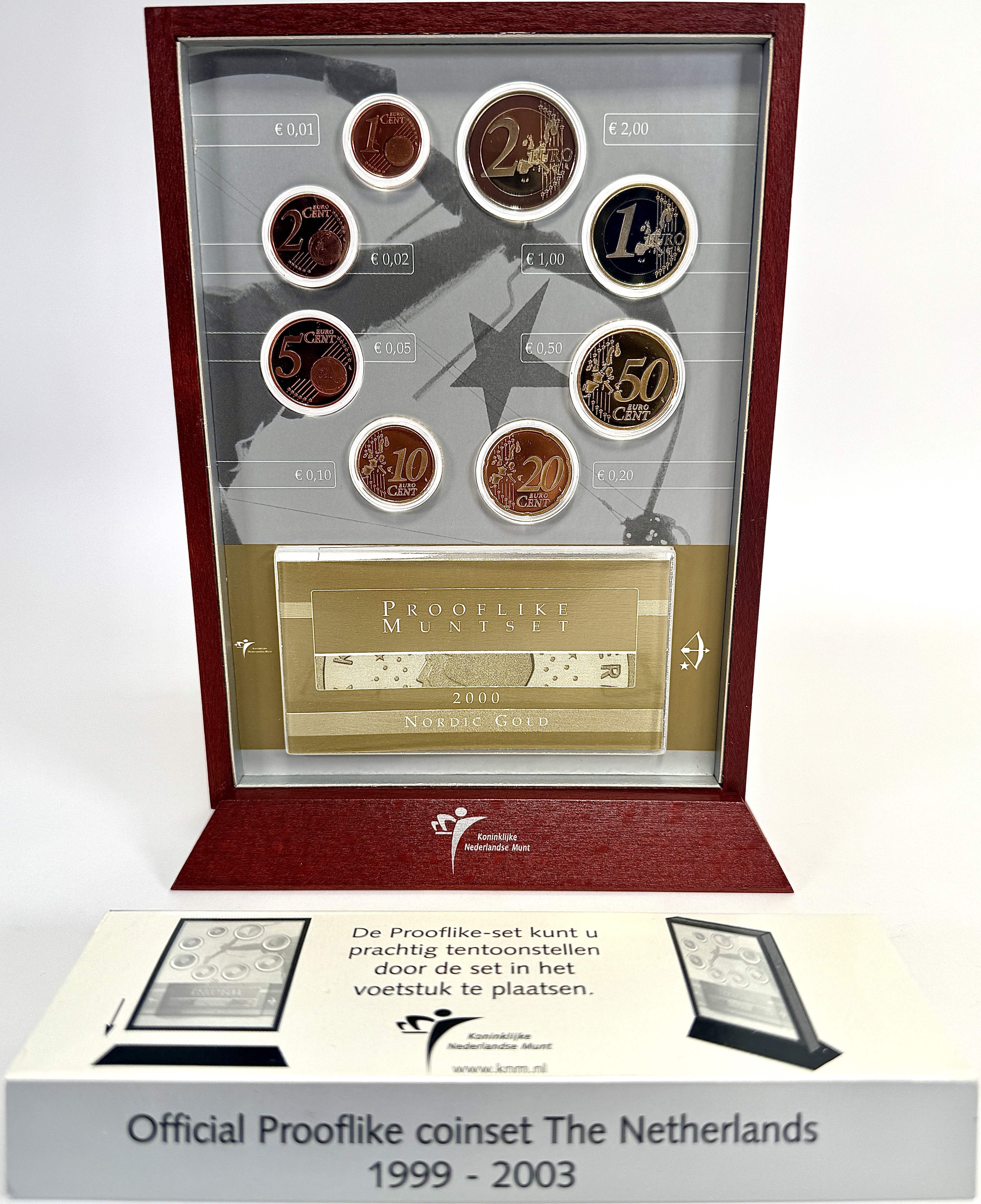 Vijf prooflike muntsets, Koninklijke Nederlandse Munt, periode 1999–2003. De sets bevatten volledige jaargangen in proofkwaliteit. Geplaatst in luxe presentatiekistjes met certificaat en inclusief twee voetstukken en een standaard. Officiële uitgaven van de Koninklijke Nederlandse Munt, gericht op verzamelaars van Nederlandse en euro gerelateerde muntseries. Geïnteresseerd? Bezoek onze kijkdagen op 29, 30 of 31 augustus van 11:00 tot 17:00 uur! |