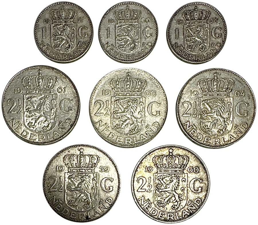 Set van 8 zilveren Nederlandse munten, ontworpen door Piet Esser (1914–2004), geslagen in de periode 1955–1966. Het betreft 5 munten van 2,50 gulden en 3 munten van 1 gulden, vervaardigd in zilver (640/1000) met stempeldruktechniek. Voorzijde met portret van koningin Juliana, keerzijde met het gekroonde Nederlandse wapen, waarde aanduiding en landsnaam. Voeg deze munten toe aan je verzameling en doe een bod! |