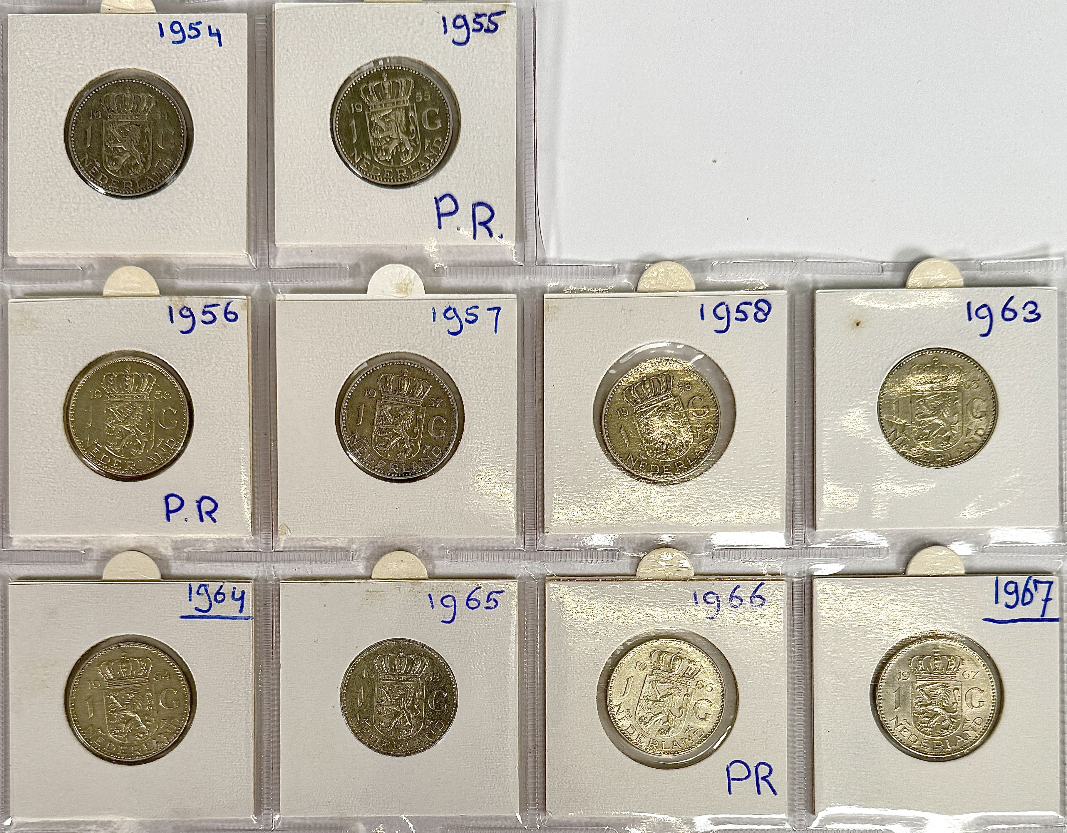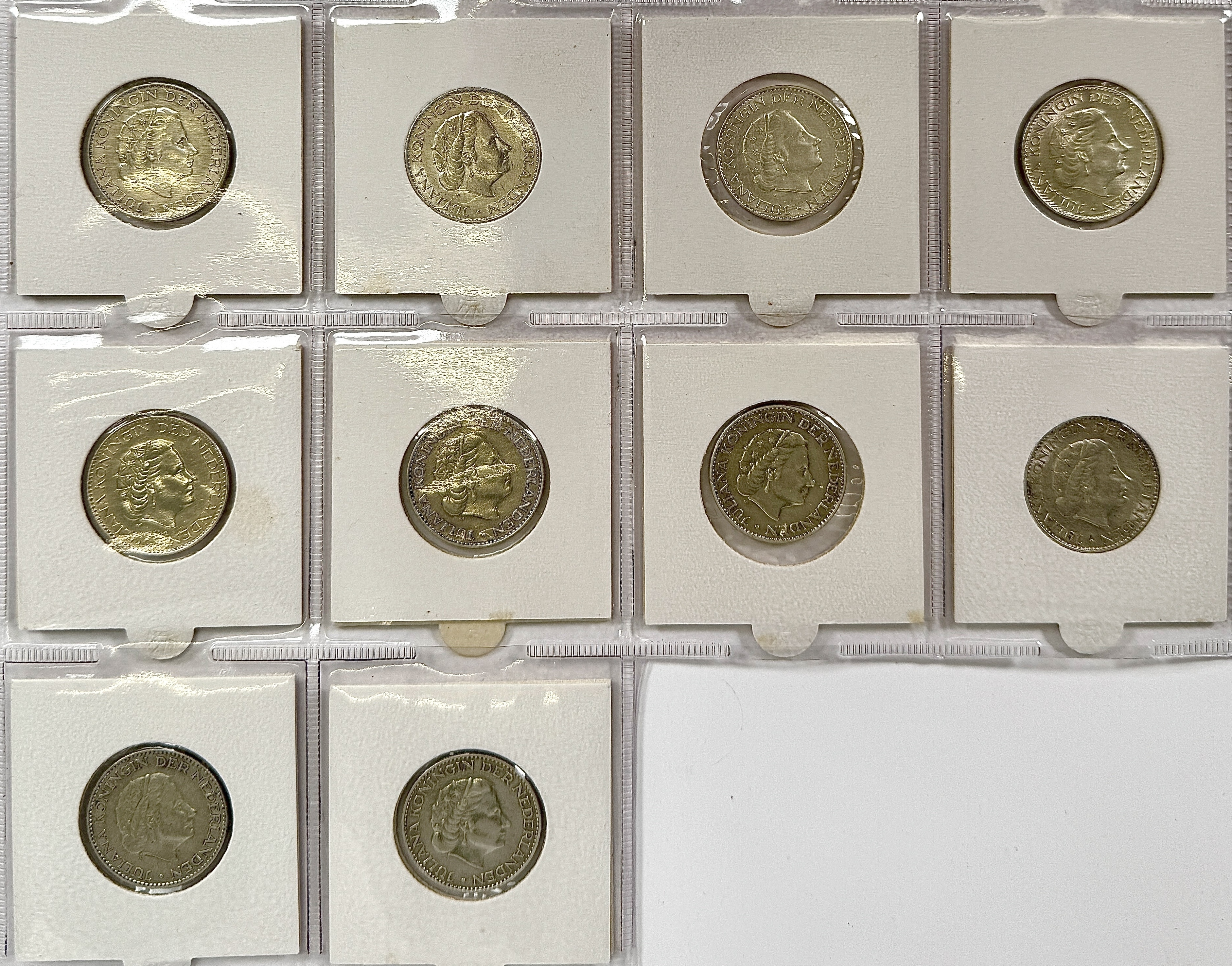 Tien Nederlandse guldens met portret van Juliana, in klassieke naoorlogse stijl. Gedateerd 1954, 1955, 1956, 1957, 1958, 1963, 1964, 1965, 1966 en 1967; het jaartal staat aan weerszijden van de kroon op de keerzijde. Uitgevoerd in zilver (640/1000?, machinaal geslagen. Voorzijde met omschrift “JULIANA KONINGIN DER NEDERLANDEN”, keerzijde met gekroond rijkswapen en waarde 1 G. Geplaatst in kartonnen muntdragers. Registreer nu en bied eenvoudig online mee op deze munten! |