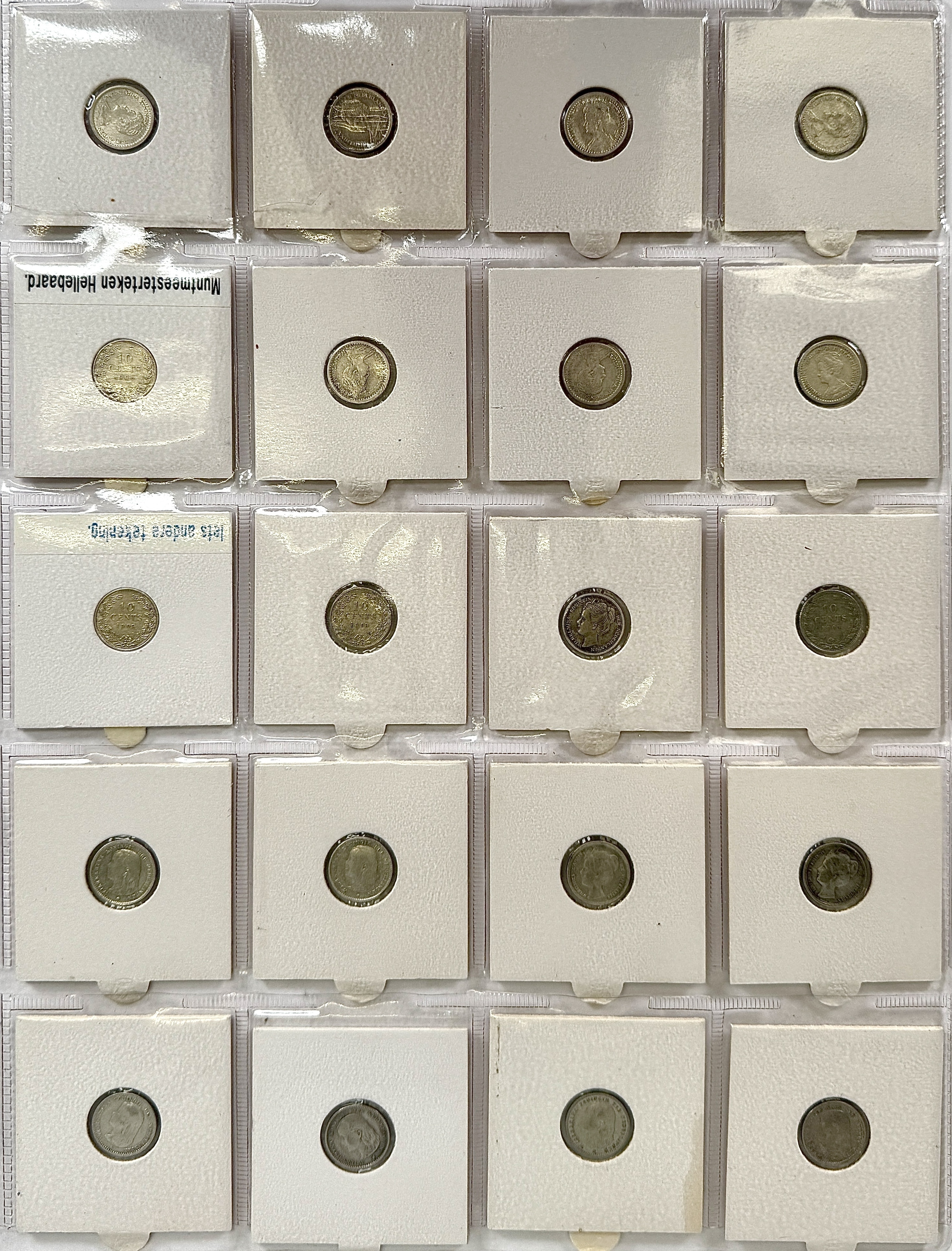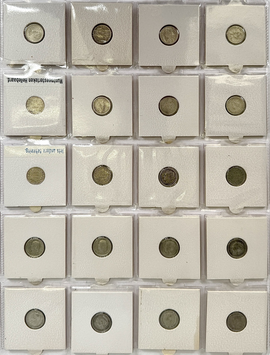 Set van 20 Nederlandse 10 cent munten in neoklassieke muntstijl, geslagen door de Koninklijke Nederlandse Munt, Utrecht. Datering 1892–1925, zilver (gehalte 0,640), machinaal geslagen. Voorzijde met portret van koningin Wilhelmina en randschrift; keerzijde met kroon boven 10 C in krans, jaartal onder. Geplaatst in houders met aantekeningen jaar en kwaliteit. Wil je dit munten in het echt bekijken? Kom naar de kijkdagen op 29, 30 en 31 augustus! |