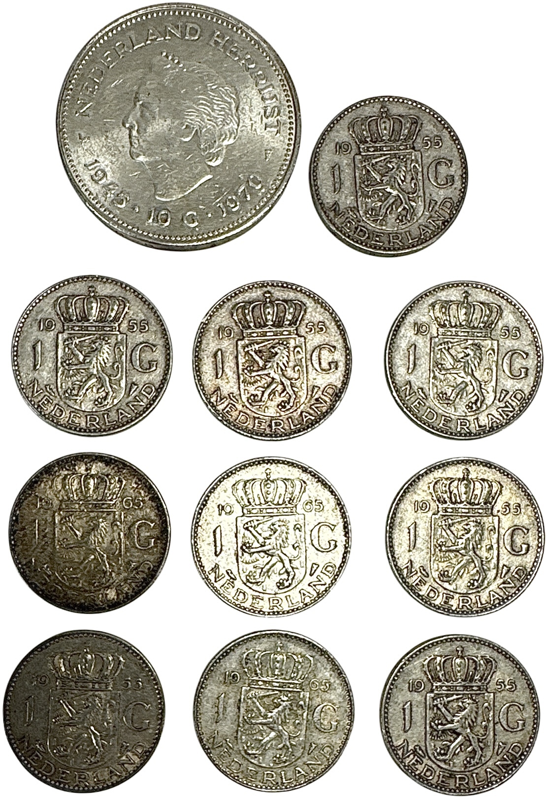 Zilveren 10 gulden 1970 en guldens 1955/1965, Nederland