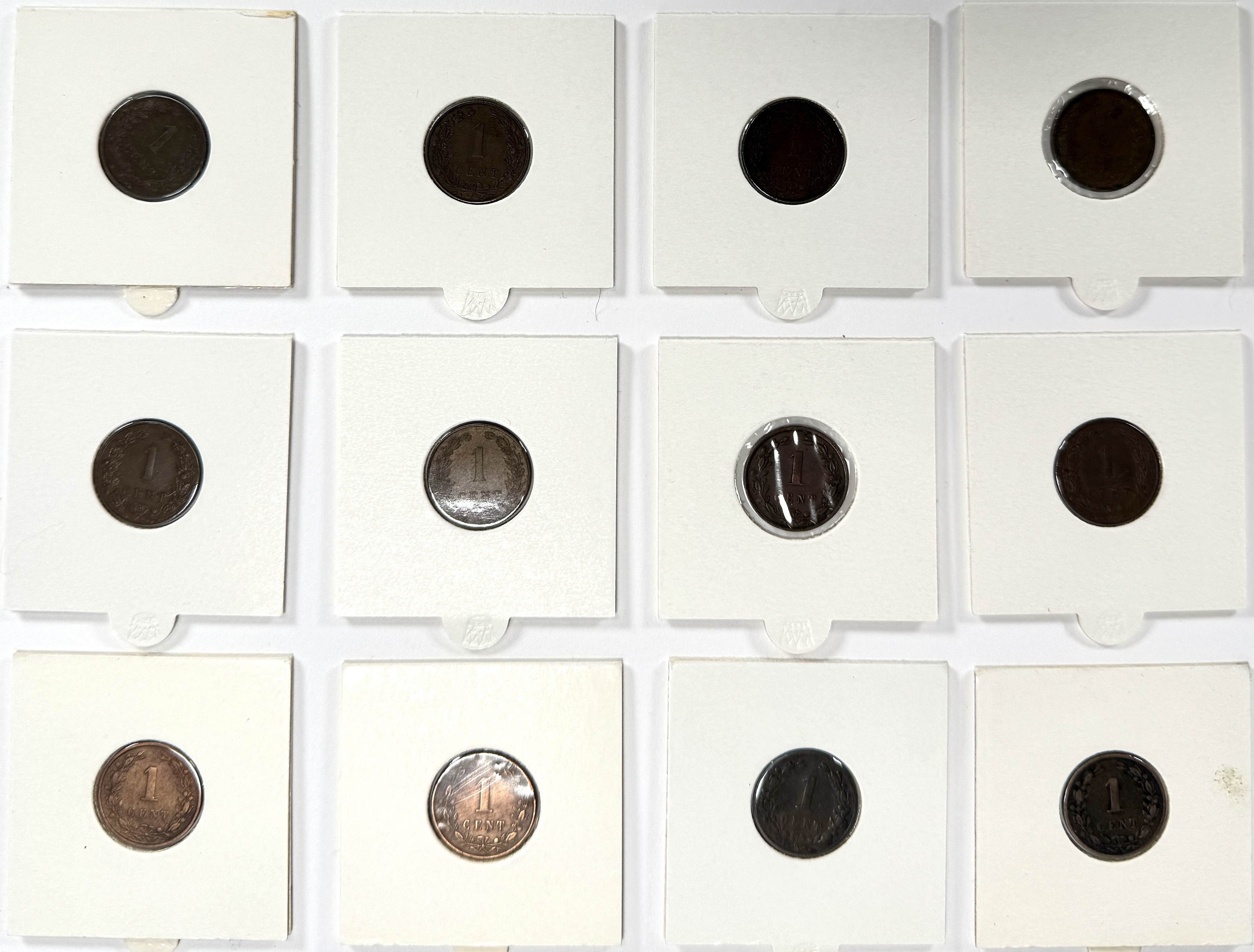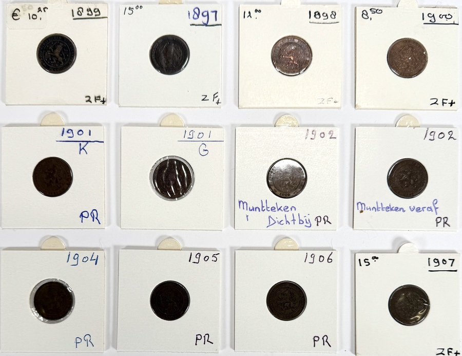 Twaalf Nederlandse 1 cent munten, geslagen door de Rijksmunt Utrecht. Jaartallen: 1889, 1897–1907 met varianten 1901 en 1902 (muntteken dichtbij/veraf). Brons, stempelslag. Keerzijde met krans en ‘1 CENT’; voorzijde met portret van Willem III (1889) en jonge Wilhelmina. Kralenrand en gladde rand; caduceus als muntteken naast het jaartal; eind 19e en begin 20e-eeuwse circulatiemunten. Voeg deze munten toe aan je verzameling en doe een bod! |