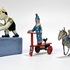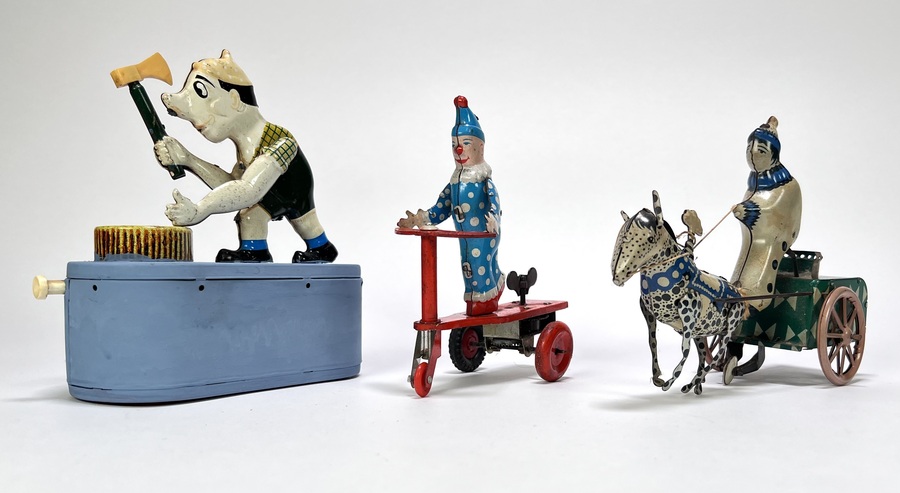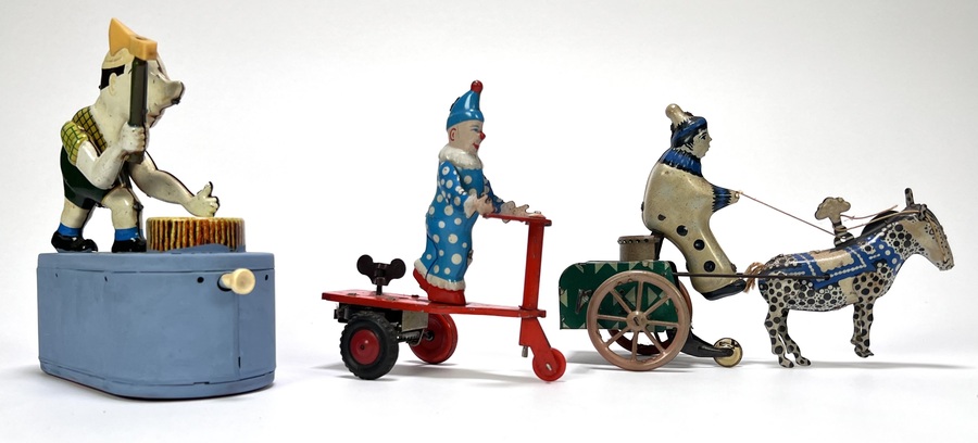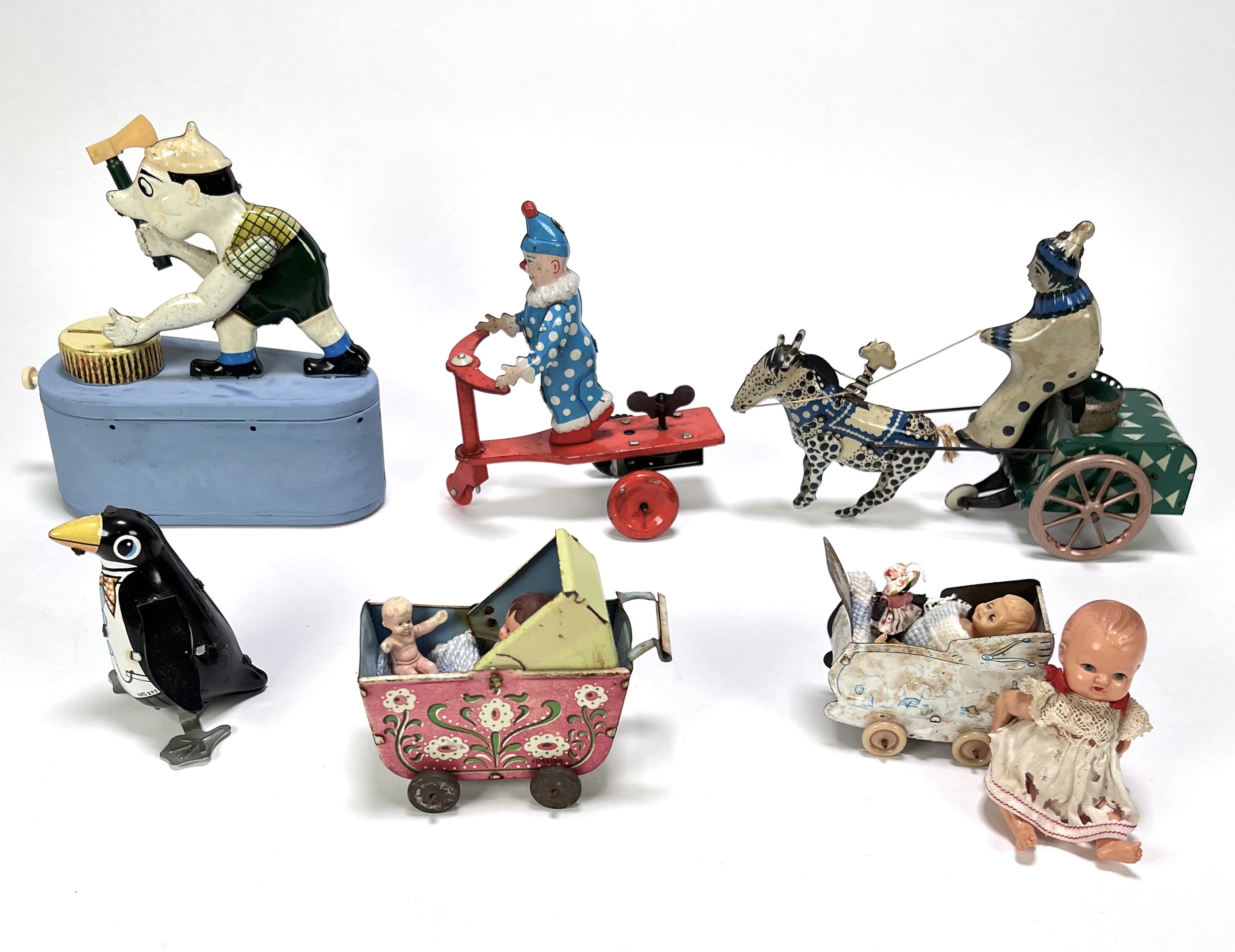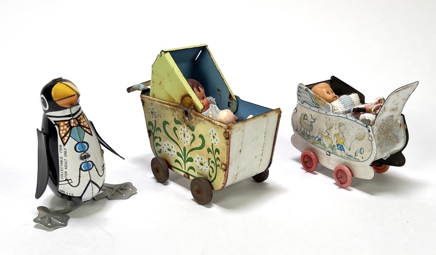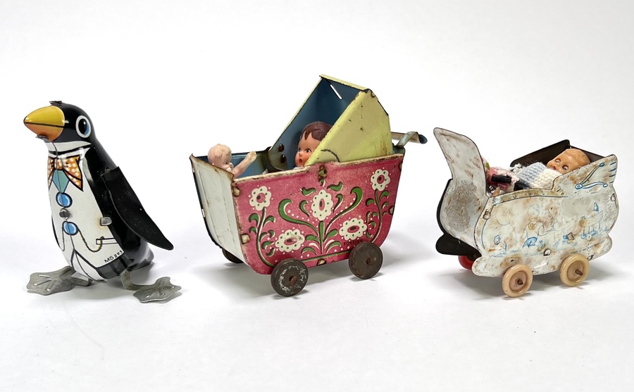 Verzameling blikken speelgoed in lithografische stijl, omstreeks 1930–1960. Diverse fabrikanten; onderdelen gemerkt ‘MS 295’ en ‘FOREIGN’. Uitgevoerd in geperst en gelithografeerd blik, met veermechaniek en sleutelaandrijving; popjes van kunststof/celluloid. Verzameling bestaat uit een pinguïn, clown op step, houthakker-automaat, ezel met wagen en twee kinderwagens. Markeringen en motieven duidelijk zichtbaar; gevarieerde mix van thema’s. Zeker zijn van deelname? Plaats vanaf 22 augustus een schriftelijk bod. |