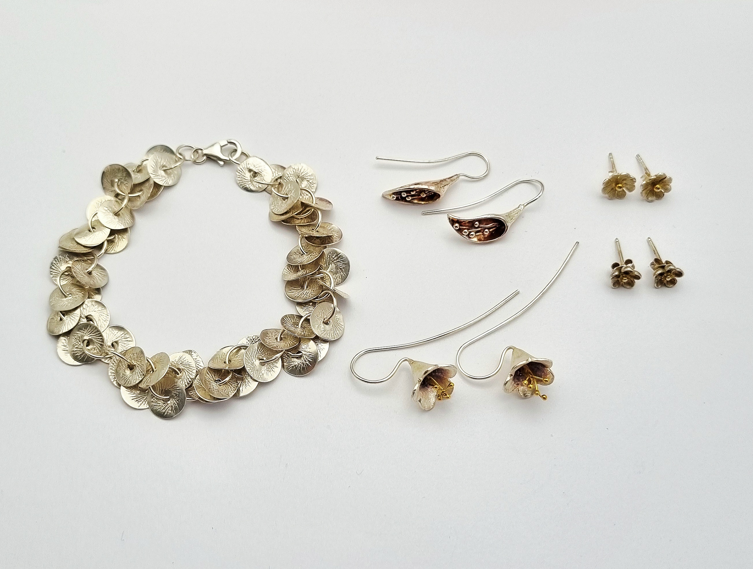 Sieraden set uit de 21e eeuw in hedendaagse stijl, bestaande uit armband en vier paar oorbellen. Gemaakt van sterling zilver (gemerkt 925), deels met vergulde accenten. De set omvat florale vormen en fijne reliëfbewerkingen. Inclusief bloemvormige oorstekers, kelkvormige oorhangers en decoratieve schijfarmband. Eerst deze sieraden zien voordat je biedt? Bezoek onze kijkdagen op 29, 30 en 31 augustus van 11:00 tot 17:00 uur |