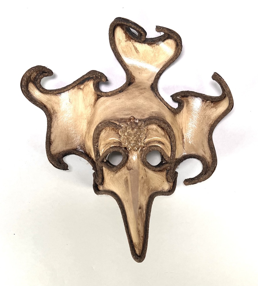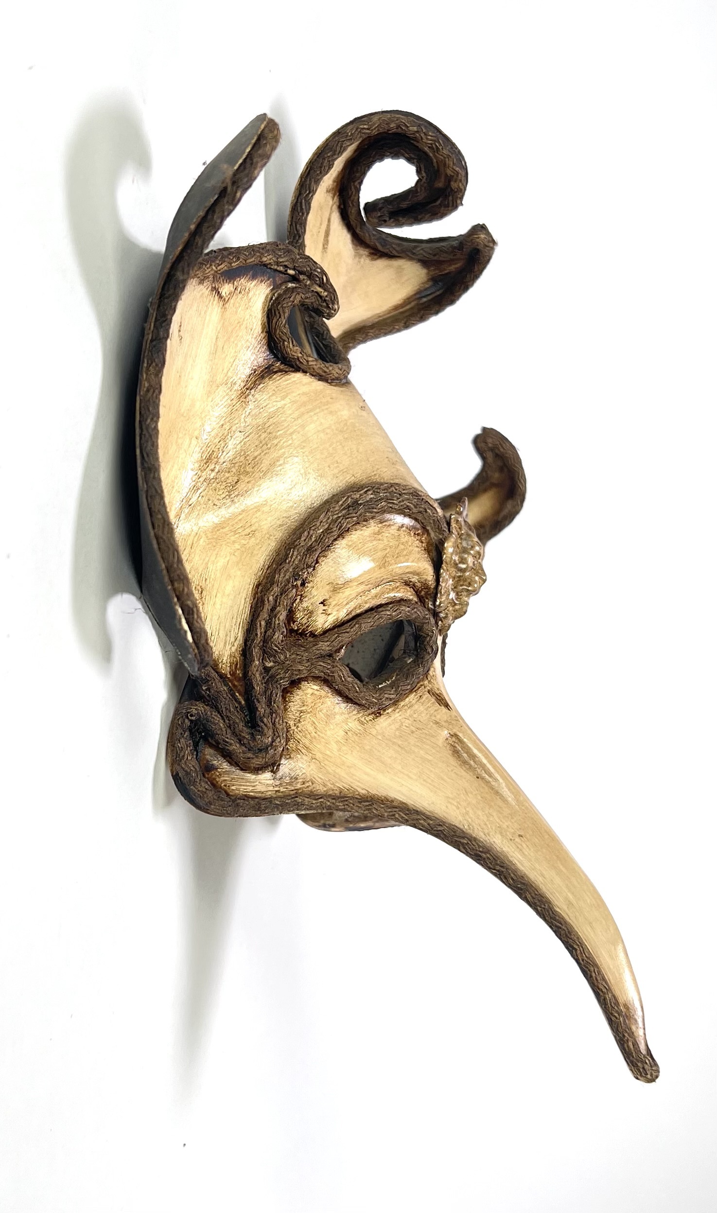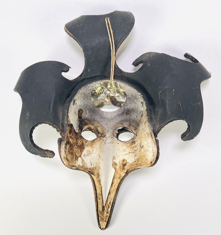 Venetiaans masker in carnavalsstijl vervaardigd door Bertoldi Manuele (1957), datering eind 20e tot begin 21e eeuw, afkomstig uit Venetië. Uitgevoerd in papier-maché met handbeschilderde en gepatineerde afwerking. Het masker heeft een lange neus, gekrulde vleugelvormige randen en een druiventrosreliëf. Aan de binnenzijde bevindt zich een etiket met opschrift Bella Venezia, Produzione Originale. Geïnteresseerd? Bezoek onze kijkdagen voor een persoonlijke bezichtiging! |