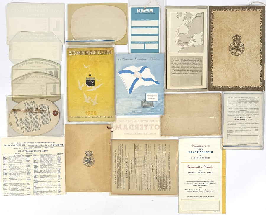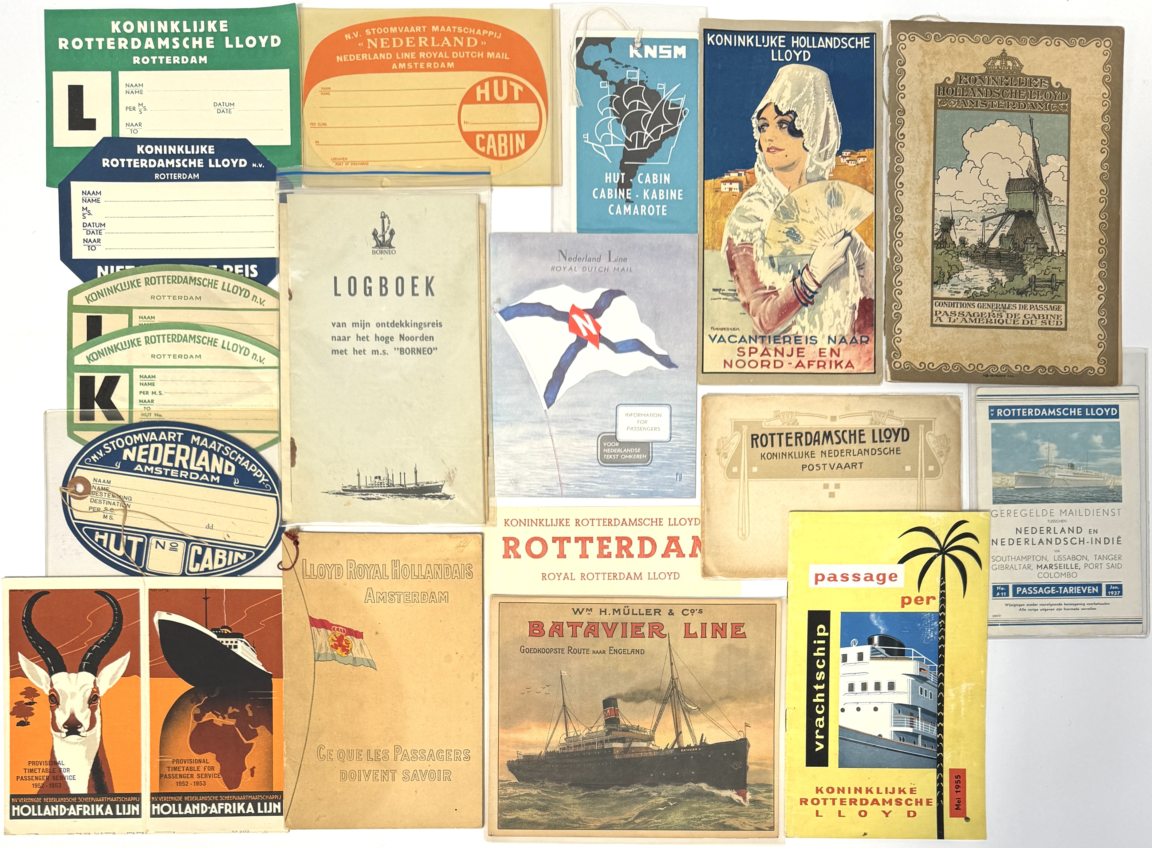 Scheepvaart memorabilia uit Nederland, omstreeks 1920 tot 1960. Bestaande uit kofferlabels, passagiers tarieven, brochures, route- en reisprogramma’s, logboekje en folders van KRL, KNSM, Koninklijke Hollandsche Lloyd, Holland-Afrika Lijn en Batavier Line. Grafische Art Deco en naoorlogse vormgeving, meertalig en rijk geïllustreerd. Kom langs tijdens de kijkdagen (29 t/m 31 augustus) en ontdek deze memorabilia stoomvaartmaatschappijen zelf! |