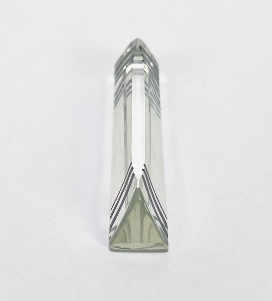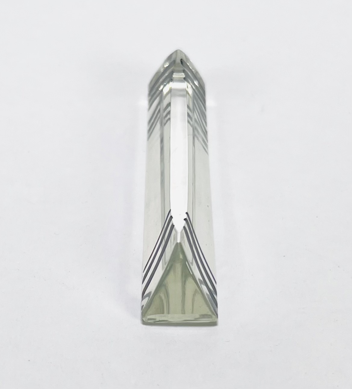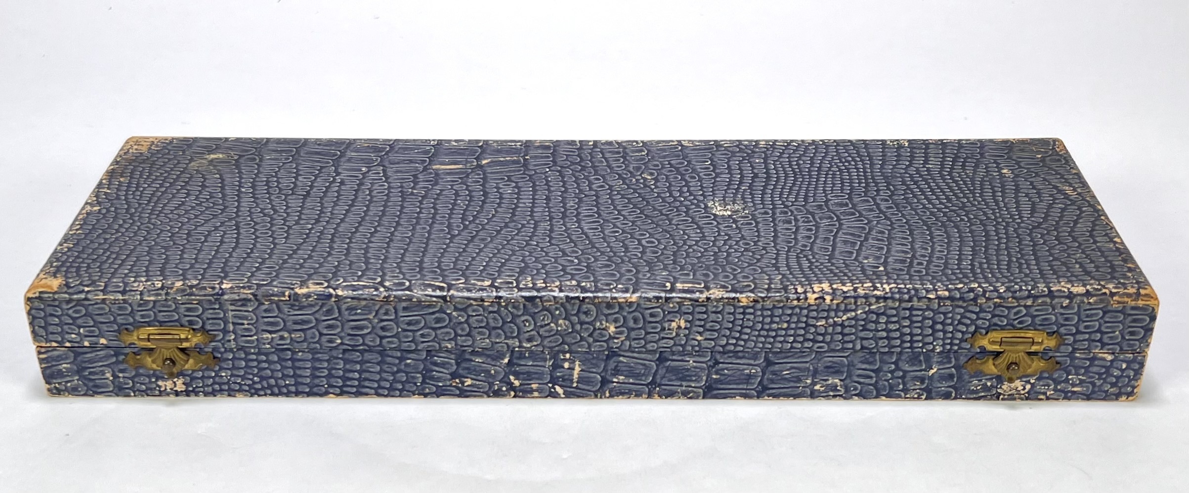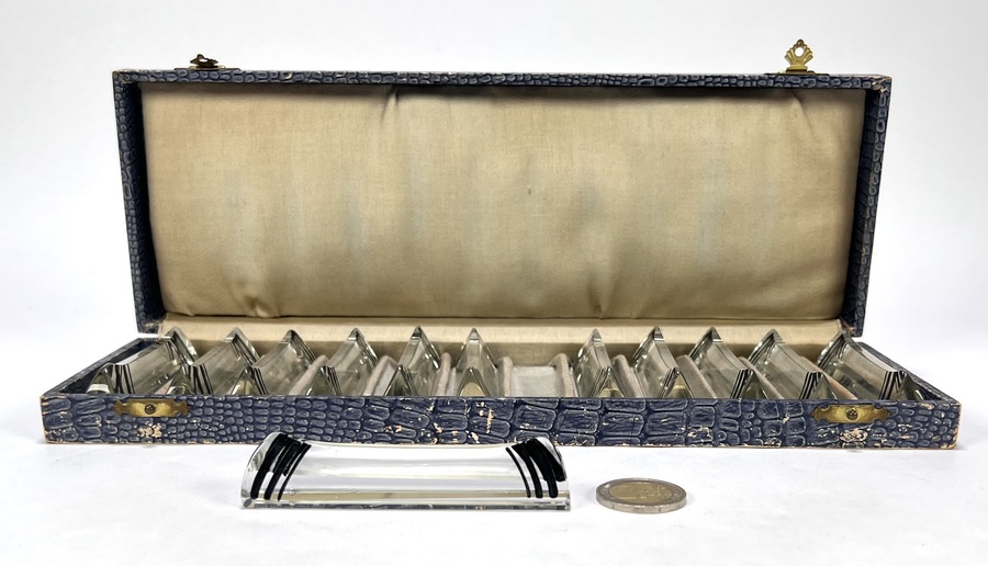 Set van twaalf massief kristallen messenleggers uit de vroege tot midden twintigste eeuw, rechthoekig met licht gebogen bovenzijde en drie zwarte lijnen aan beide uiteinden. In originele blauwe doos met crème textielbekleding en messingkleurige sluitingen, voorzien van afzonderlijke sleuven voor de messenleggers. Geïnteresseerd? Bezoek onze kijkdagen op 29, 30 of 31 augustus van 11:00 tot 17:00 uur! |