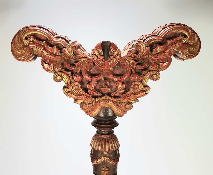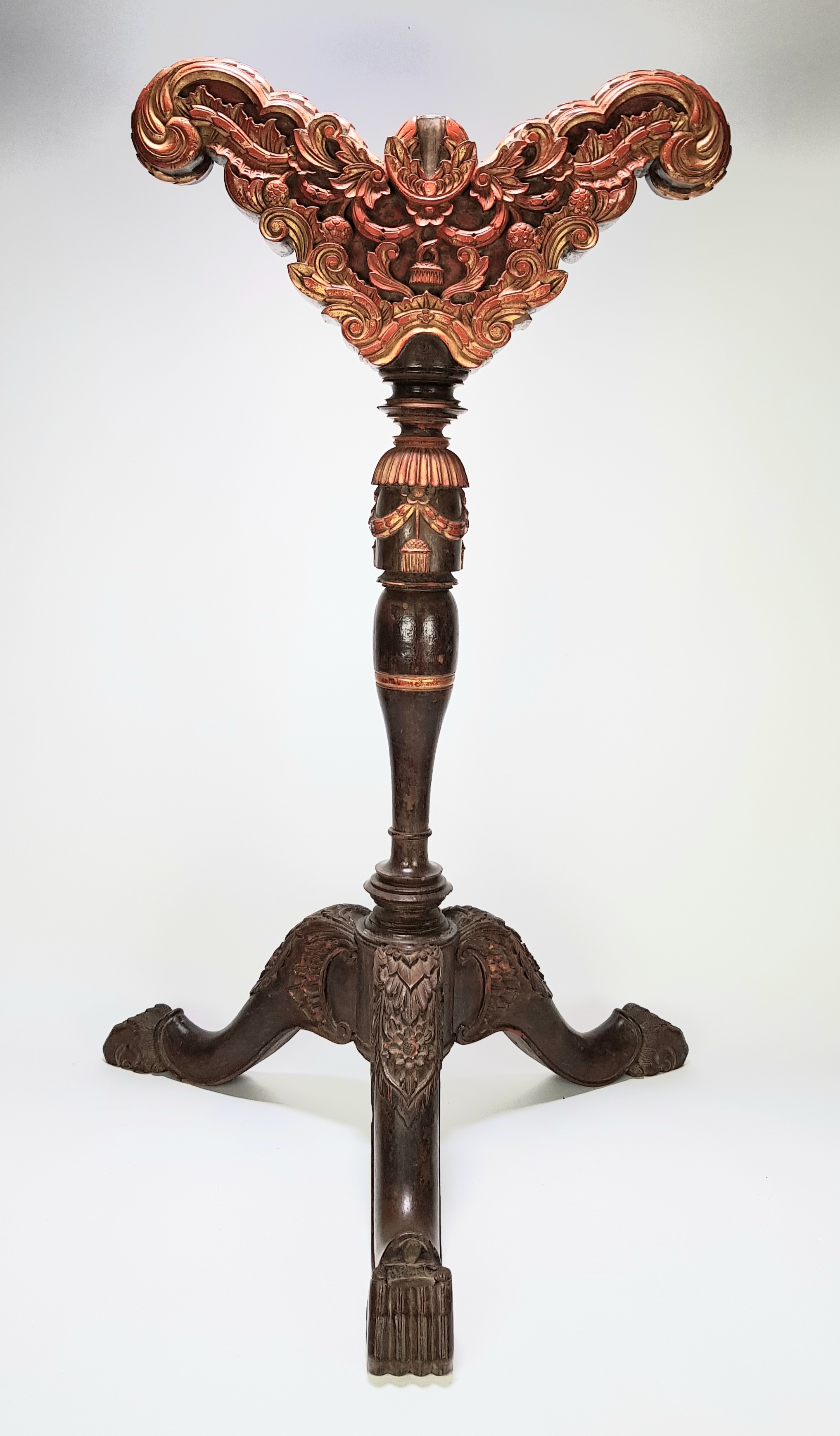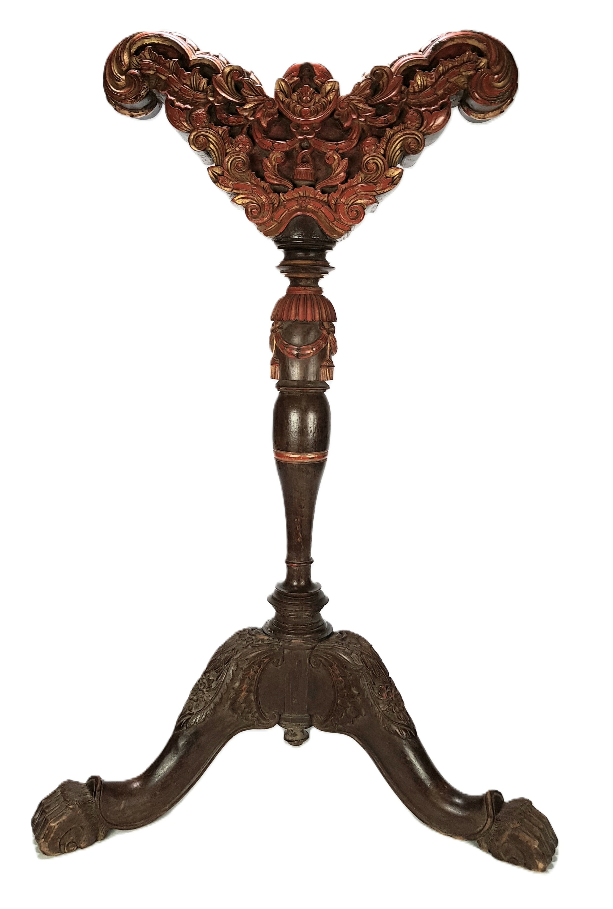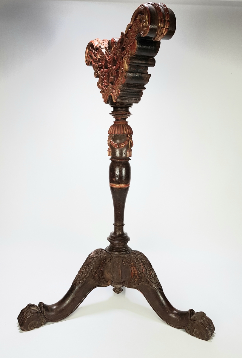 Neorococo gesneden en gepolychromeerde houten muziekstandaard, vervaardigd einde 19e eeuw. De standaard toont een driedelige klauwvoet, acanthusdecoraties, festoenen en een rijk versierde vleugelvormige bovenzijde in rood en goud. Handmatig bewerkt in diep reliëf met nadruk op symmetrische en florale motieven. Kom langs tijdens de kijkdagen (29 t/m 31 augustus) en ontdek deze muziek instrument standaard zelf! |