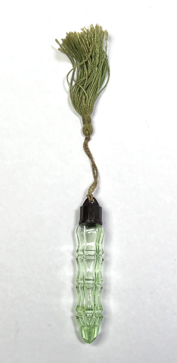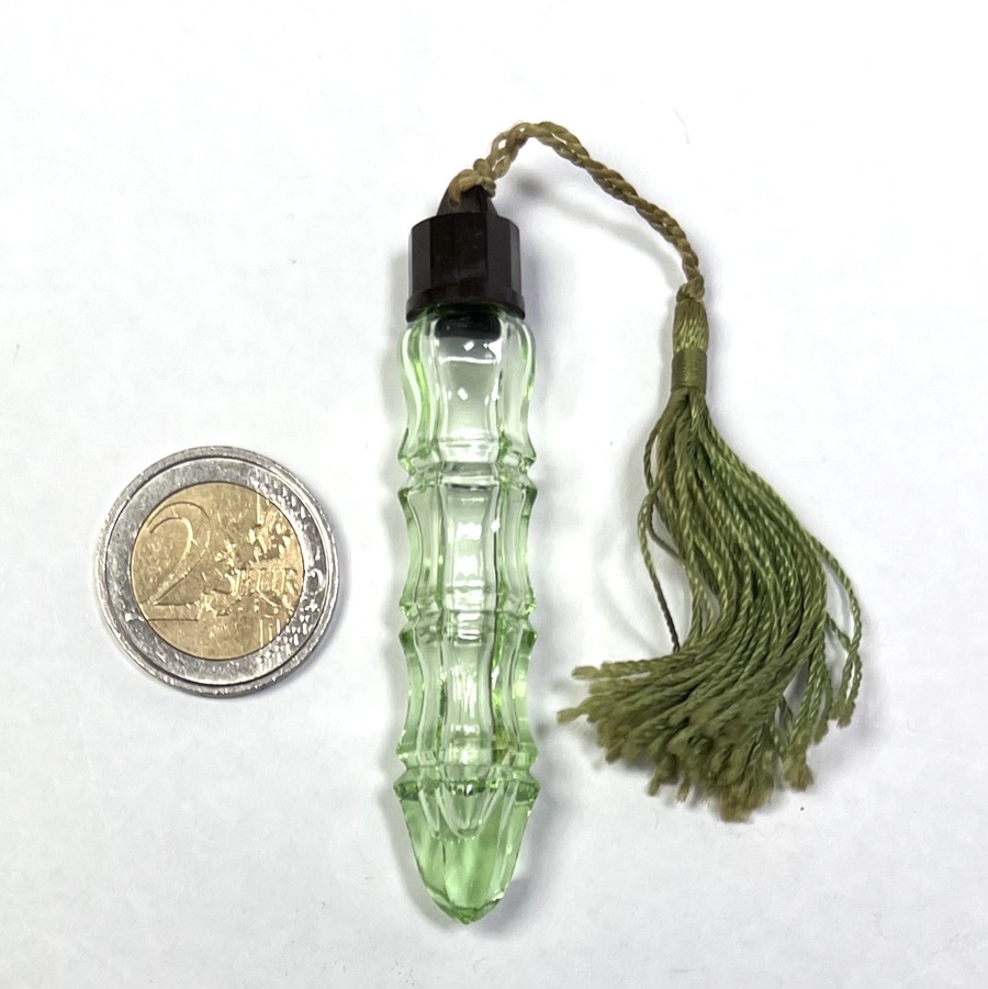 Art Deco groen kristallen parfumflesje met bakelieten schroefdop, vervaardigd circa 1920–1930. Bevestigd aan een gevlochten koord met groene kwast. Dit parfumflesje combineert functionaliteit met decoratief glasontwerp uit de vroege 20e eeuw. Zeker zijn van deelname? Plaats vanaf 22 augustus een schriftelijk bod online! |