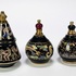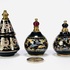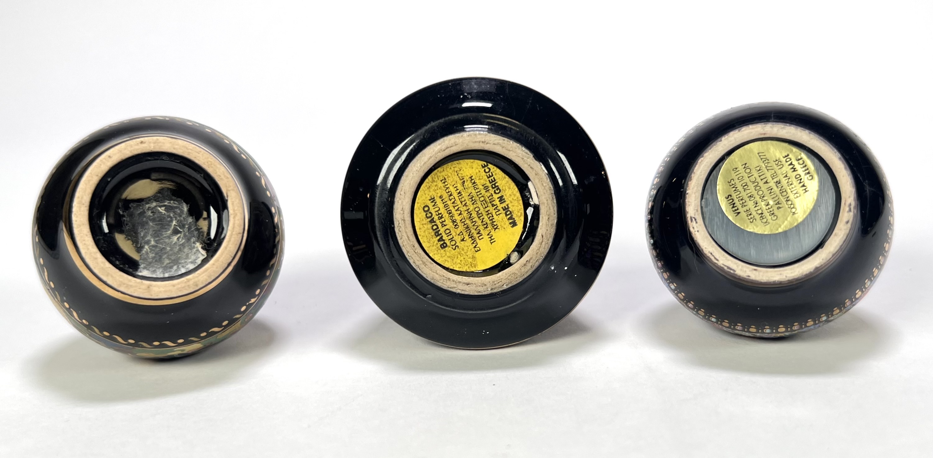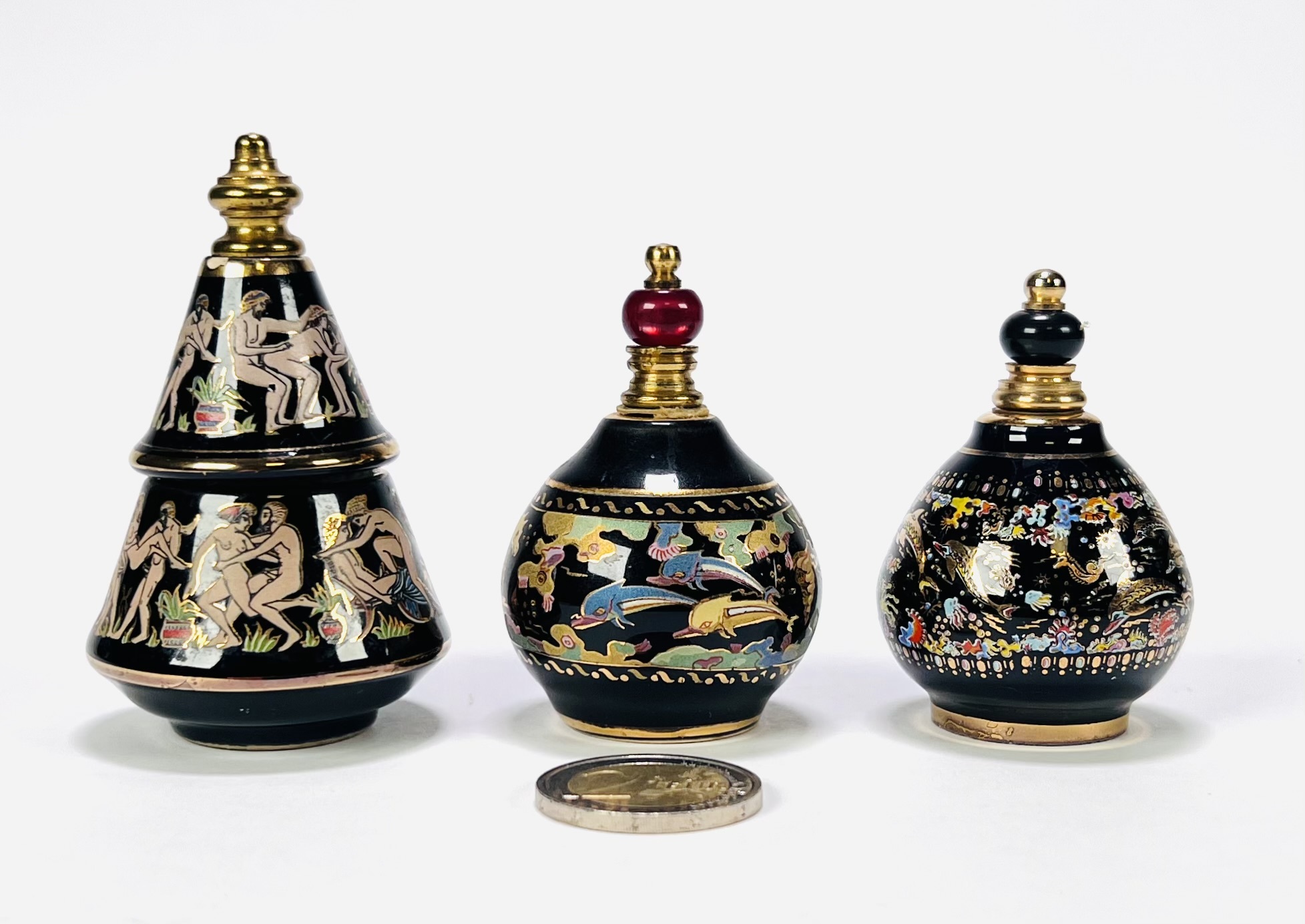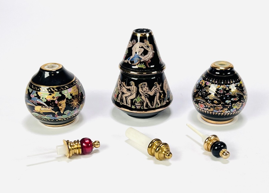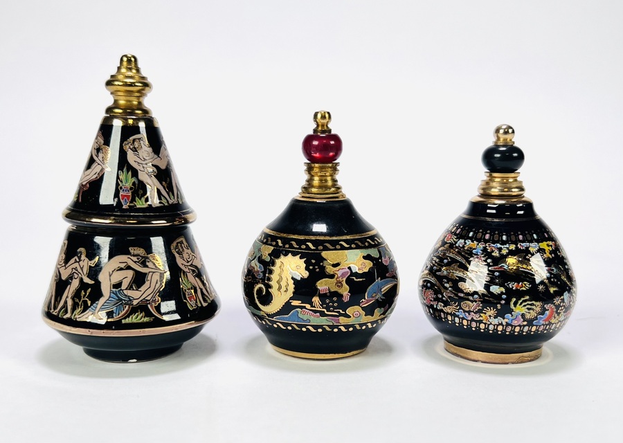 Drie aardewerken parfumflesjes in traditionele Griekse stijl, eind twintigste eeuw, met zwart glazuur en handgeschilderde decoraties in goud en polychrome kleuren. Eén kegelvormig exemplaar met erotische mythologische scènes, twee bolvormige met maritieme en florale motieven. Voorzien van doppen, kunststof applicaties en originele labels onderzijde, waaronder “Made in Greece”, “BARDACO” en “VENUS” Zeker zijn van deelname? Plaats vanaf 22 augustus een schriftelijk bod. |
