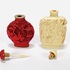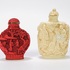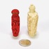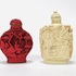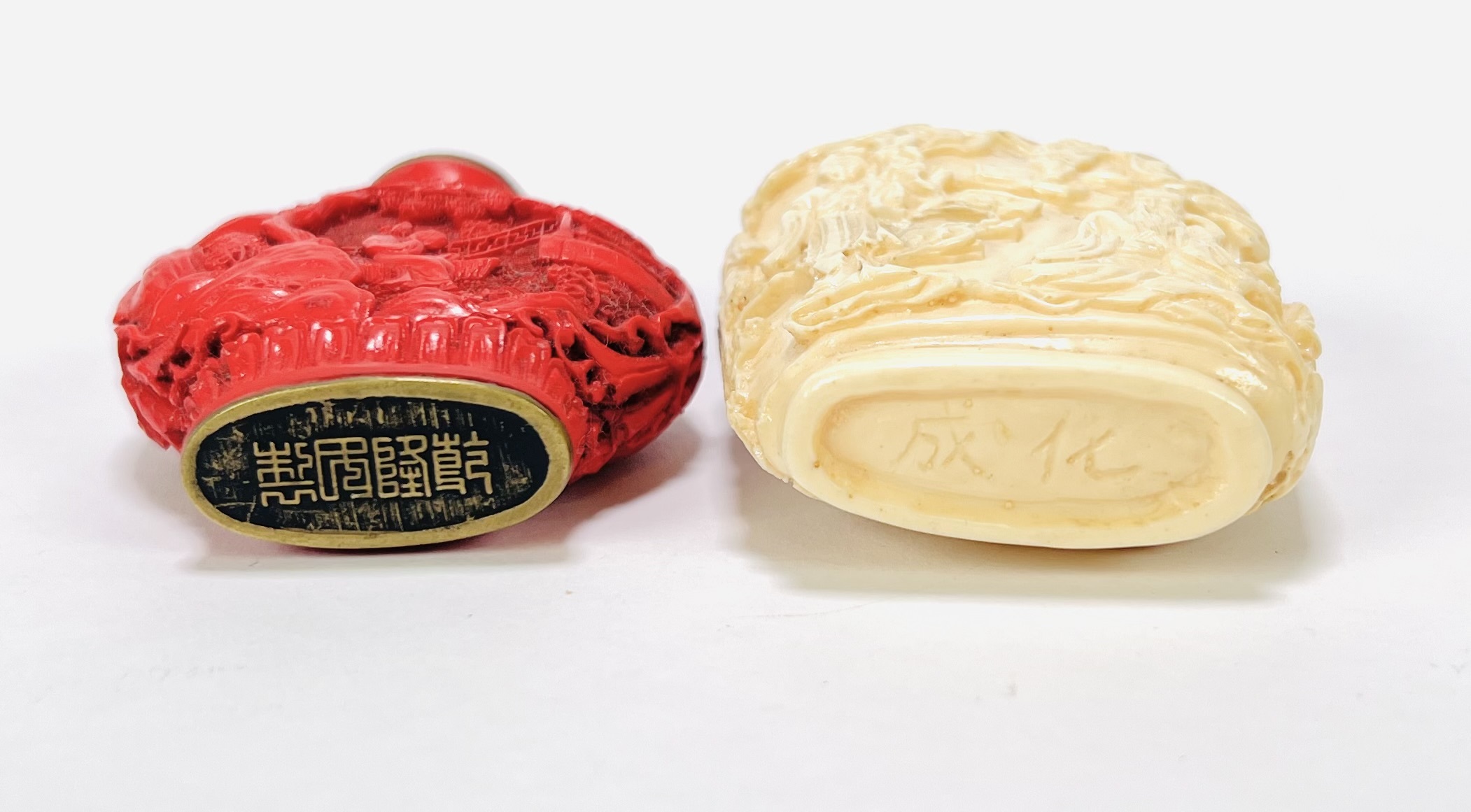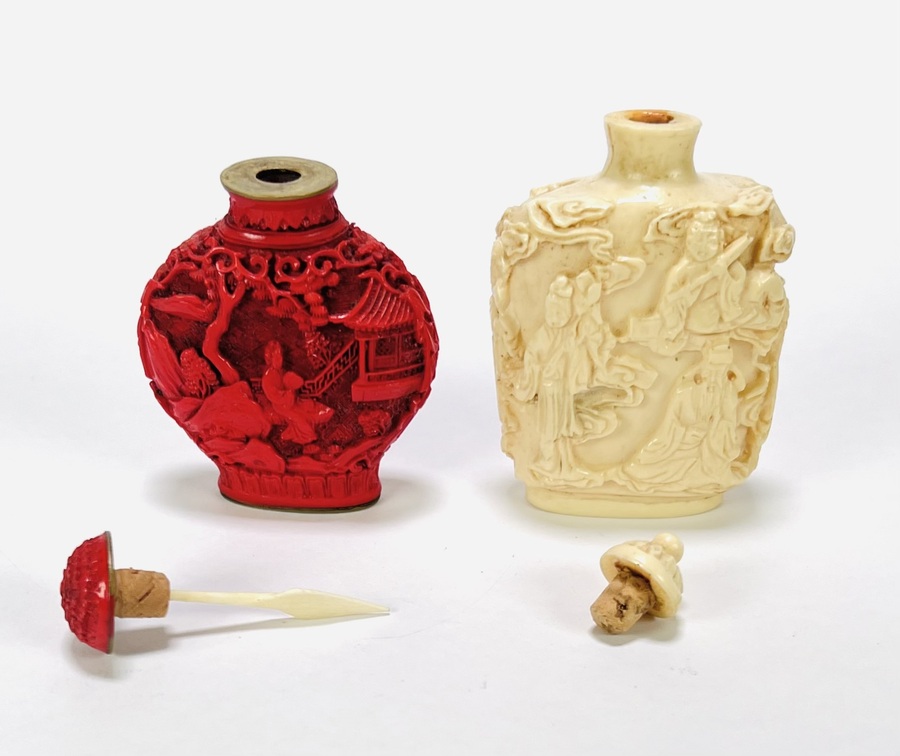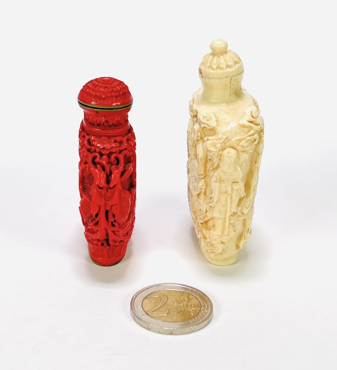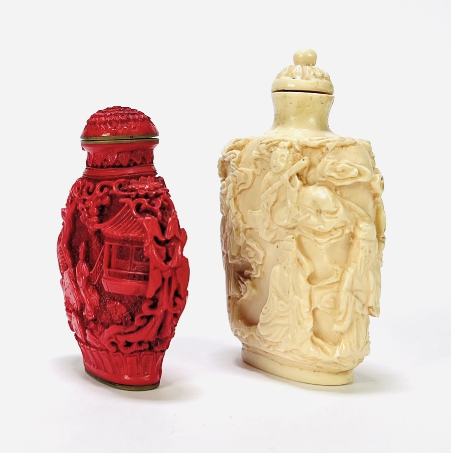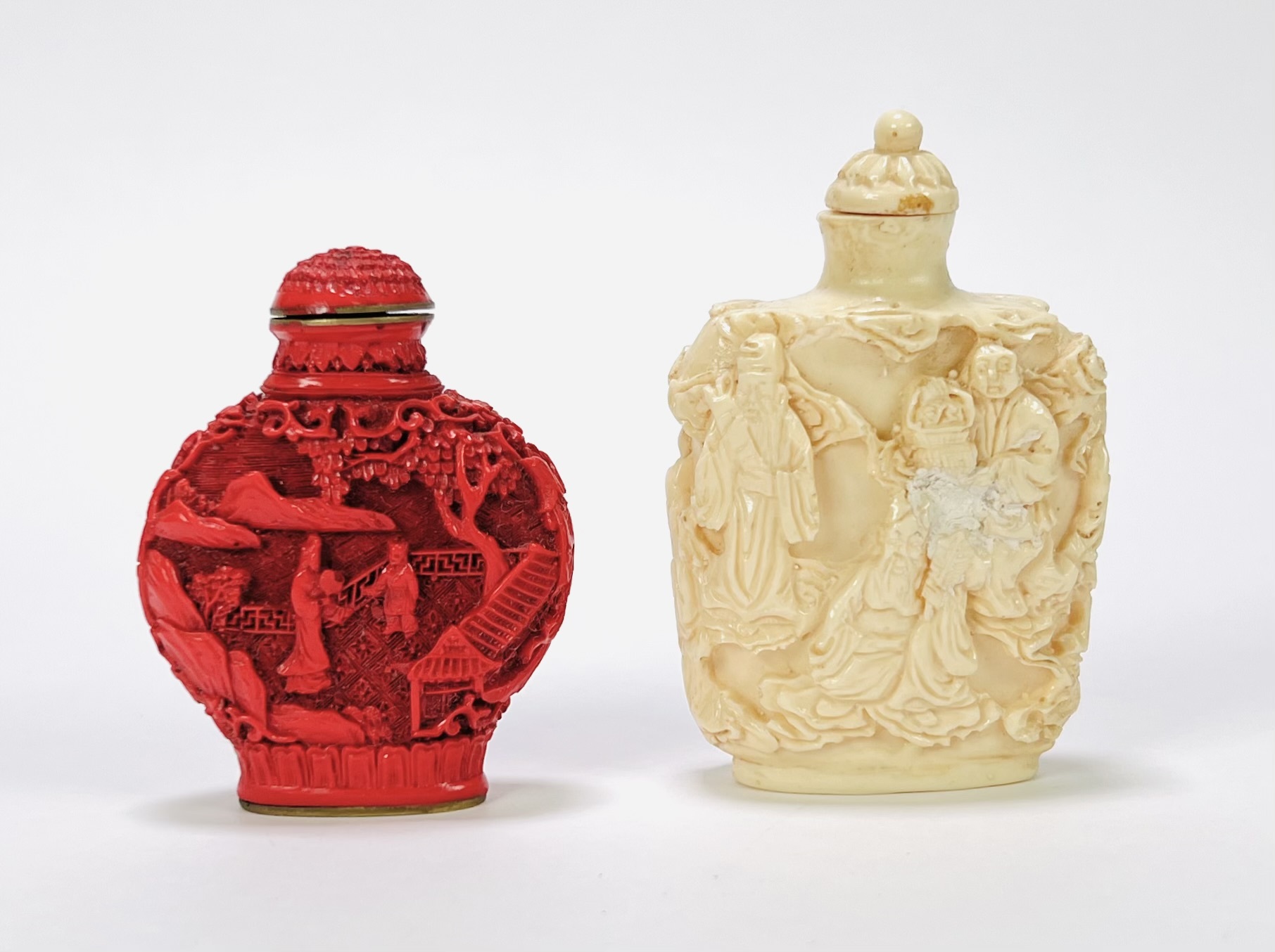 Twee Chinese snuifflesjes, ca. 1950–1980. Gegoten en deels nabewerkt kunsthars, één rood cinnabar stijl met messing monturen en lepeltje aan kurk, één ivoorkleurig met hoogreliëf figuren. Onderzijde rood exemplaar met ovaal cartouche met Chinese karakters; het ivoorkleurige stuk met ingekraste tekens Chenghua. Klein formaat, bolle schouders, afgeronde voet en lossende doppen, decor cinnabar flesje paviljoen en tuinfiguren; ivoorkleurig flesje met wolken, wijzen. Voeg deze snuifflesjes toe aan je verzameling en doe een bod! |