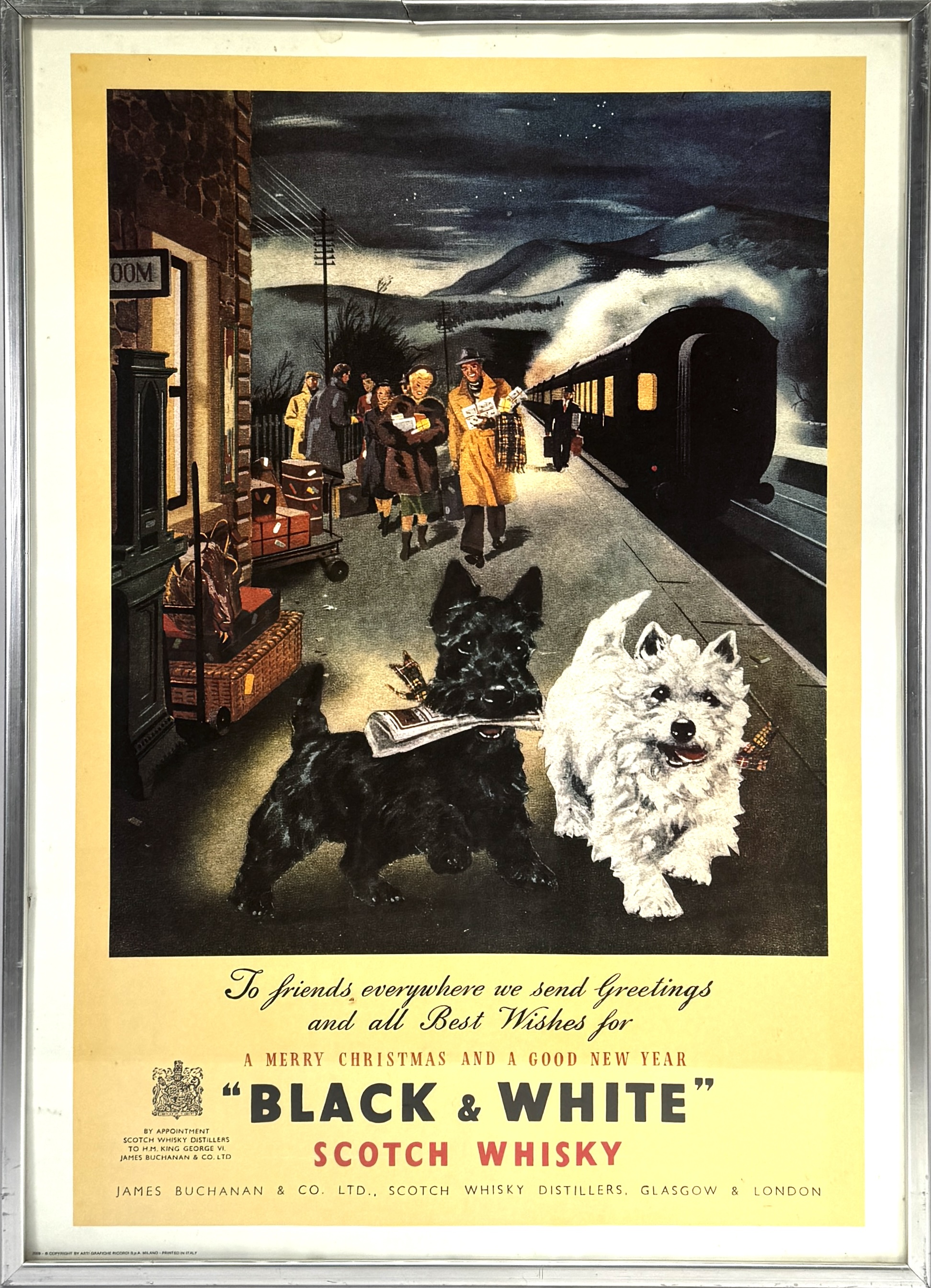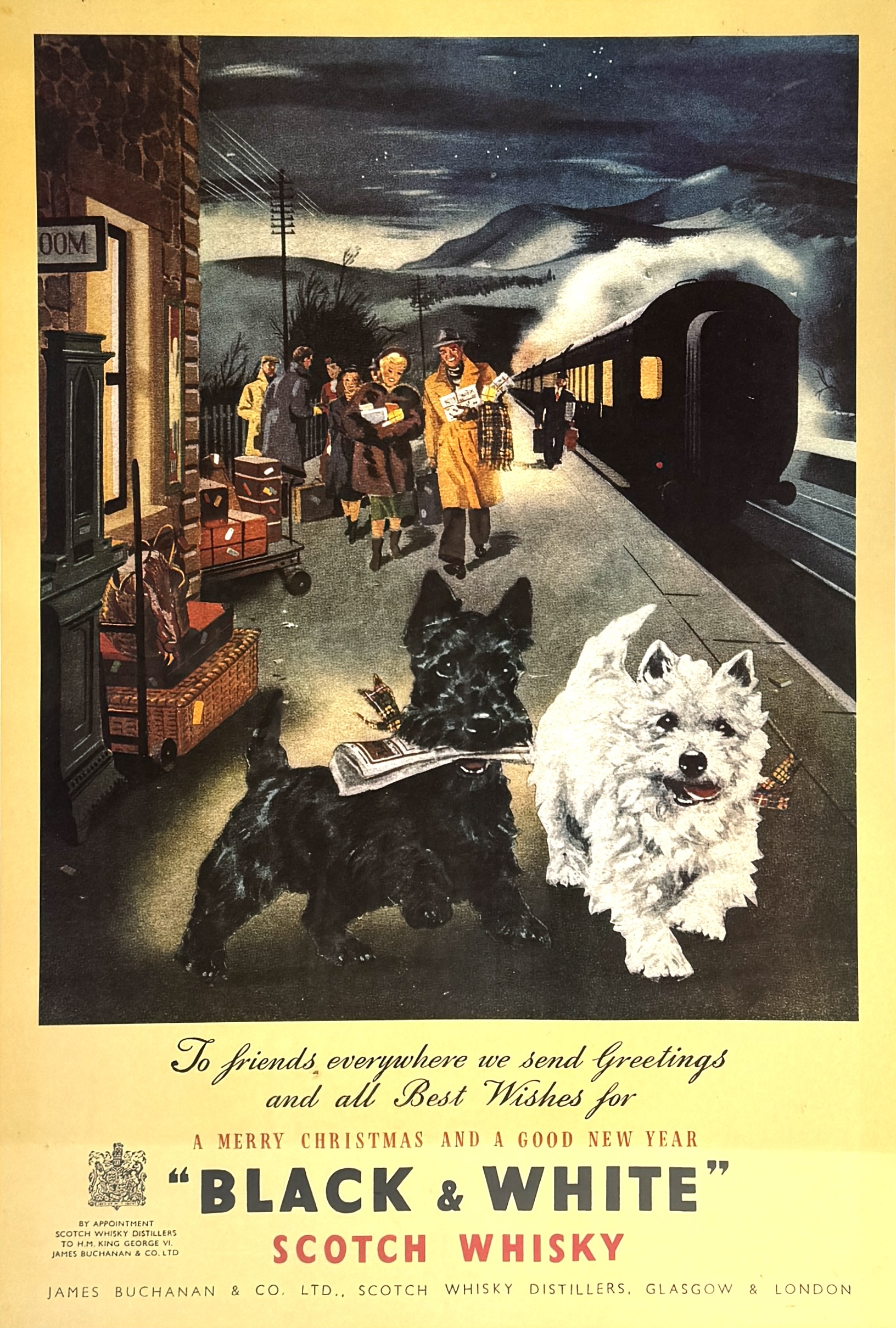 Vintage reclameposter "Black & White" Scotch Whisky, uitgegeven door James Buchanan & Co. Ltd., omstreeks jaren 1940–1950. Uitgevoerd in kleurenlithografie op papier, in commerciële illustratieve stijl. De voorstelling bevat een stationsscène met reizigers en een stoomtrein, op de voorgrond de kenmerkende zwarte en witte terriërs als merkiconen, vergezeld door kerst- en nieuwjaarsgroet. Registreer nu en bied eenvoudig online mee op deze vintage poster! |