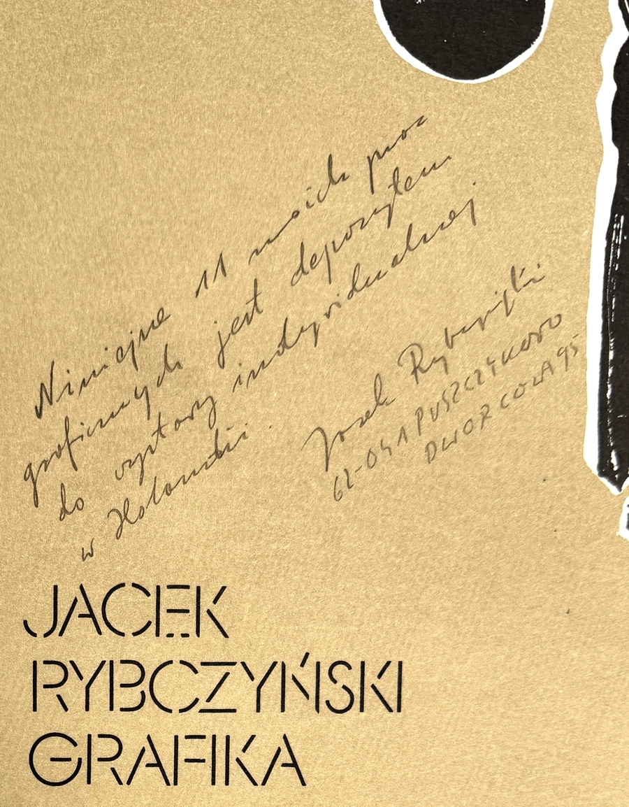 Poster van Jacek Rybczyński (1939-2016), gedateerd 1977, uitgevoerd in papier en gedrukt in grafische affichetechniek. Het ontwerp toont een abstracte compositie in zwart op goudkleurige achtergrond met tekstuele elementen. Rechtsonder bevindt zich een handgeschreven opdracht en rechtsboven een gesigneerde aanduiding. Het affiche kondigt de tentoonstelling “Jacek Rybczyński Grafika” aan in Poznań, BWA Stary Rynek Arsenal, gehouden van 6 tot 11 mei 1977.