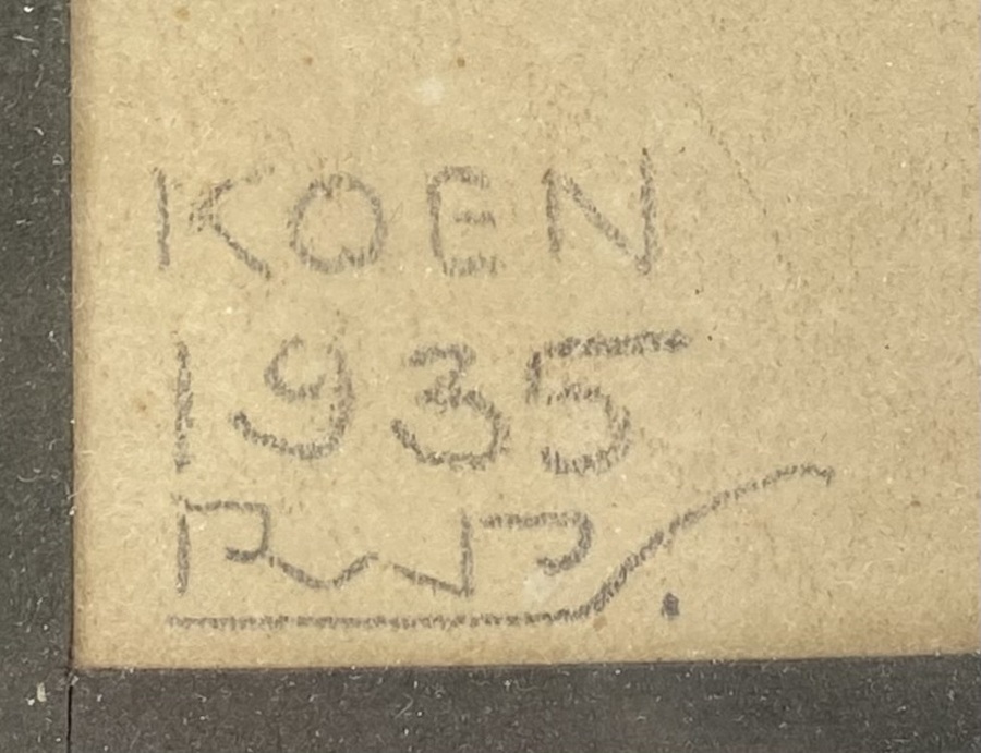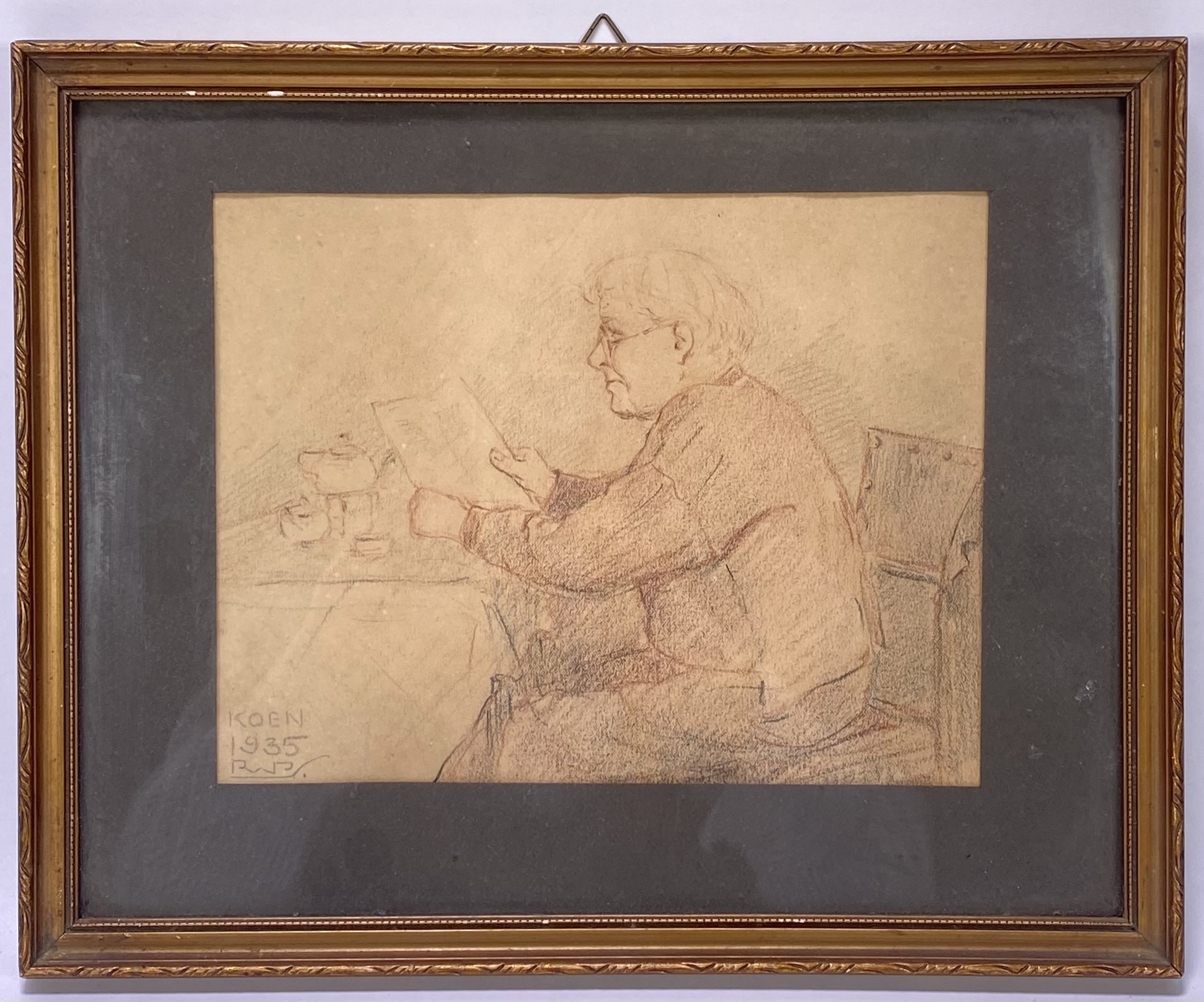 Tekening op papier door Koen, linksonder in potlood gesigneerd en gedateerd 1935. Uitgevoerd in potlood met subtiele kleurpotloodaccenten. De voorstelling toont een zittende man aan tafel, verdiept in lectuur, met servies en stoel zichtbaar. De compositie is realistisch en gedetailleerd met aandacht voor houding en omgeving. Zeker zijn van deelname? Plaats vanaf 22 augustus een schriftelijk bod online |