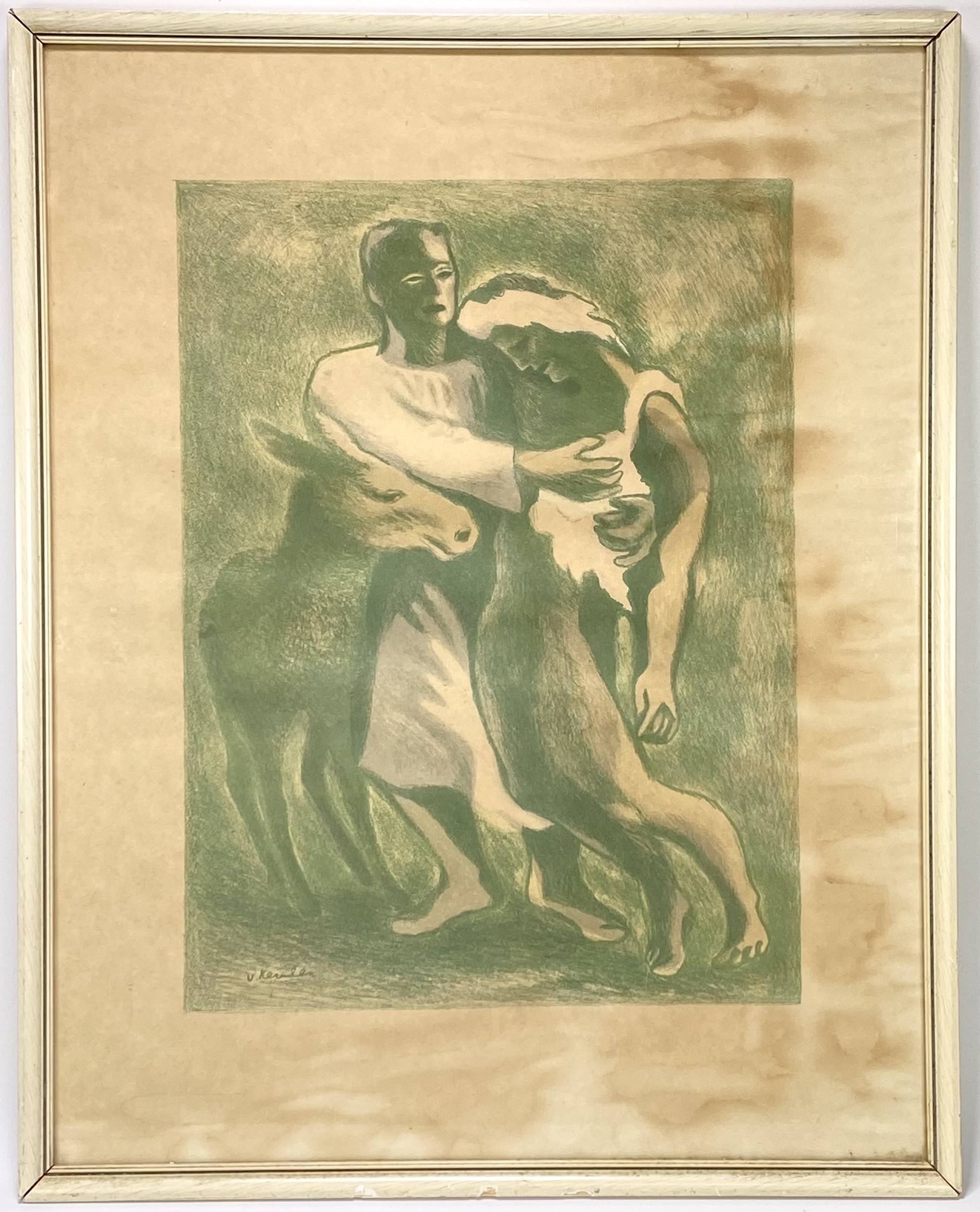 Litho op papier van Jan van Keulen (1913–1994), twintigste eeuw, uitgevoerd in lithografie met groentinten. Linksonder in de plaat gesigneerd: v. Keulen. De voorstelling toont een Samaritaan die een gewonde man ondersteunt, vergezeld door een ezel. Klaar om te bieden? Registreer je nu en doe mee aan de veiling! |