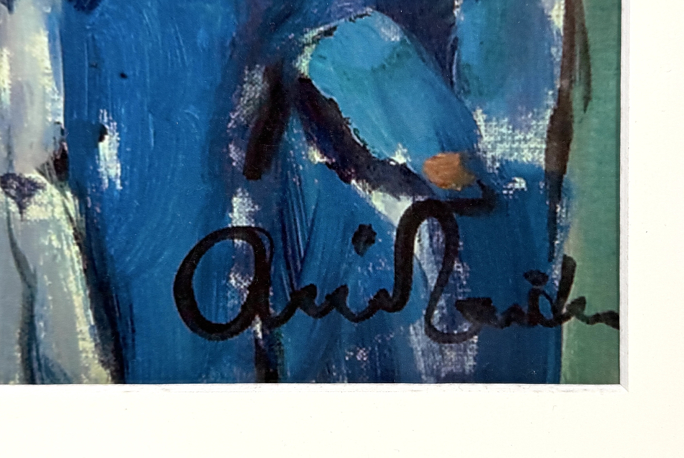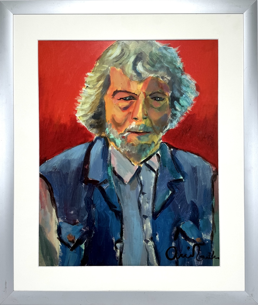 Prent in expressieve stijl, gesigneerd rechtsonder door Arie Zuidersma (1925–2014), gedateerd omstreeks 2000, zelf portret. Voorzien van een witte passe-partout en zilverkleurige lijst.