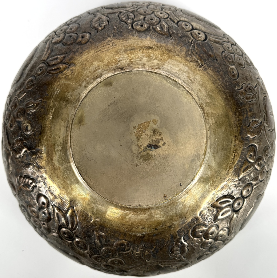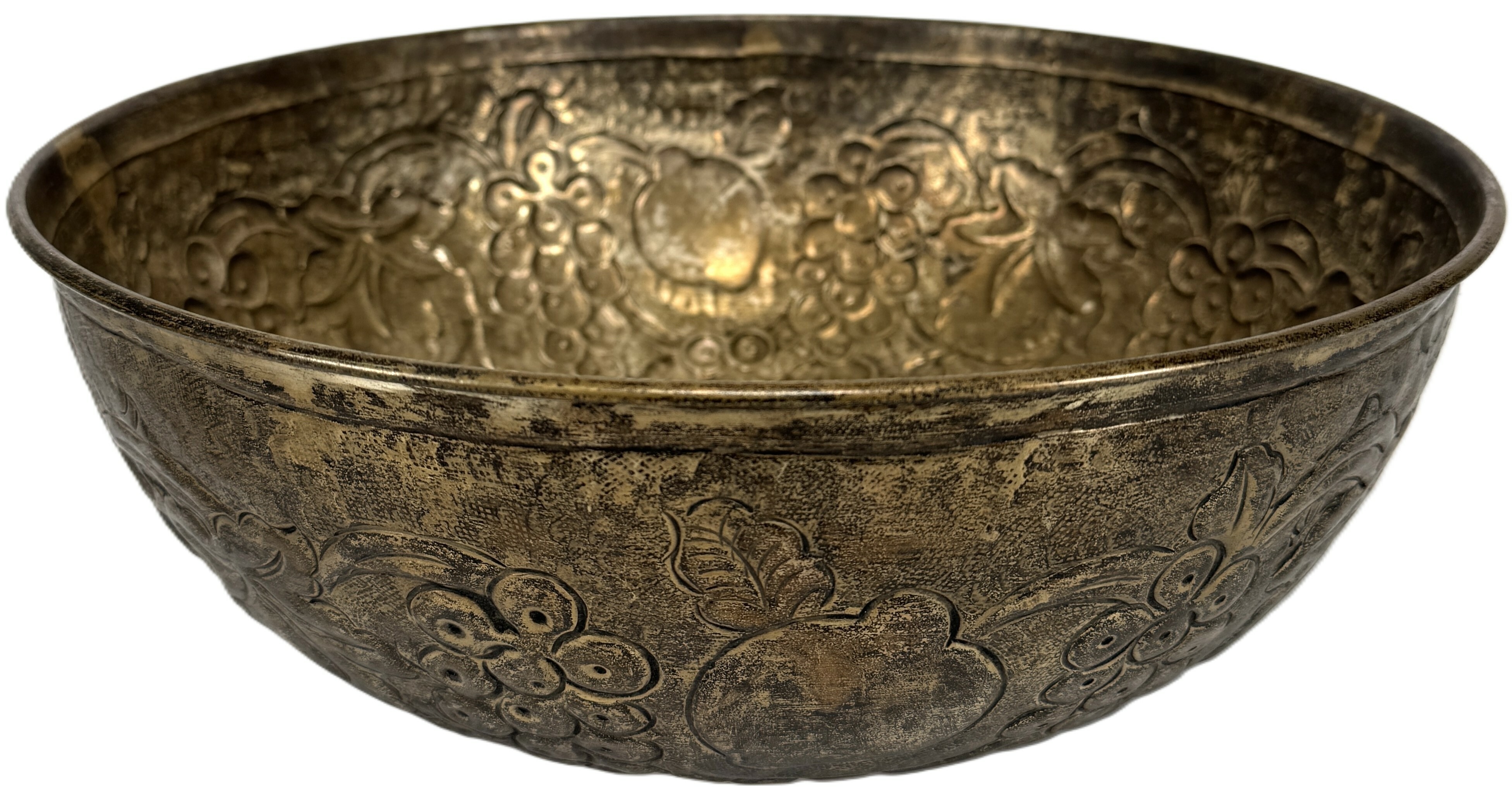 Messing schaal met gedreven en gegraveerde florale en vruchtenmotieven in reliëf, eind 19e eeuw tot begin 20e eeuw. Het object toont druiventrossen, perziken en bladranken rondom, met een gladde onderzijde zonder zichtbare signatuur of merk. De stijl verwijst naar ambachtelijke Europese en Midden-Oosterse metaalbewerking. Klaar om te bieden? Registreer je nu en doe mee aan de veiling! |