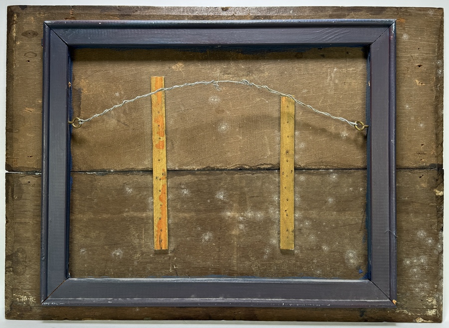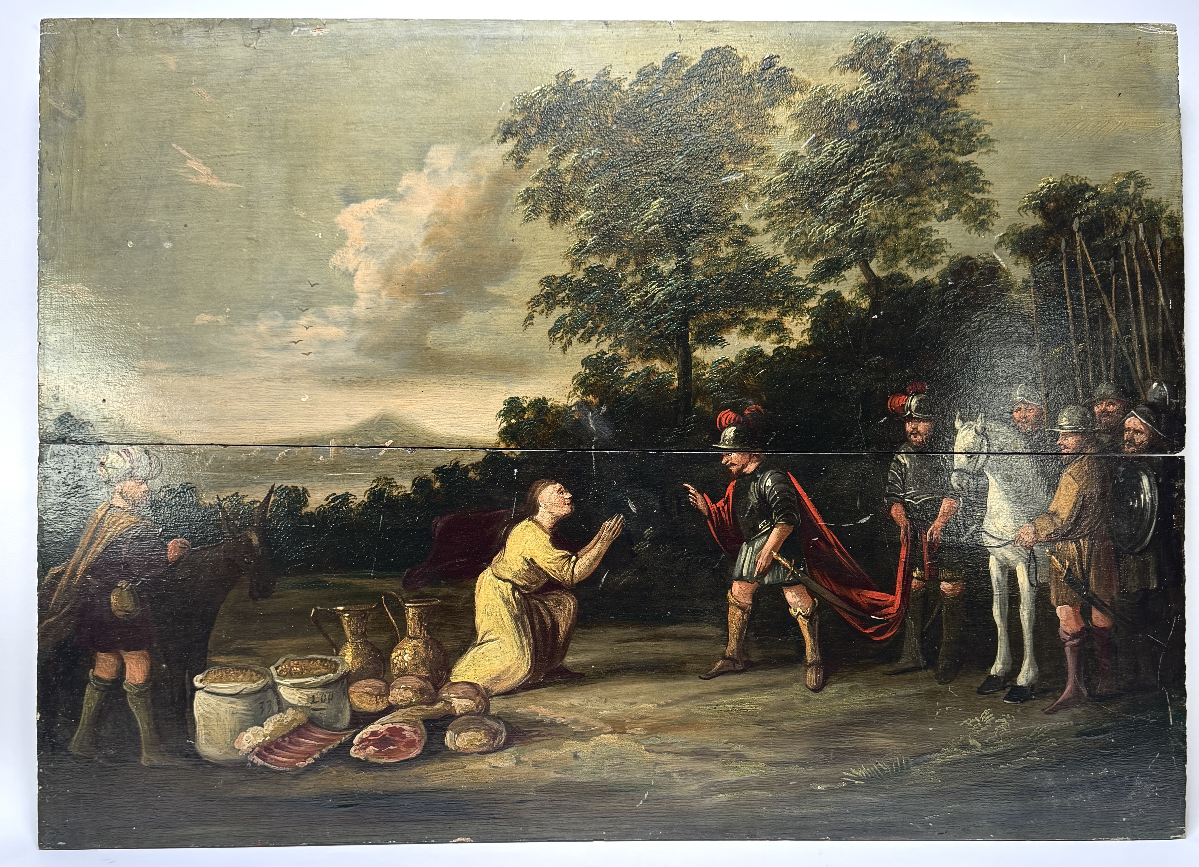 Schilderij in barokke stijl, olieverf op houten paneel, circa 1800. De voorstelling toont een knielend persoon die een groep soldaten met paard en aanvoerder benadert, terwijl op de voorgrond voedsel en kruiken zichtbaar zijn. Het paneel bestaat uit twee horizontale delen. De lijst is donker geschilderd. Zeker zijn van deelname? Plaats vanaf 22 augustus een schriftelijk bod online! |