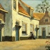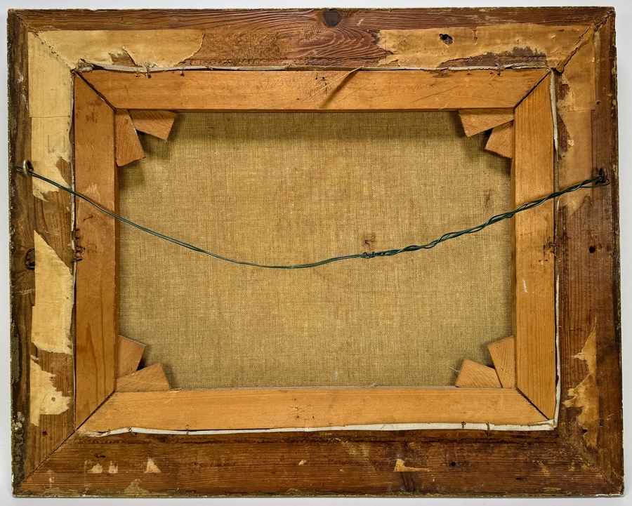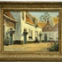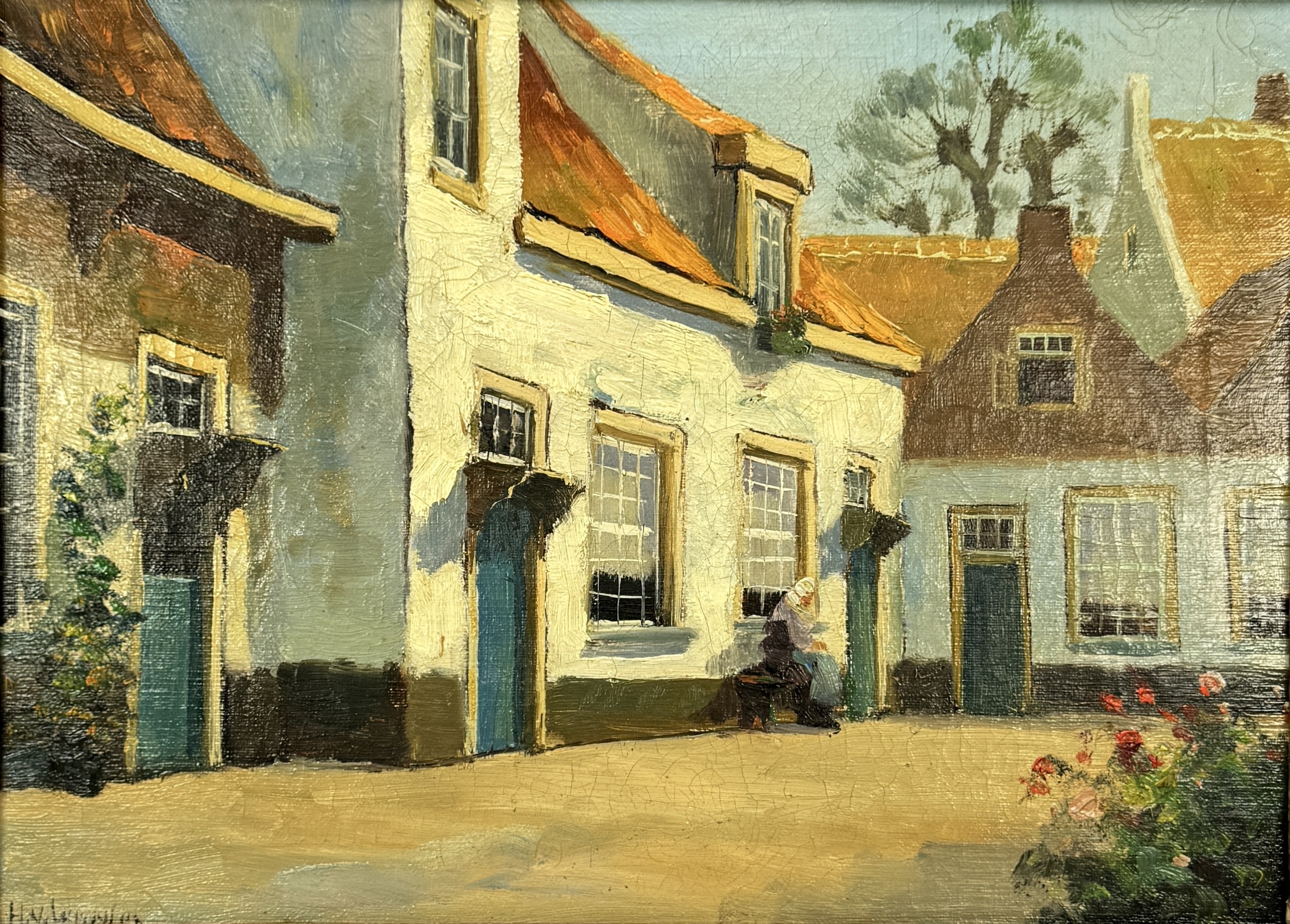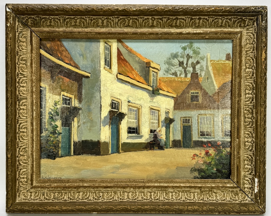 Schilderij, midden 20e eeuw. Olieverf op doek, in goud gekleurde ornamentlijst. Voorstelling van een Nederlands binnenplaats met zon beschenen gevels, oranjerode dakpannen en een zittende vrouw in klederdracht op een bank. Linksonder onduidelijk gesigneerd. Pasteuze penseelvoering, lichte craquelé. Achterzijde met klassiek spieraam, houten wiggen en ophangdraad. Traditionele Nederlandse stijl met naturalistische kleuren en uitgesproken licht-schaduwwerking. Wil je dit schilderij in het echt bekijken? Kom naar de kijkdagen op 29, 30 en 31 augustus. |