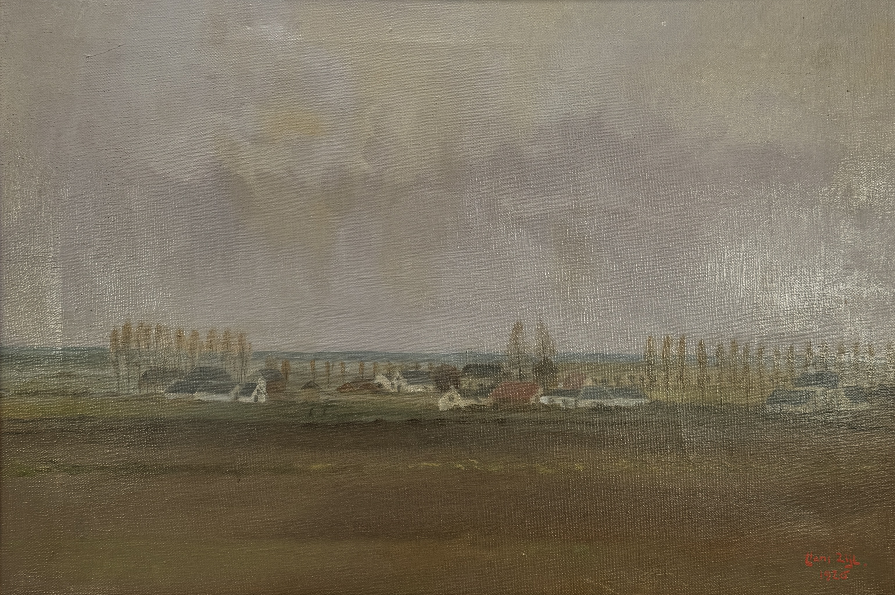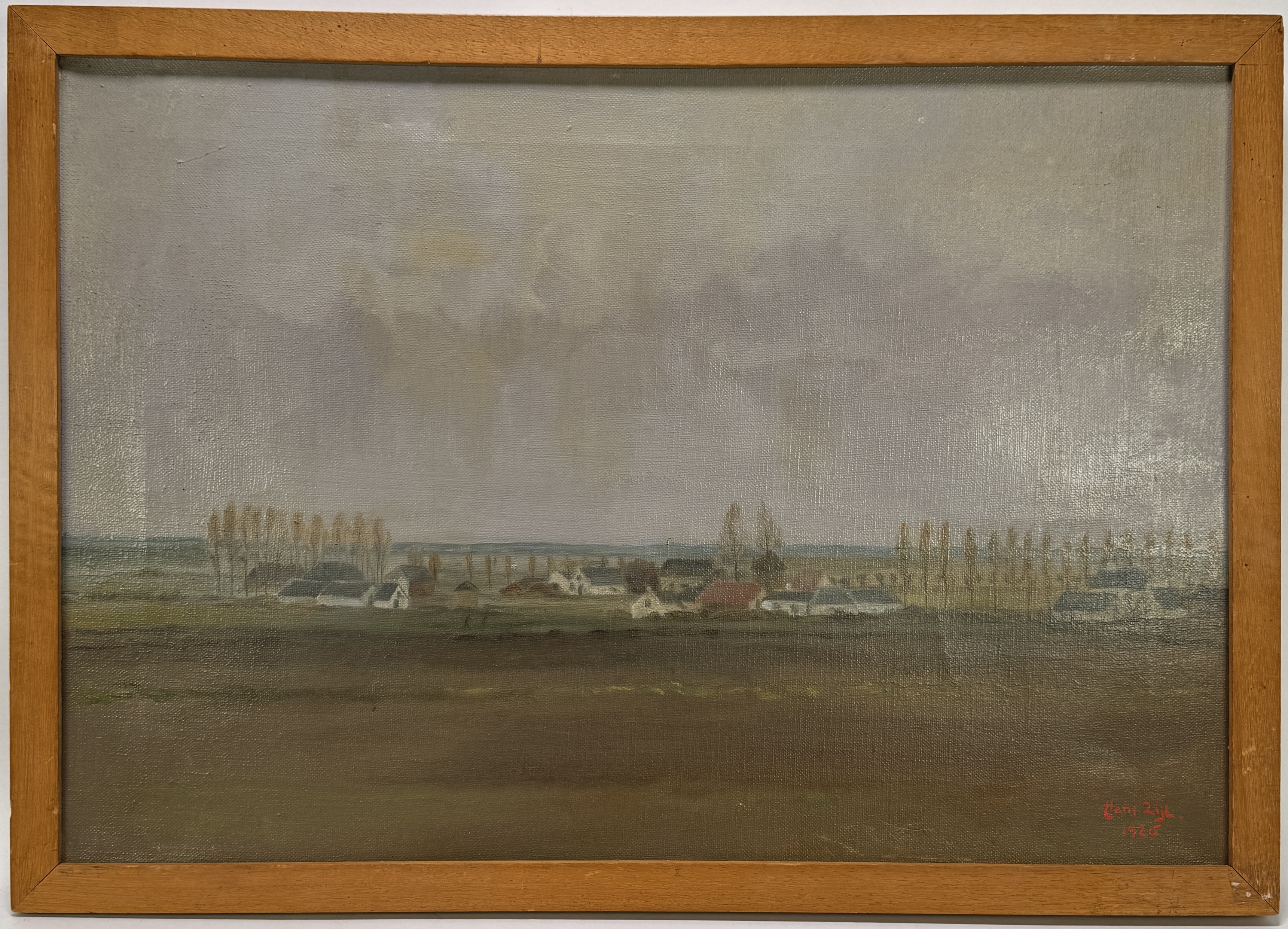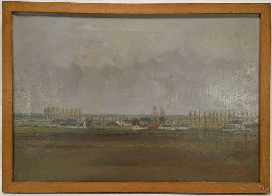Schilderij door Hans Zijl, 1928, uitgevoerd in olieverf op doek. Realistische, tonale landschapsweergave met lage horizon, dorpje, populierenrijen en bewolkte lucht. Rechtsonder gesigneerd en gedateerd in rood: “Hans Zijl, 1928”. Opgespannen op spieraam, in eenvoudige houten lijst. Eerst dit schilderij zien voordat je biedt? Bezoek onze kijkdagen op 29, 30 en 31 augustus van 11:00 tot 17:00 uur! |