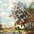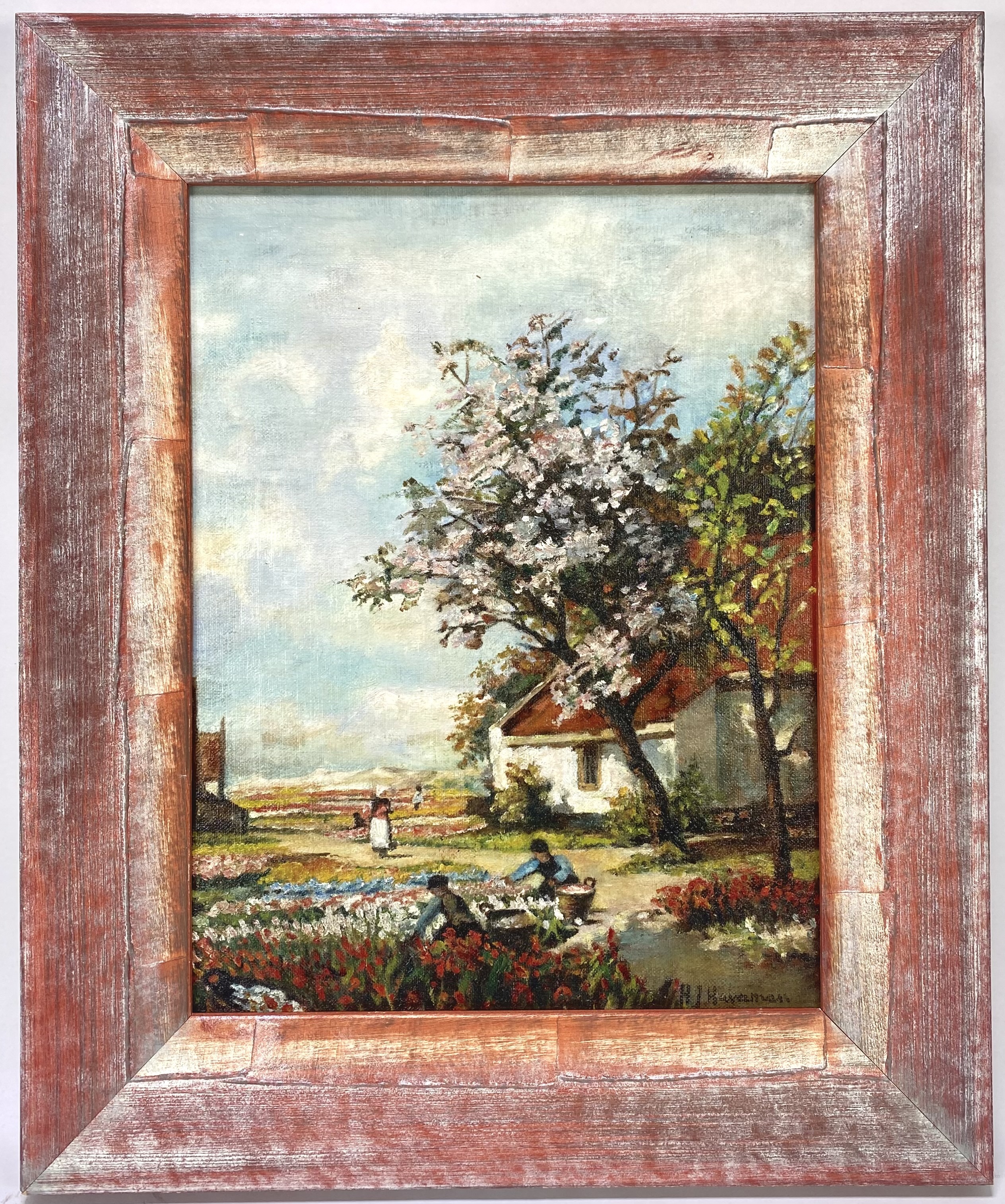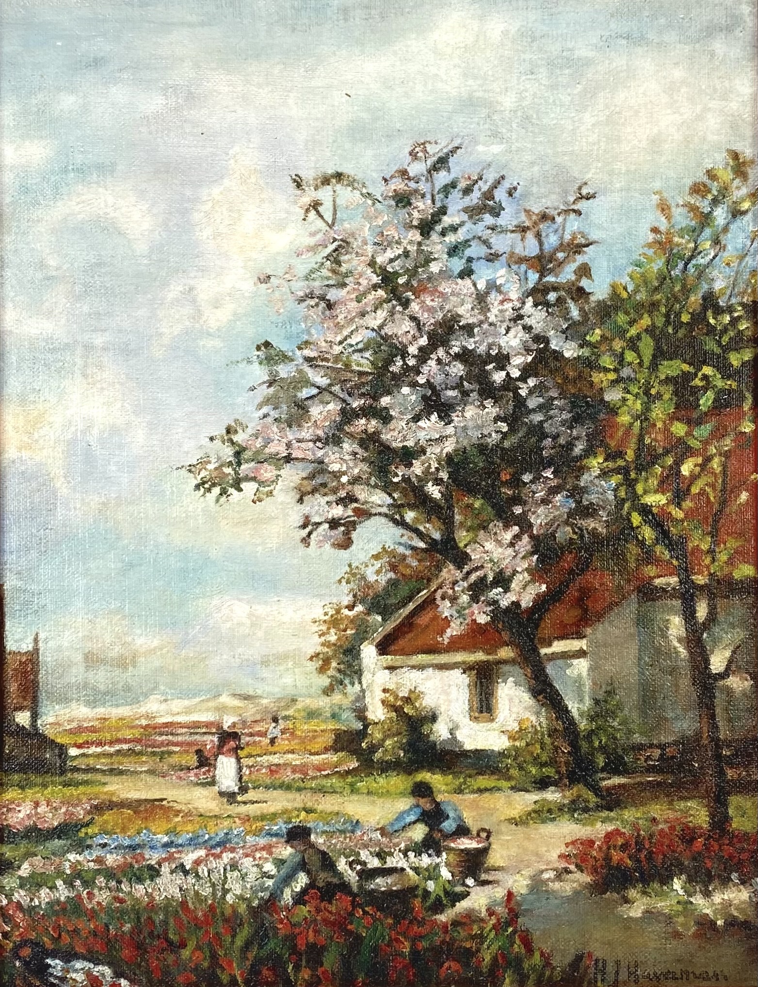 Oleografie Hendrik Johannes Haverman, bloemenveld met boerderij, eerste helft 20e eeuw