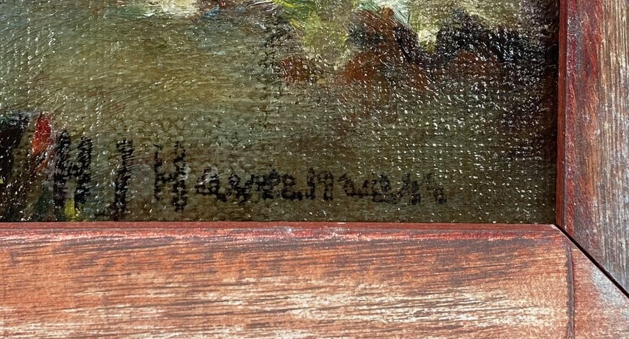 Oleografie in impressionistische stijl door Hendrik Johannes Haverman (1857–1928), eerste helft 20e eeuw. Voorstelling van een bloemenveld met werkende figuren, een bloeiende boom en een boerderij onder lichte lucht. Rechtsonder gesigneerd “H. J. Haverman". Inclusief eenvoudige roodbruine houten lijst. Klaar om te bieden? Registreer je nu en doe mee aan de veiling! |