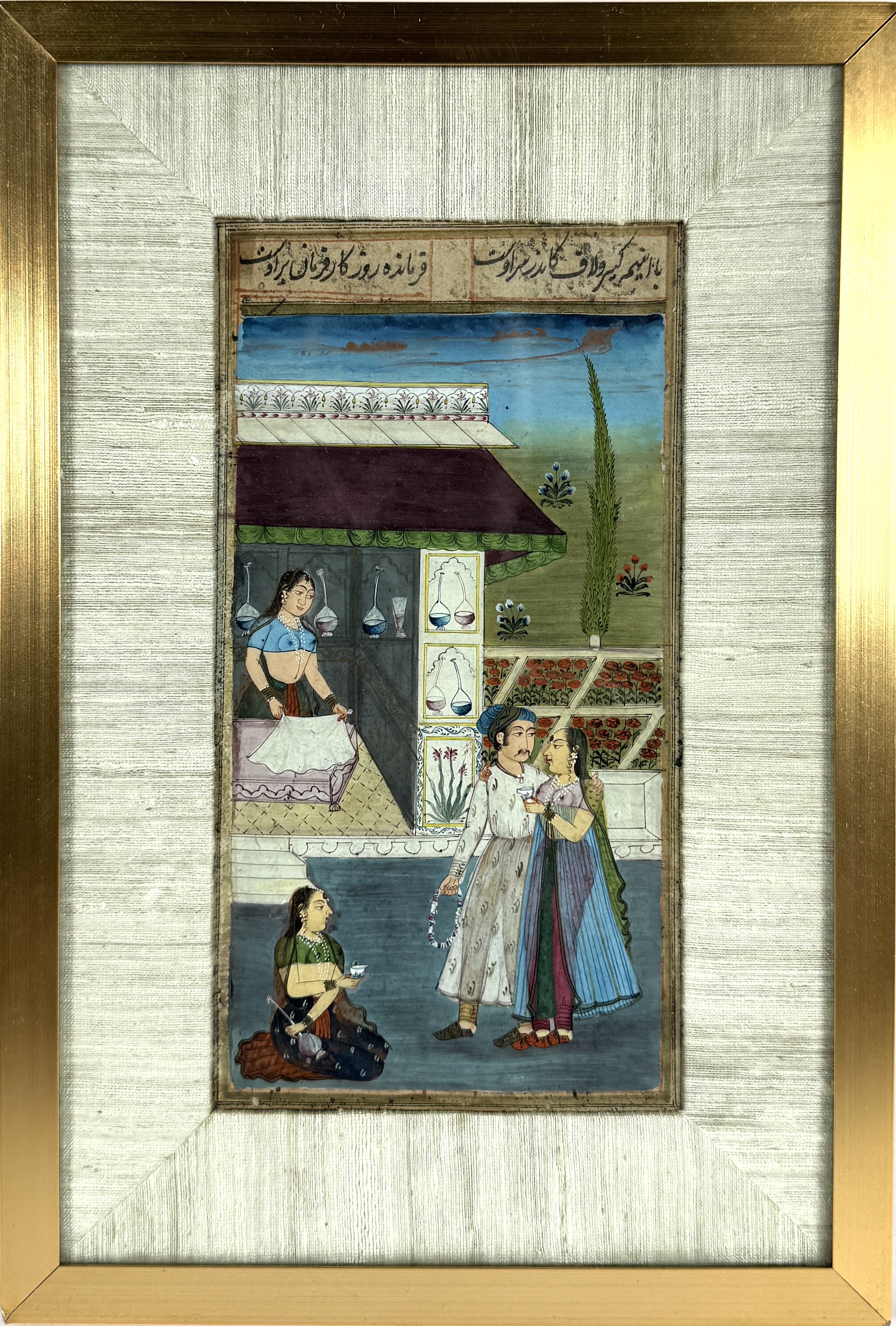 Miniatuur schilderij in Indo-Perzische stijl, omstreeks midden 20e eeuw, uitgevoerd in gouache op zijde. De voorstelling toont een hof scène met elegante figuren, kalligrafie in Perzisch schrift bovenaan en rijke decoratieve details. Het werk is voorzien van een goudkleurige lijst met passe-partout. Verso informatie. Wil je direct deelnemen? Plaats vanaf 22 augustus alvast een schriftelijk bod via onze website! |