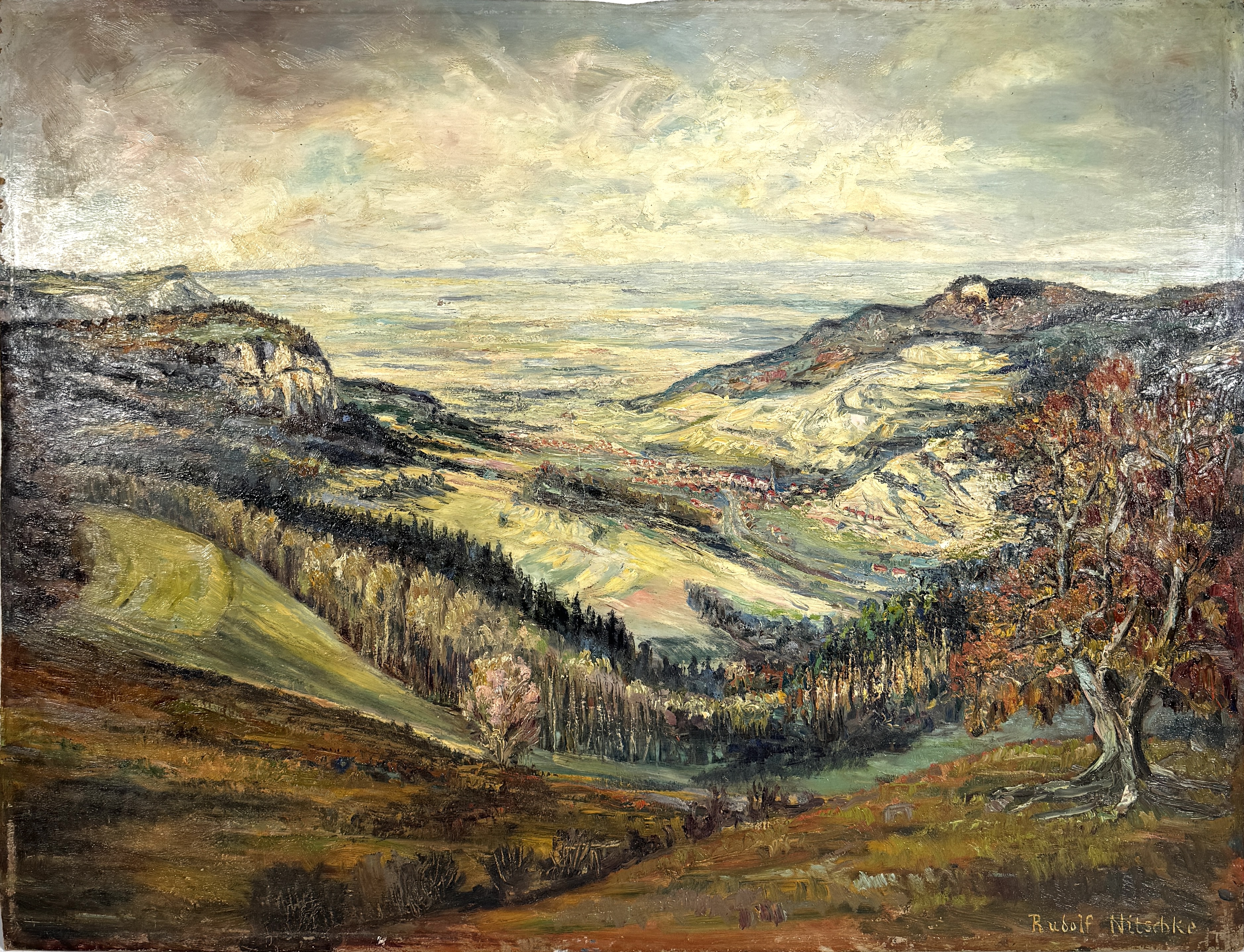 Olieverfschilderij Rudolf Nitschke, panorama landschap, ca. 20e eeuw