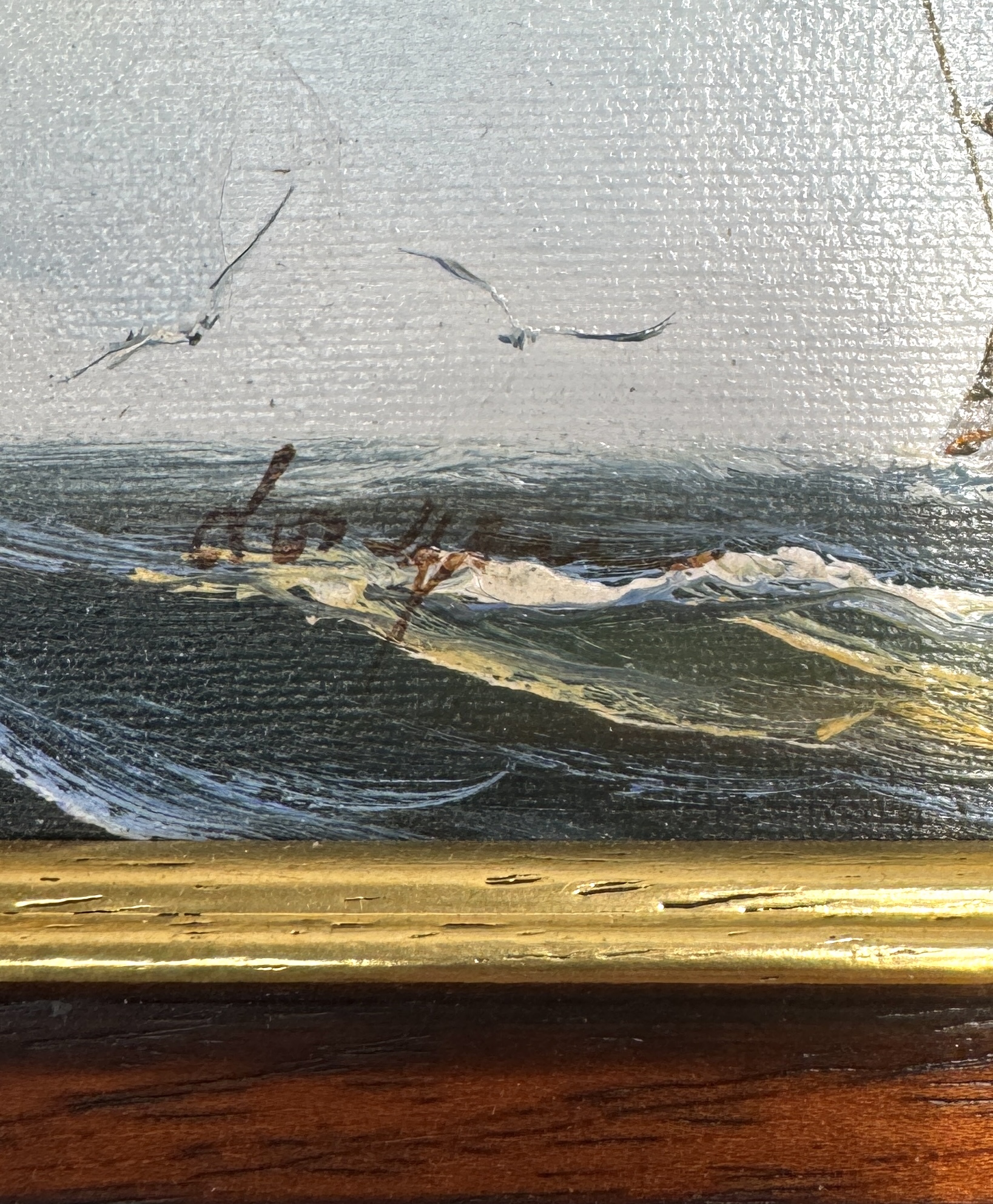 Schilderij uitgevoerd in olieverf op doek, eind 20e eeuw, maritieme voorstelling met zeilschip op woelige zee en meeuwen, rechtsonder gesigneerd. In goudkleurig en donkerhouten geprofileerde lijst, achterzijde voorzien van metalen plaquette met ateliervermelding. Wil je direct deelnemen? Plaats vanaf 22 augustus alvast een schriftelijk bod via onze website! |