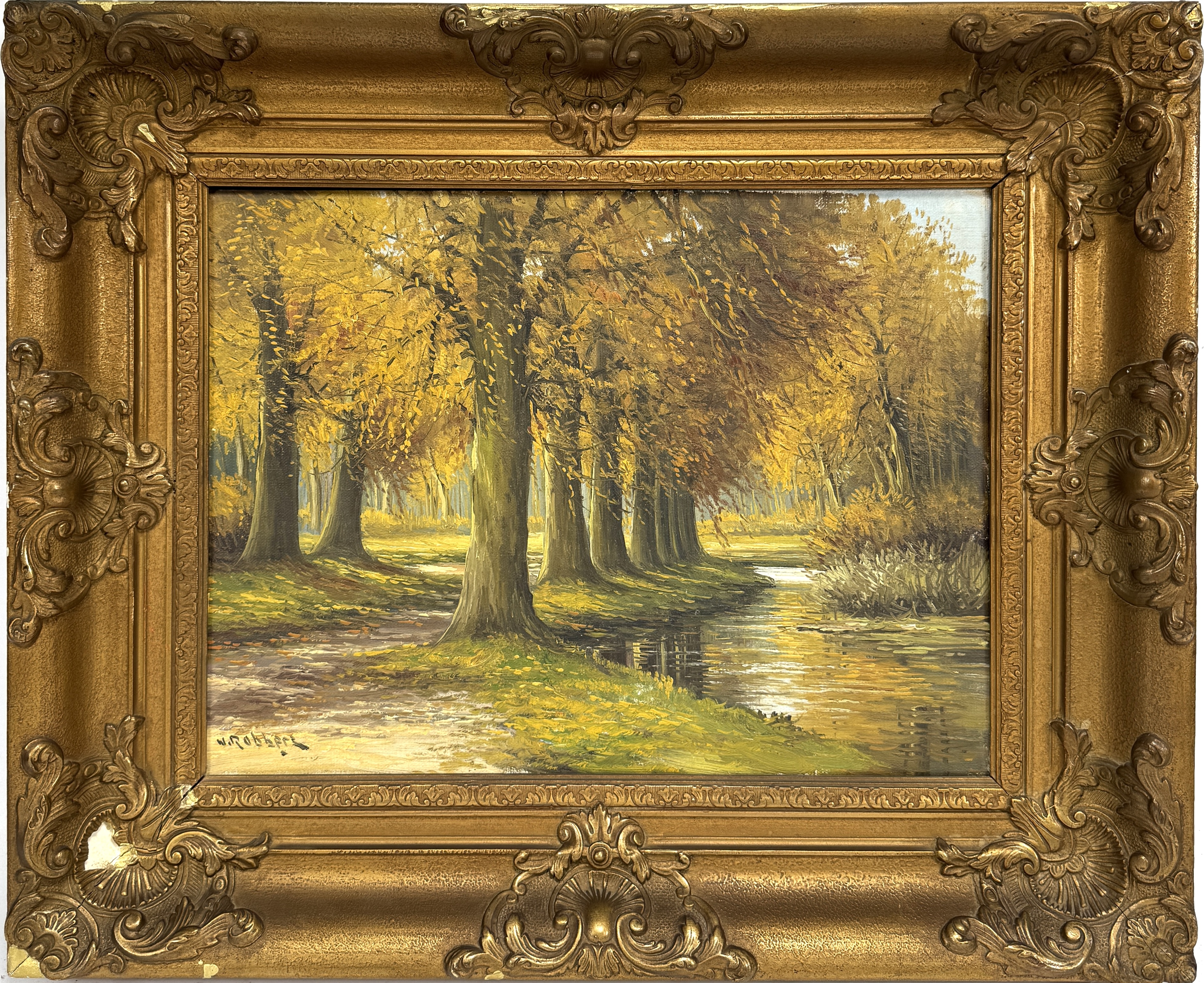 Schilderij van W. Robbers, olieverf op doek, midden 20e eeuw. Voorstelling van een laan met bomen in herfstkleuren langs een waterpartij, uitgevoerd in naturalistische stijl. Kenmerkend zijn de warme geel- en bruintinten en de sterke lichtwerking. Linksonder gesigneerd. In goudkleurige, rijk geornamenteerde lijst. Klaar om te bieden? Registreer je nu en doe mee aan de veiling! |
