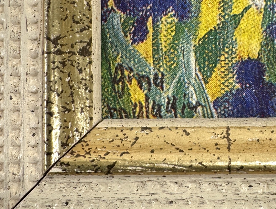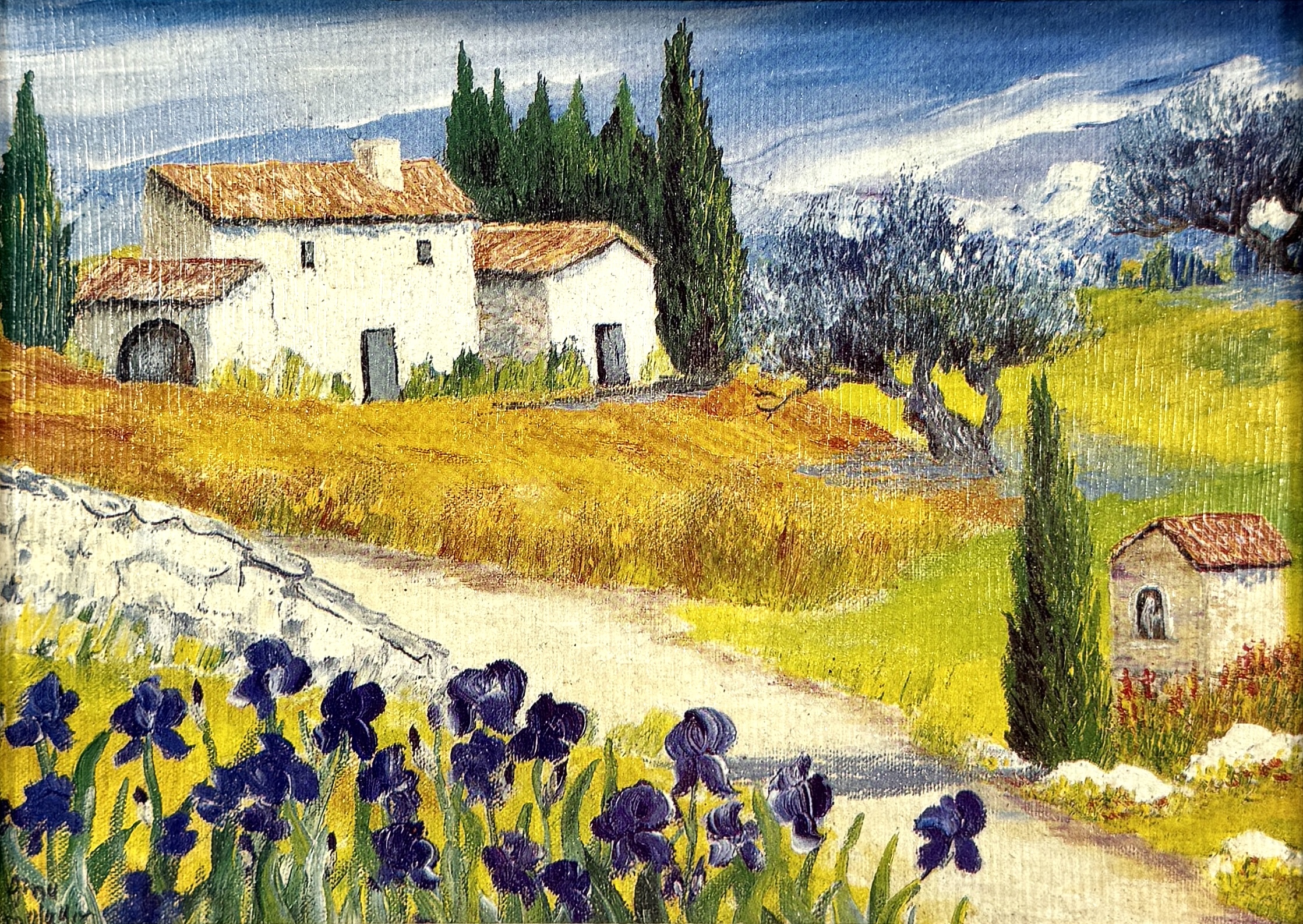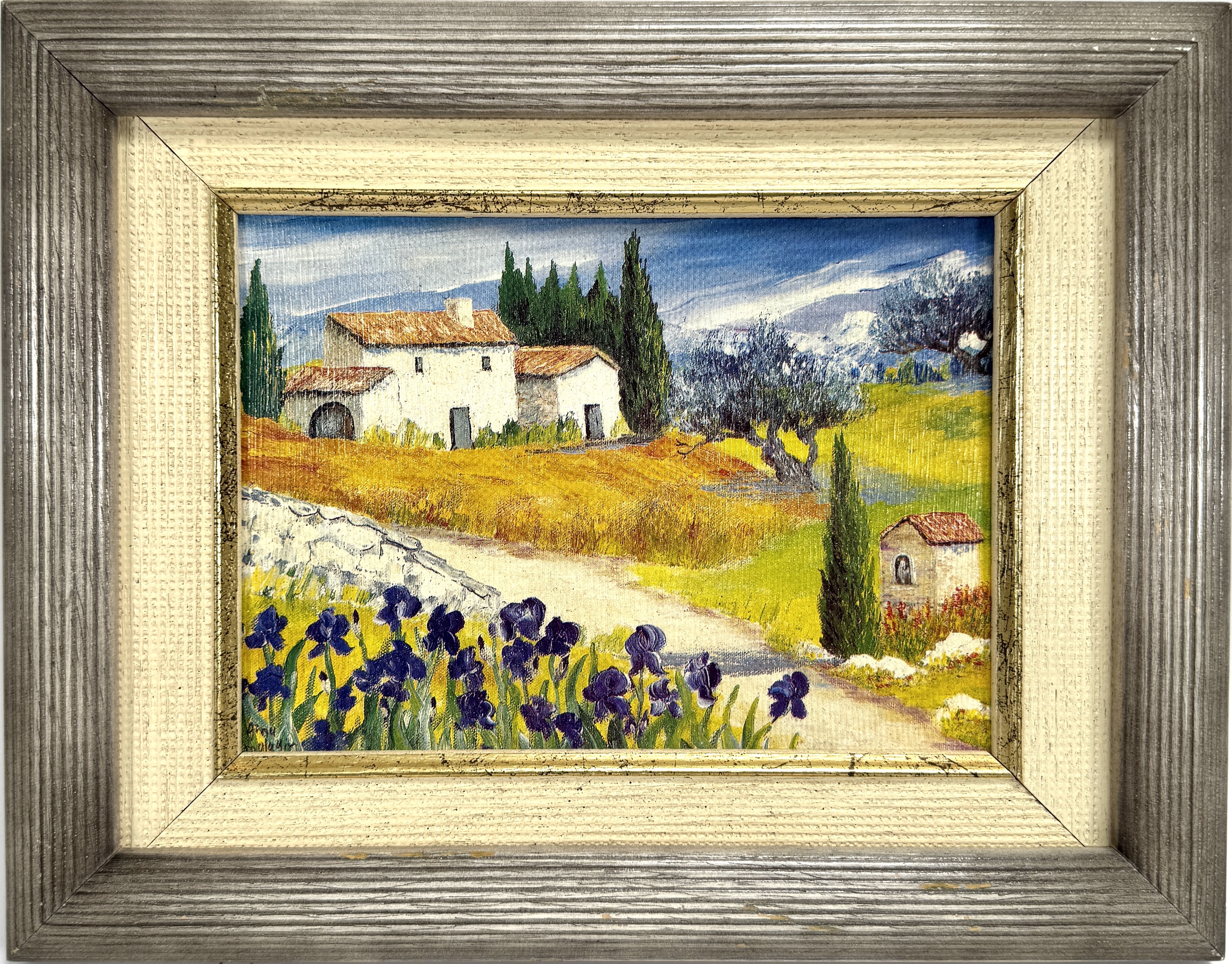 Oleografie op doek, tweede helft 20e eeuw, met voorstelling van een mediterrane landschapsscène. Te zien zijn een wit gepleisterd huis met pannendak, cipressen, olijfbomen en paarse irissen. Linksonder onduidelijk gesigneerd, gespannen op houten spieraam en gevat in een goudkleurig en witgeschilderde houten lijst. Wil je direct deelnemen? Plaats vanaf 22 augustus alvast een schriftelijk bod via onze website! |