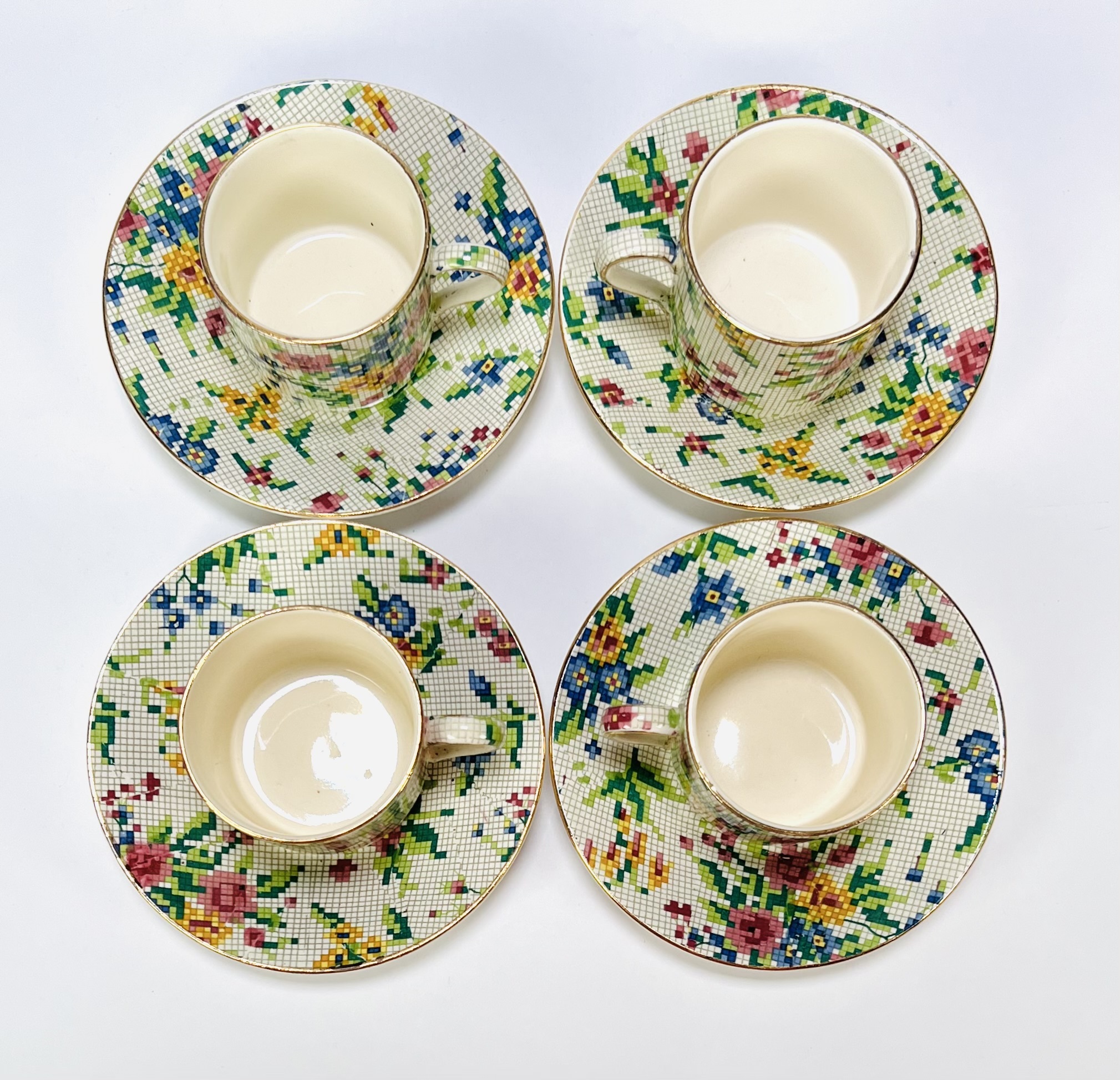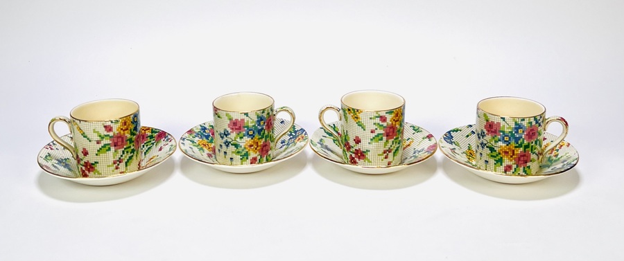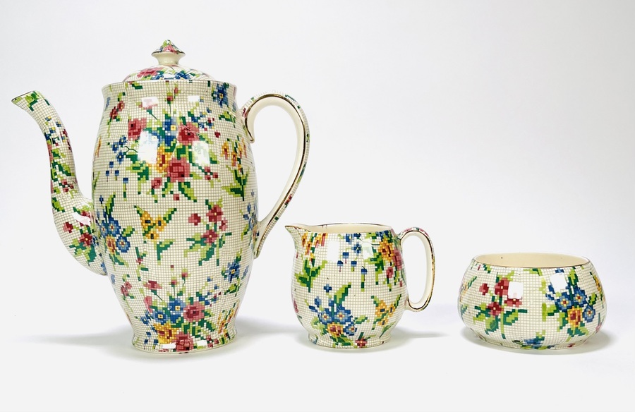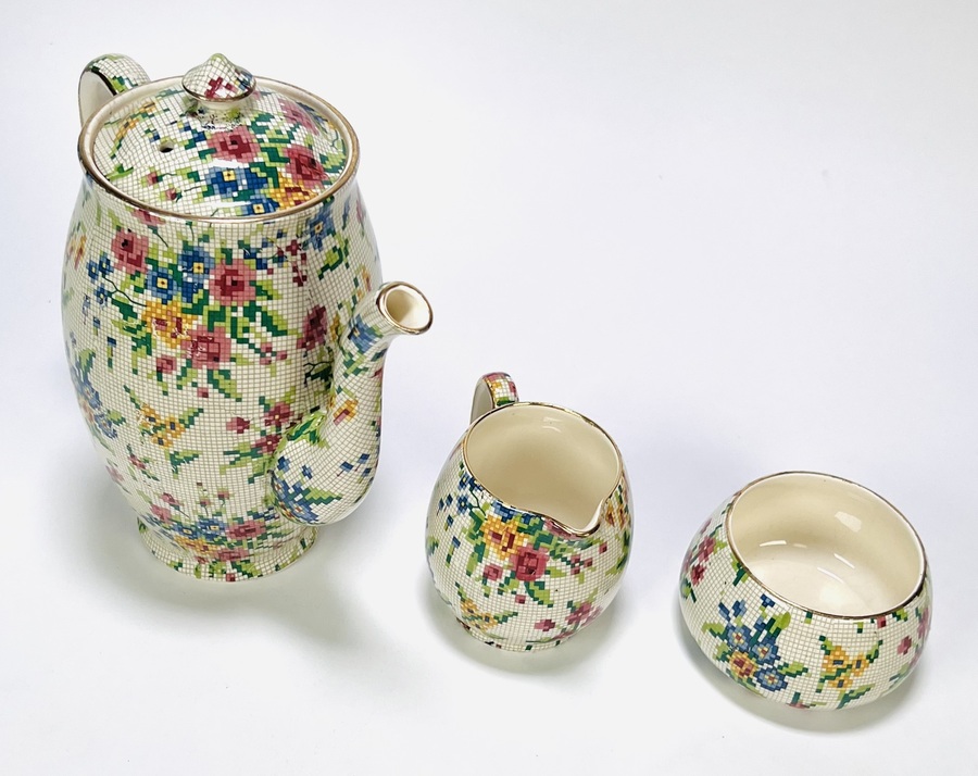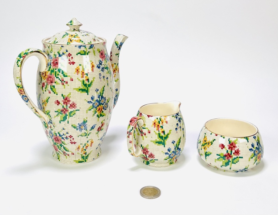 Keramisch servies van Royal Winton Grimwades (opgericht 1885), uitgevoerd in chintz-stijl met pixelachtig bloemendecor. Model “Queen Anne”, gemerkt onderzijde met registratienummer 15541. Het servies bestaat uit een koffiepot, roomkan, suikerpot en vier kop-en-schotels, midden 20e eeuw. Geïnteresseerd? Bezoek onze kijkdagen op 29, 30 of 31 augustus van 11:00 tot 17:00 uur. |