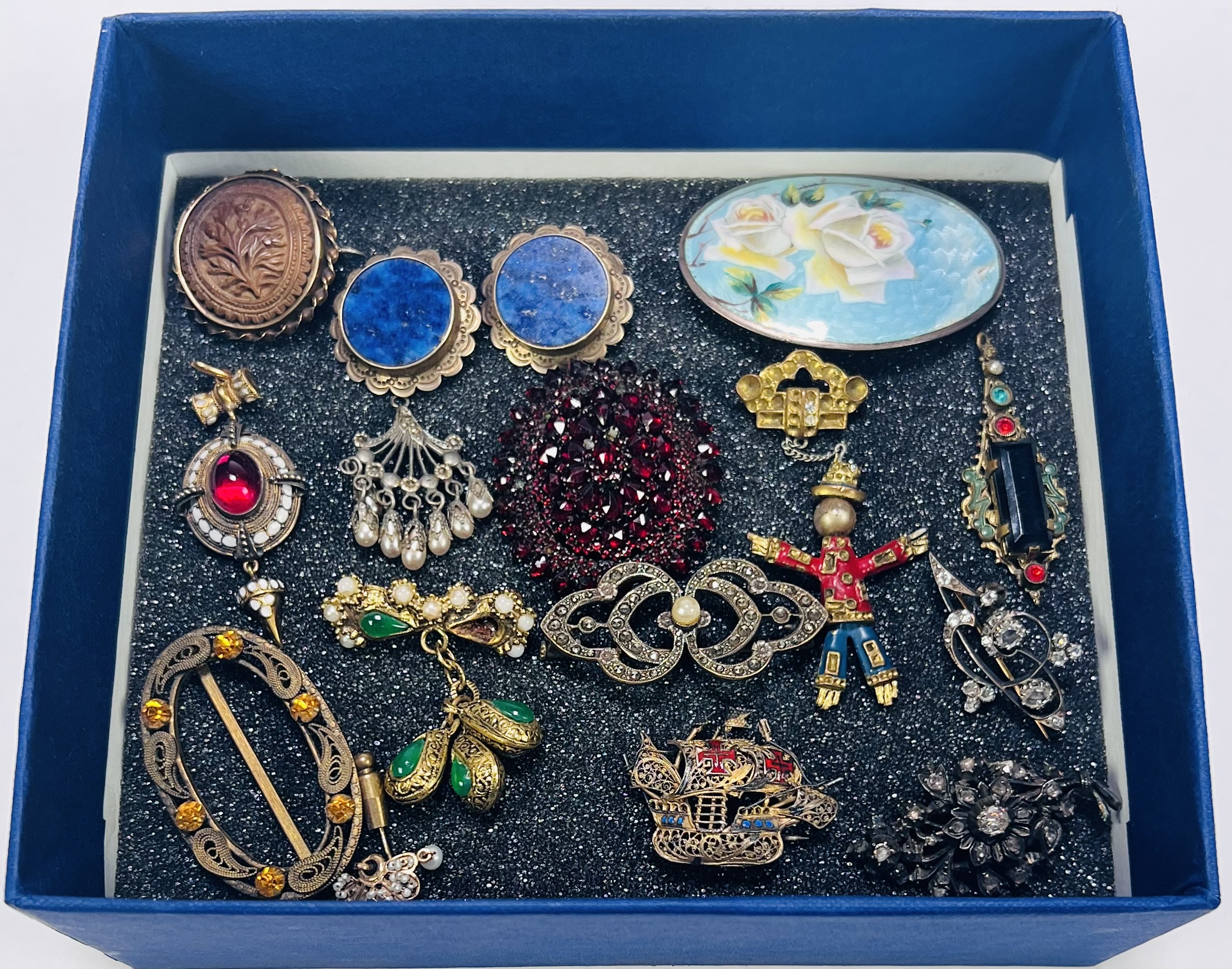 Verzameling sieraden, eind 19e tot midden 20e eeuw, vervaardigd in messing, glasstenen, emaille en faux parels. De set omvat diverse broches en spelden in stijlen variërend van neorenaissance en Art Deco tot volkskunst, waaronder een geëmailleerde rozenbroche, een rode pavézetting, een poppetjesbroche in emaille en een scheepsvormige broche. Jouw kans op deze sieraden begint met registreren – bied live of online mee!! |