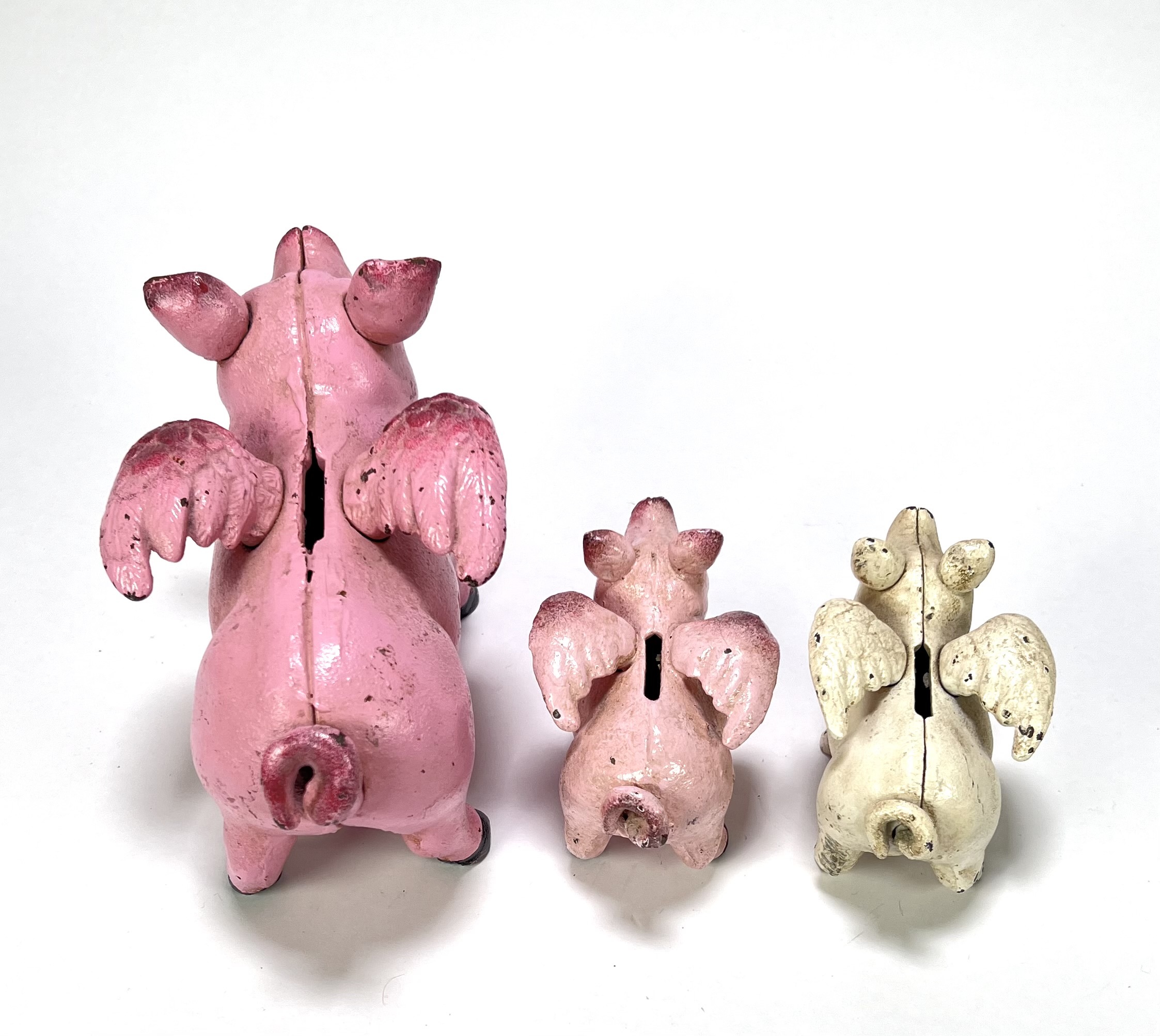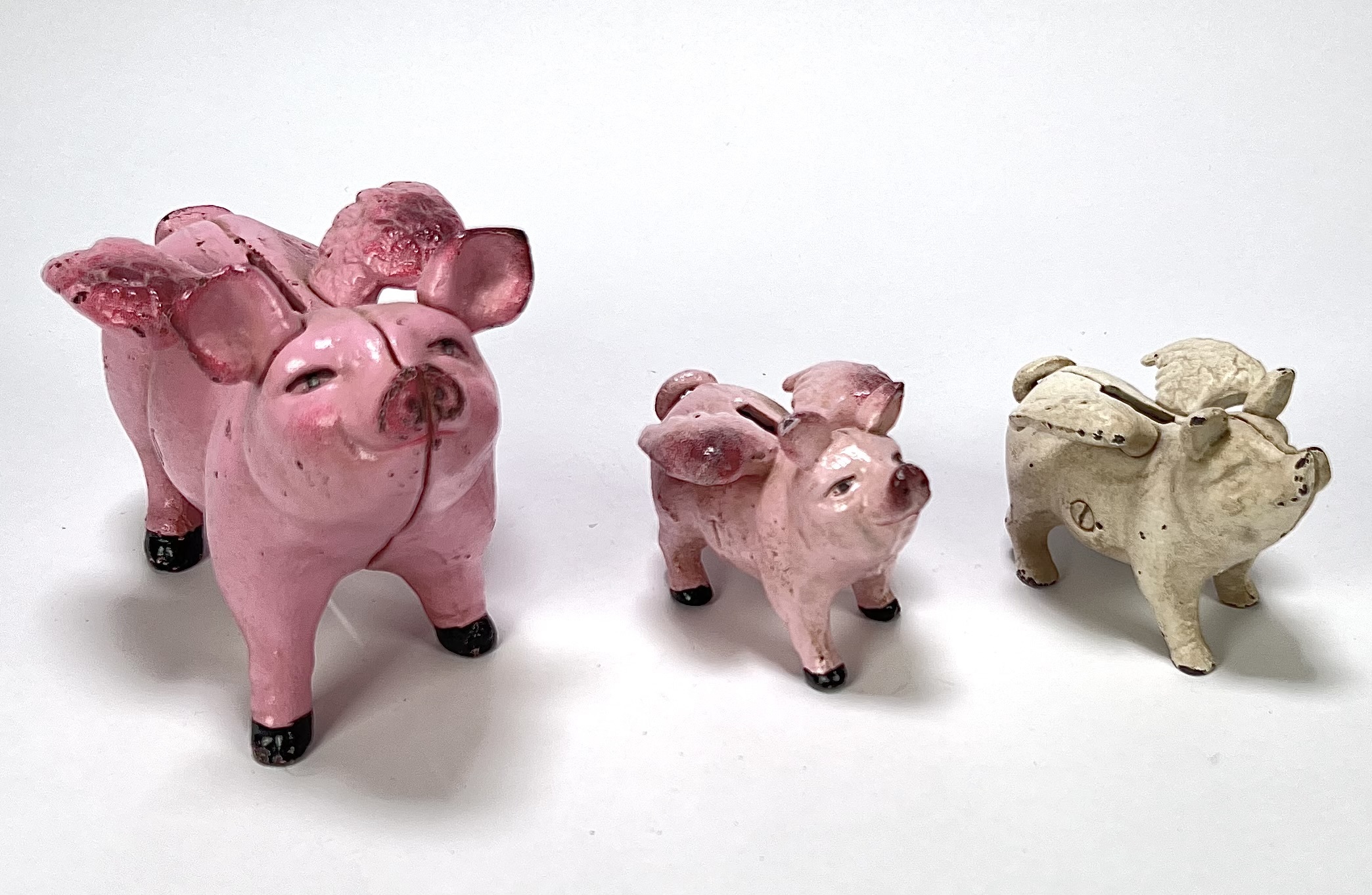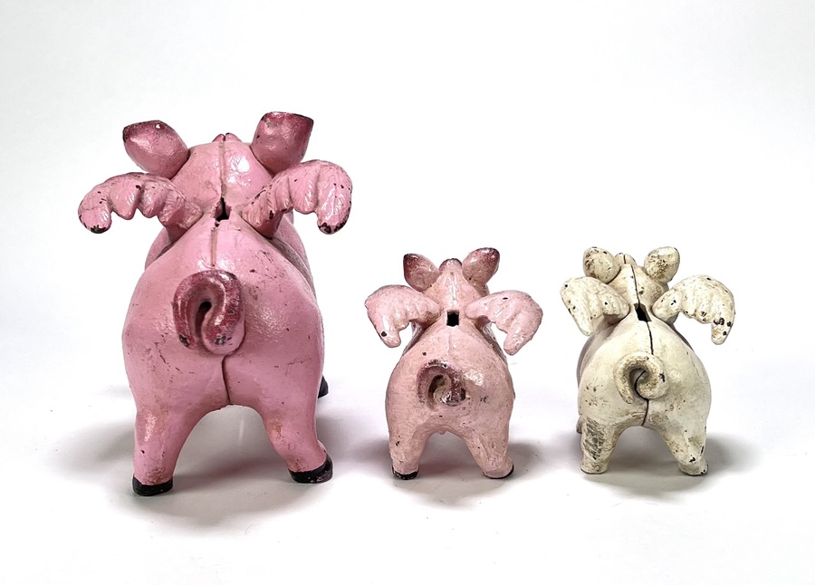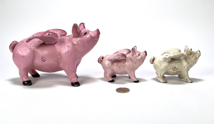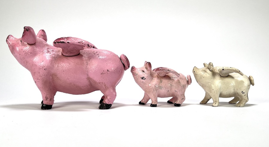 Gietijzeren spaarvarkens met vleugels, ca. midden 20e eeuw, Europa