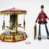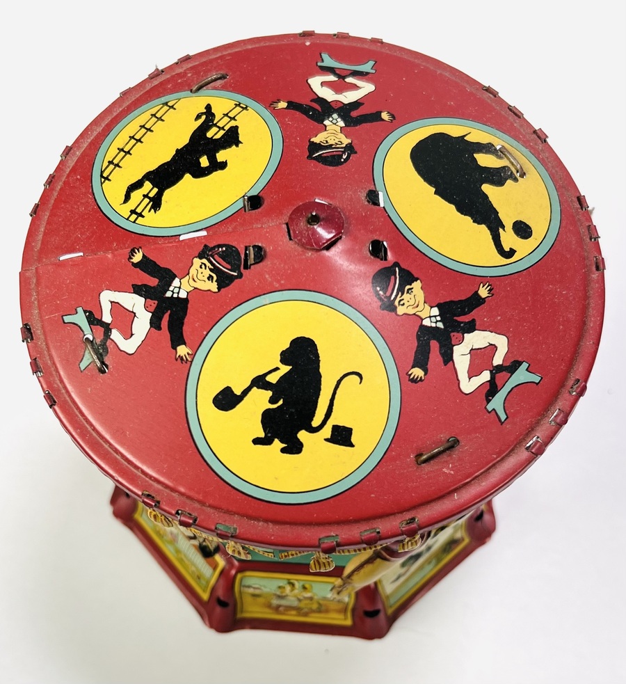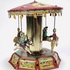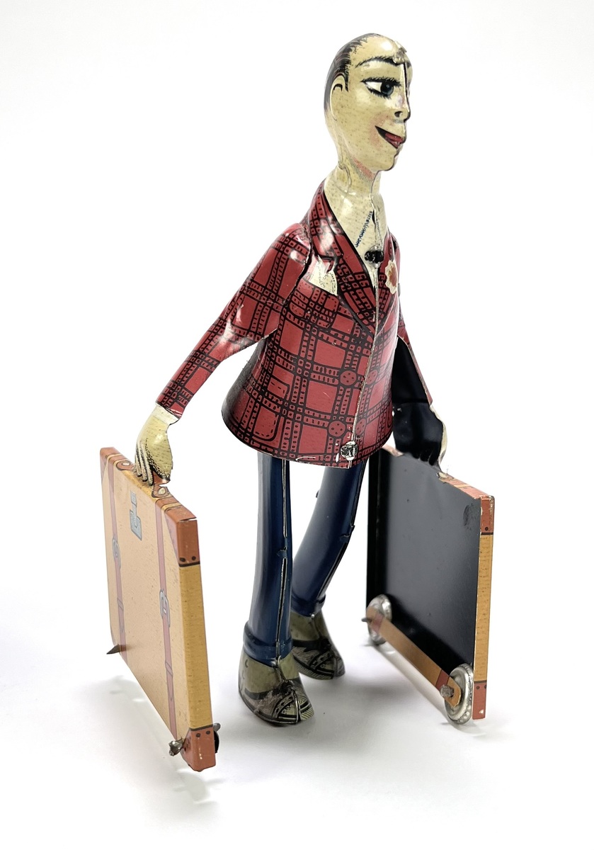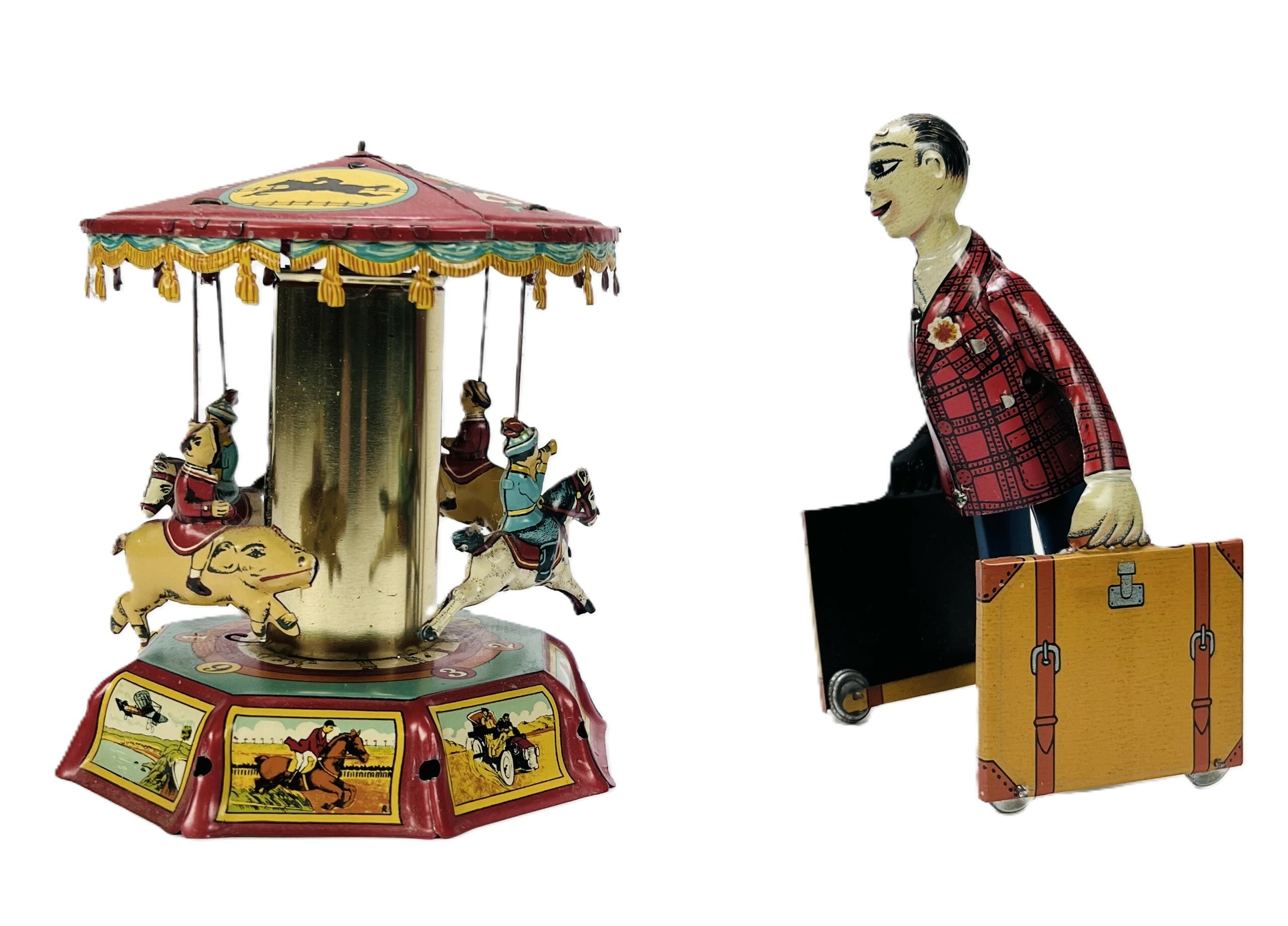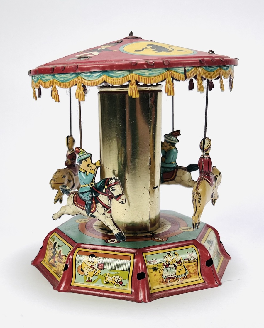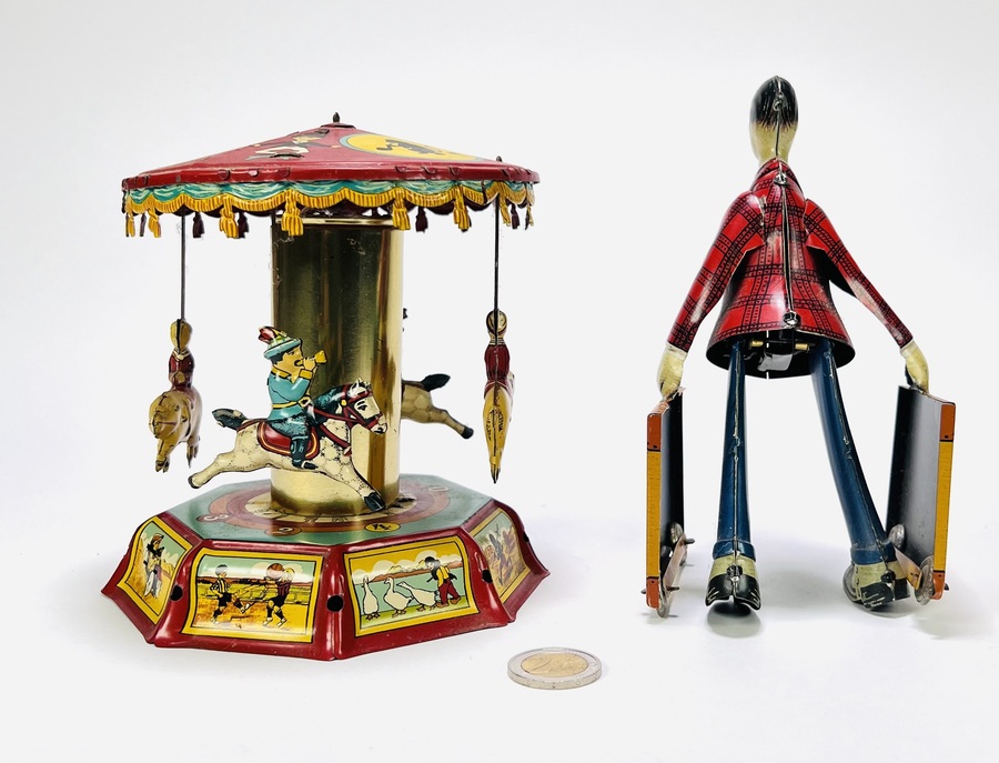 Kleurrijk naoorlogs blikspeelgoed: een carrousel met hangende ruiters/dieren en een lopende reiziger met twee koffers. Uitgevoerd in gelithografeerd blik met opwindmechaniek. De carrousel heeft een achtkantige voet met scènes en rood dak met franje; de reiziger draagt rood jasje, koffers met wieltjes. Europa, midden 20e eeuw. Kom langs tijdens de kijkdagen (29 t/m 31 augustus) en ontdek dit speelgoed zelf! |
