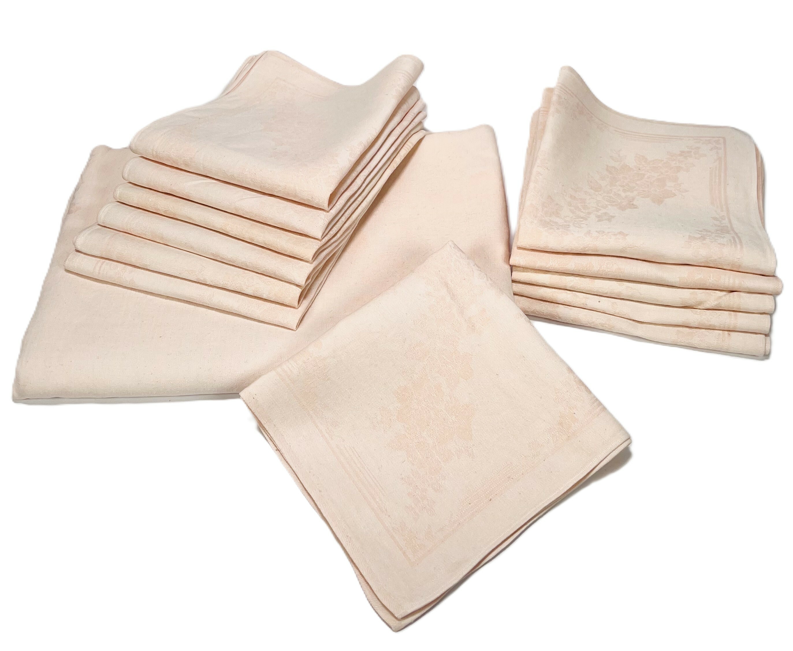 Set van een damasten tafellaken en twaalf servetten uit het midden van de 20e eeuw, met ingeweven florale patronen. De toegepaste techniek is jacquardweven, wat zorgt voor de zichtbare patronen in de stof. Het tafellinnen heeft een zachte, lichtroze tint en is bestemd voor tafeldecoratie. Geïnteresseerd? Bezoek onze kijkdagen op 29, 30 of 31 augustus van 11:00 tot 17:00 uur! |