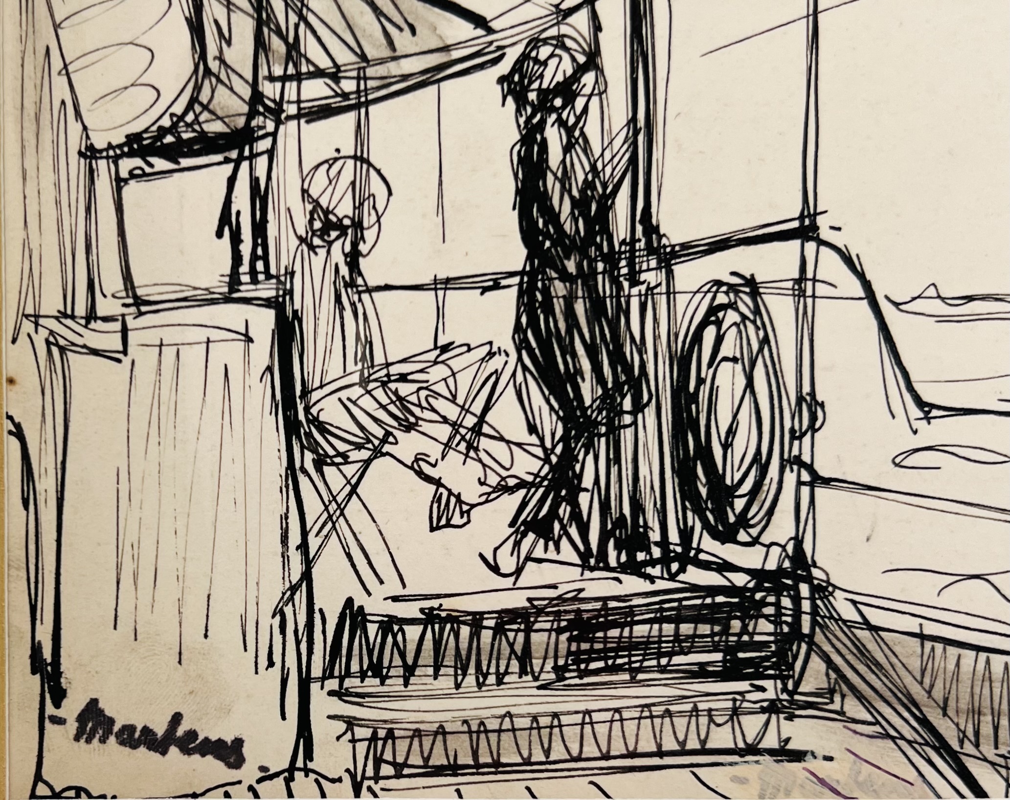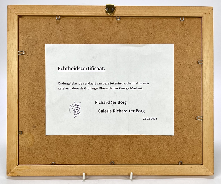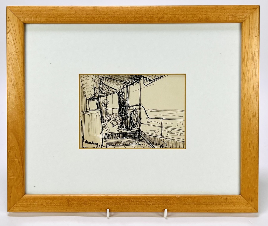 Tekening van Gijsbert George Martens (1894–1979) in expressieve Ploeg-stijl, midden 20e eeuw. Zwarte inkt op papier, pen. Voorstelling van twee figuren op scheepsdek met zeezicht. Linksonder gesigneerd “Martens”. Ingelijst in houten lijst achter glas. Achterzijde met echtheidscertificaat van Galerie Richard ter Borg, gedateerd 22-12-2012, waarin authenticiteit van de tekening door George Martens wordt bevestigd. Schetsmatig lijnenspel met donkere accentvlakken kenmerkt de compositie. Wil je deze tekening in het echt bekijken? Kom naar de kijkdagen op 29, 30 en 31 augustus! |