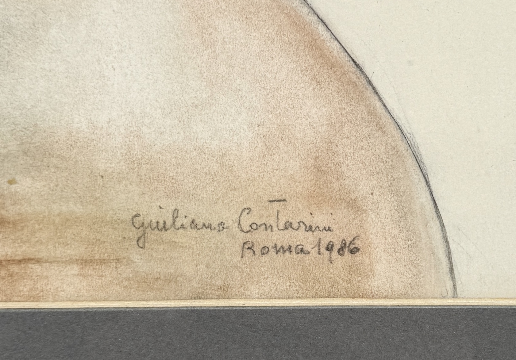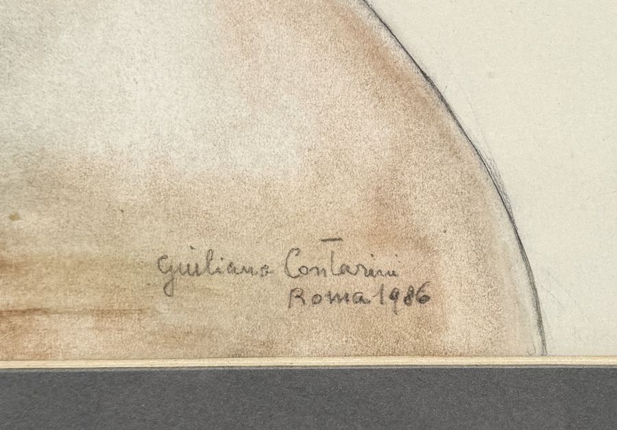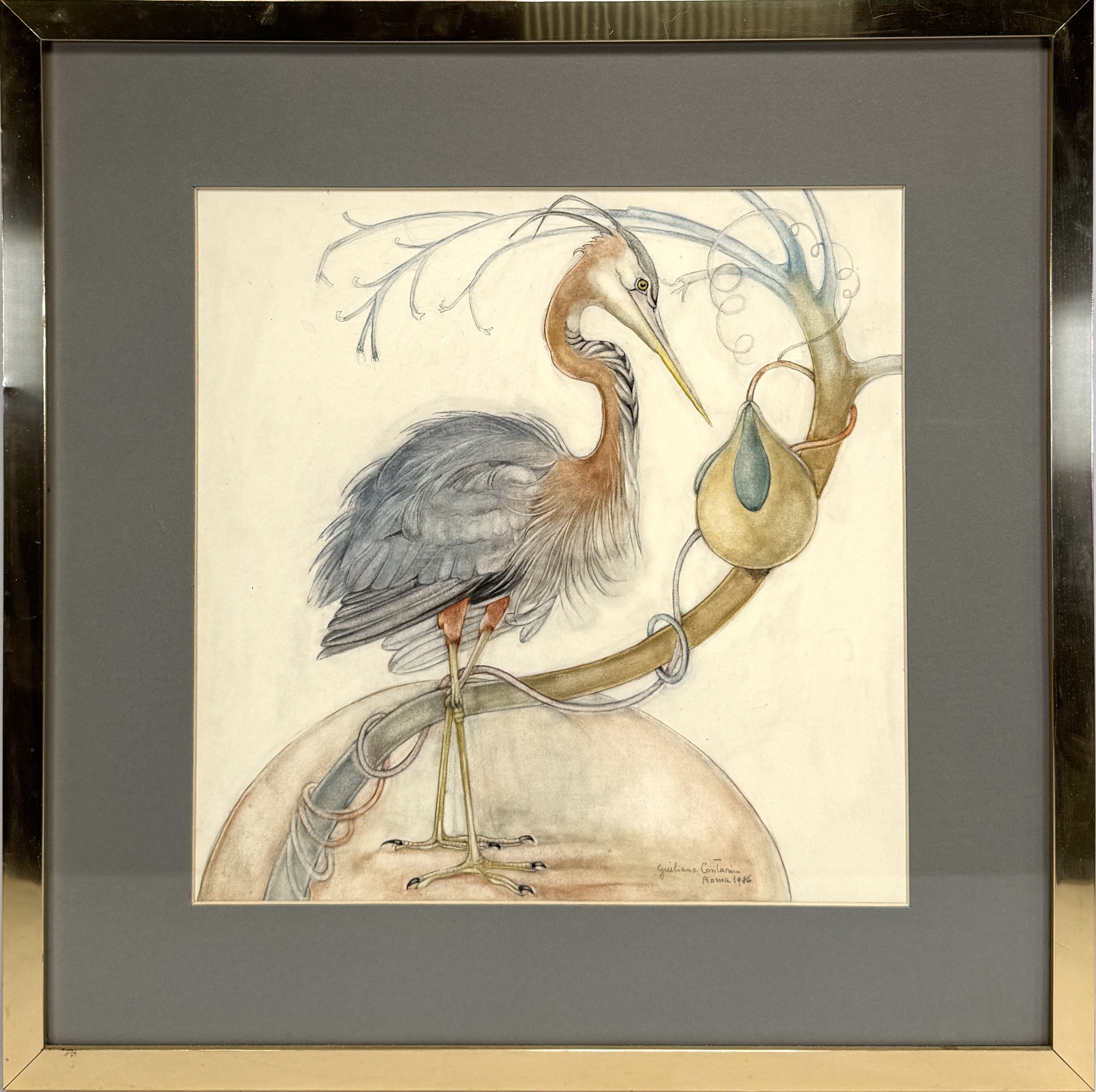Een tekening van Giuliano Contarini uit 1986, uitgevoerd met potlood en aquarel op papier, in surreële stijl. De voorstelling toont een reiger op een ovaalvormig platform. De vogel is gedetailleerd, terwijl de rest van de compositie minimalistisch is. Het werk is gesigneerd en gedateerd rechtsonder. Deze tekening zelf beoordelen? Je bent welkom op onze kijkdagen op 29, 30 en 31 augustus! |