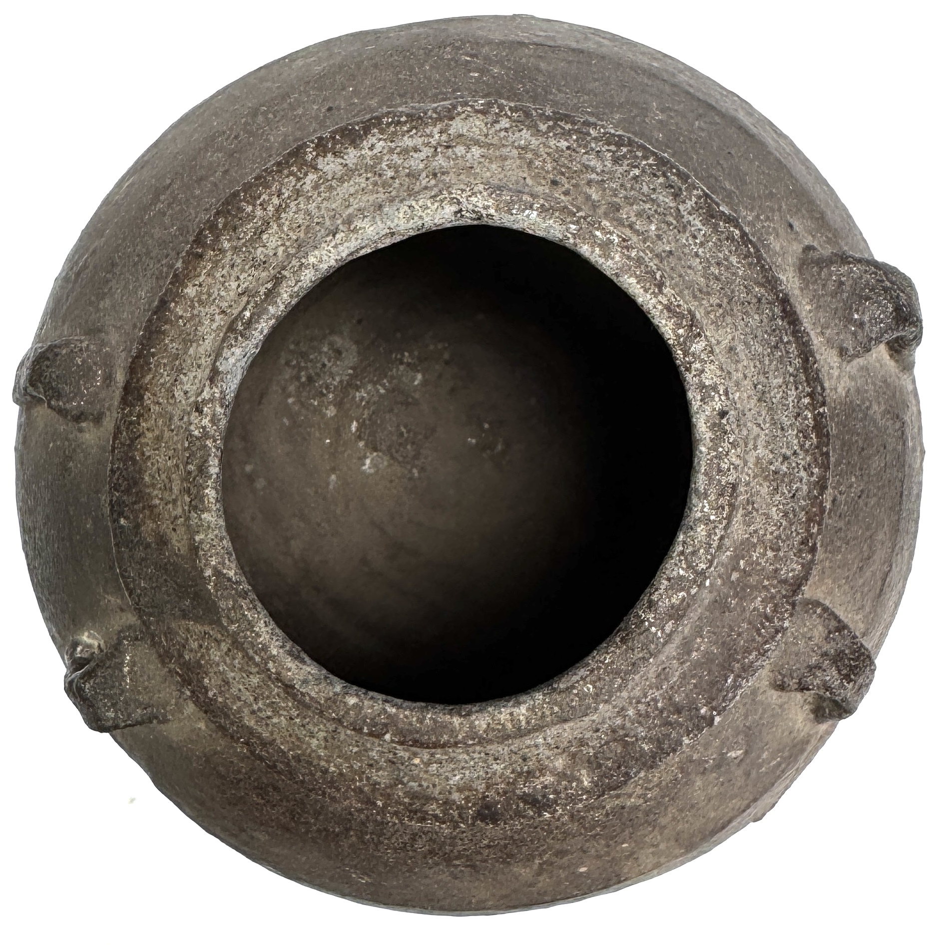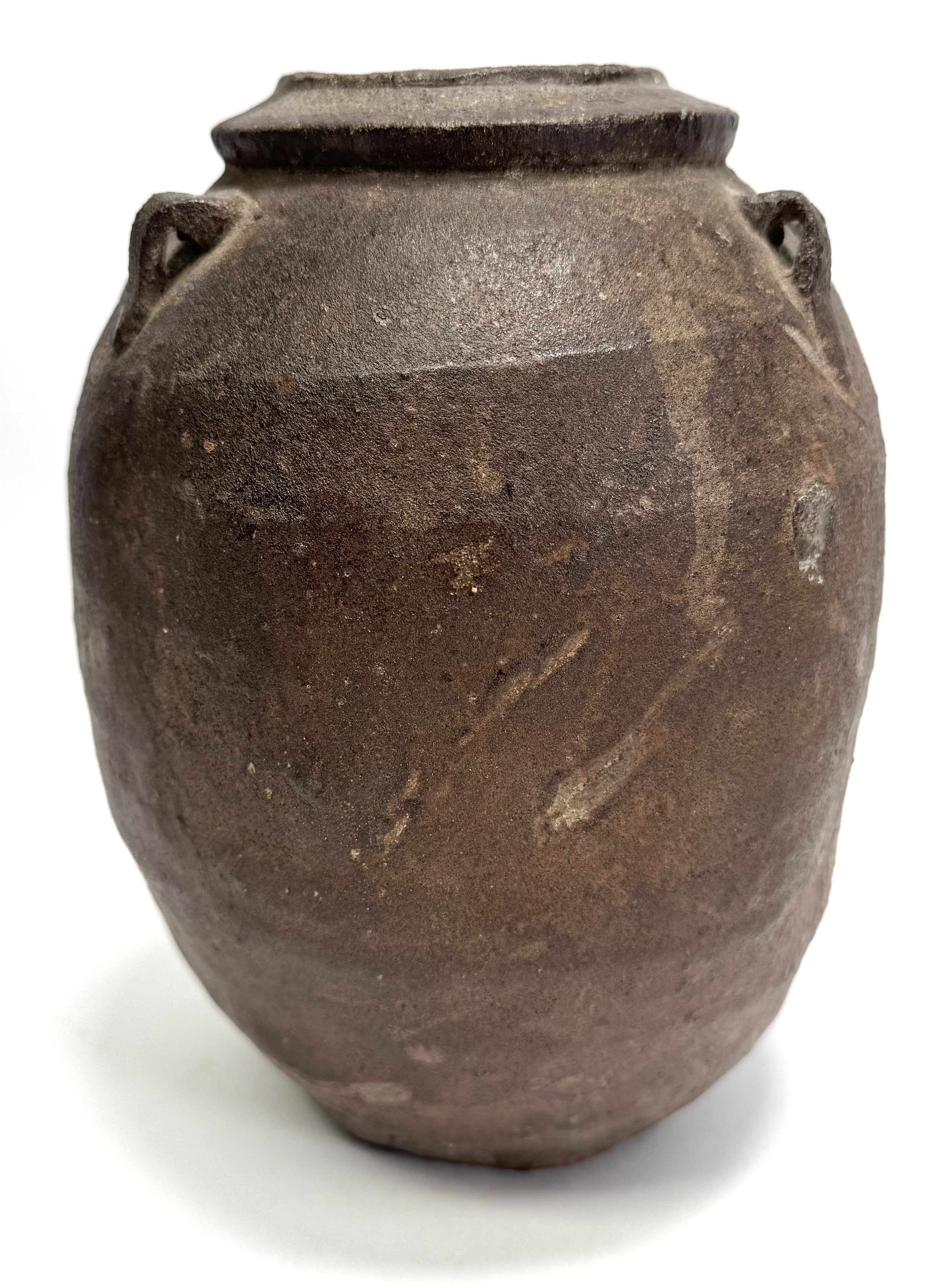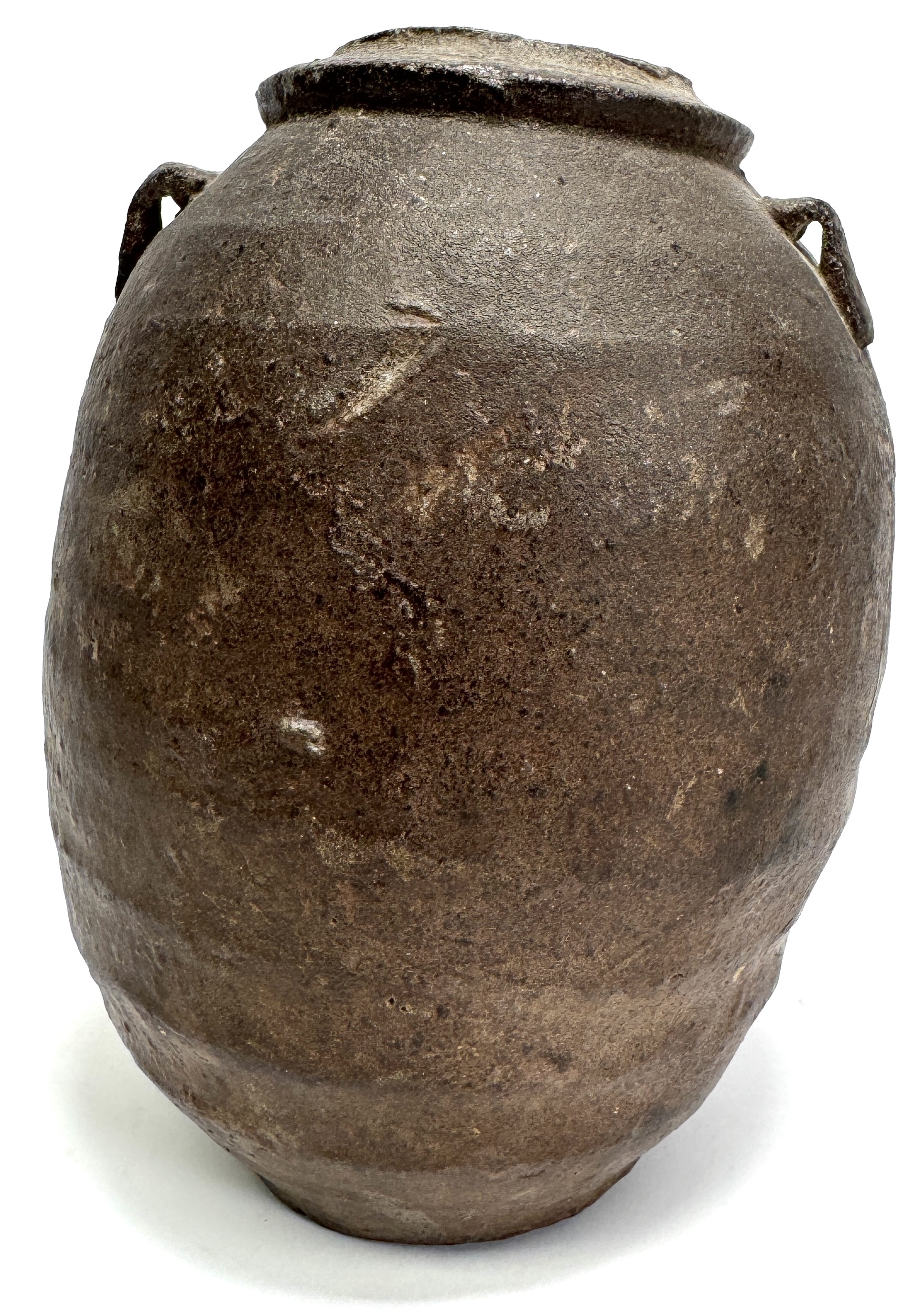 Aardewerken kan, omstreeks 19e eeuw, uitgevoerd in een eenvoudige utilitaire stijl. De vorm is bol met smalle monding en korte cilindrische hals met opgelegde rand. Aan weerszijden zijn lusvormige oren aangebracht. Het oppervlak toont een ruwe textuur in variërende bruintinten en baksporen, gedraaid en hoog gebakken. Zeker zijn van deelname? Plaats vanaf 22 augustus een schriftelijk bod online! |