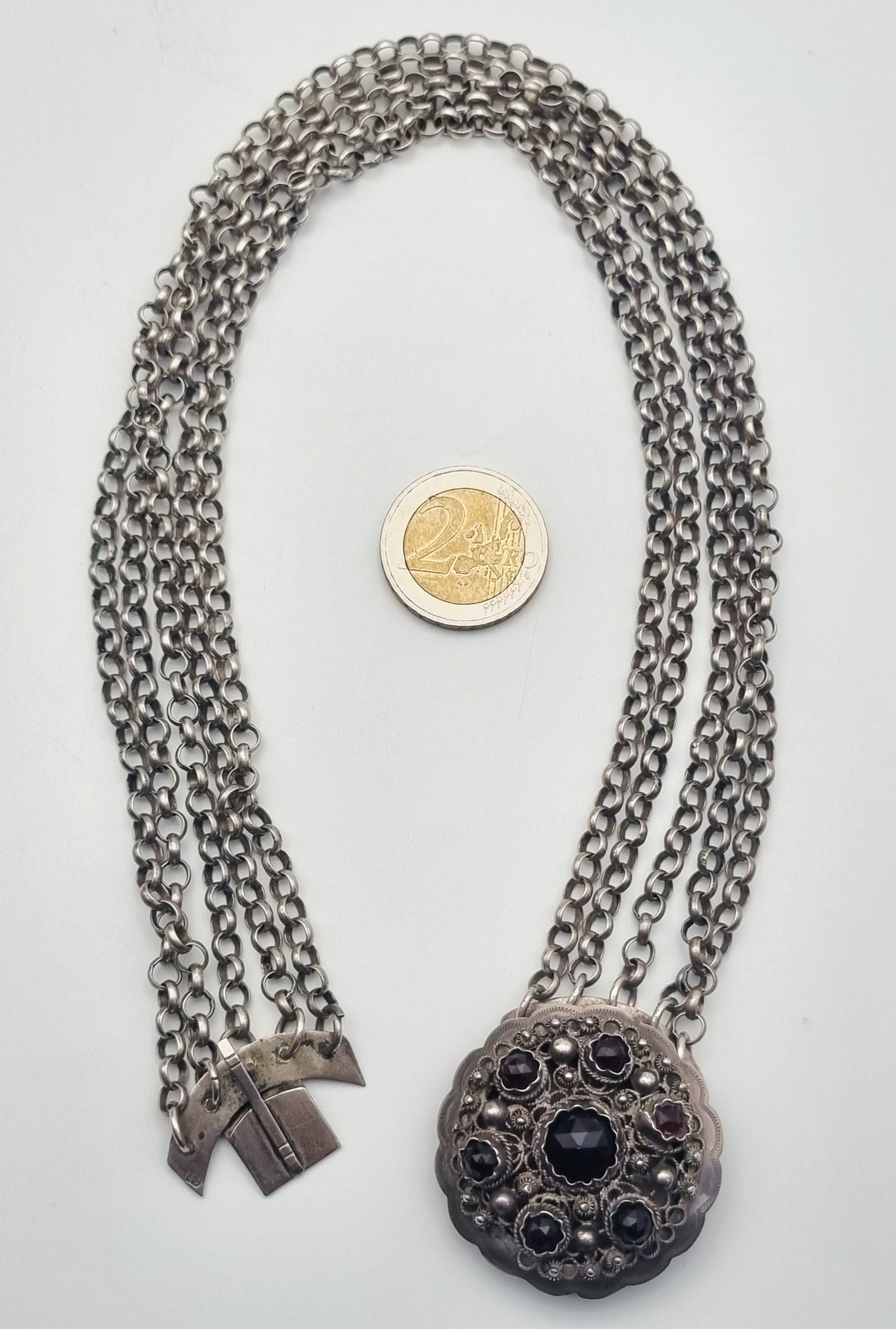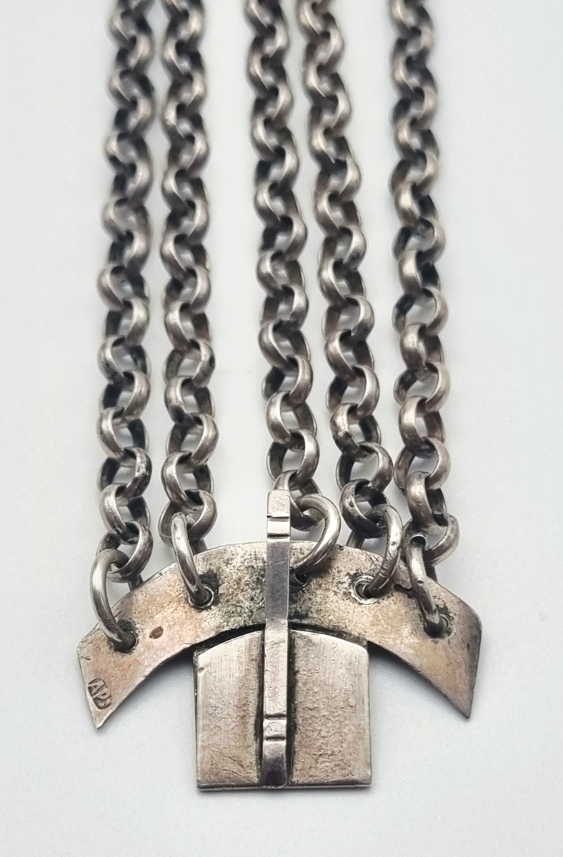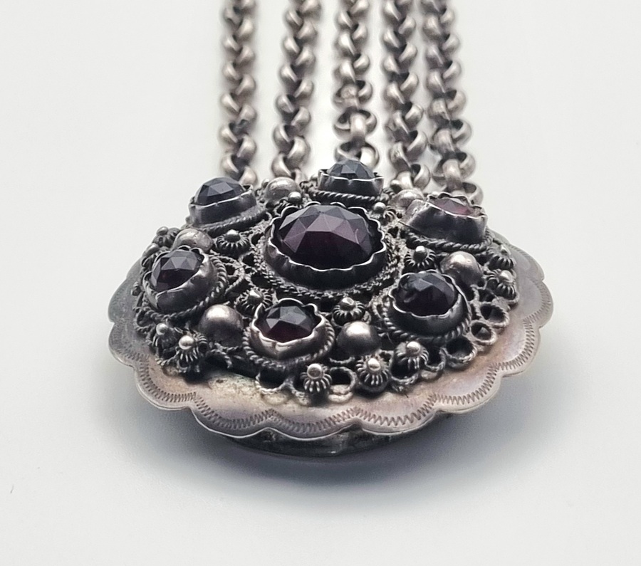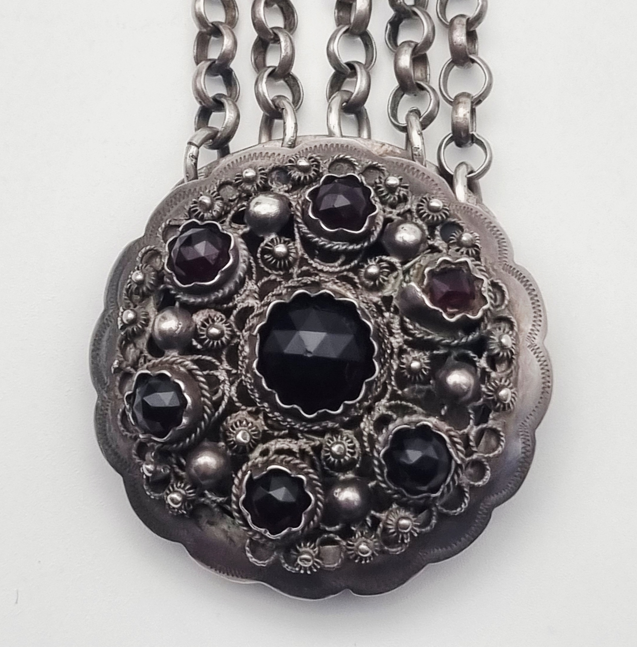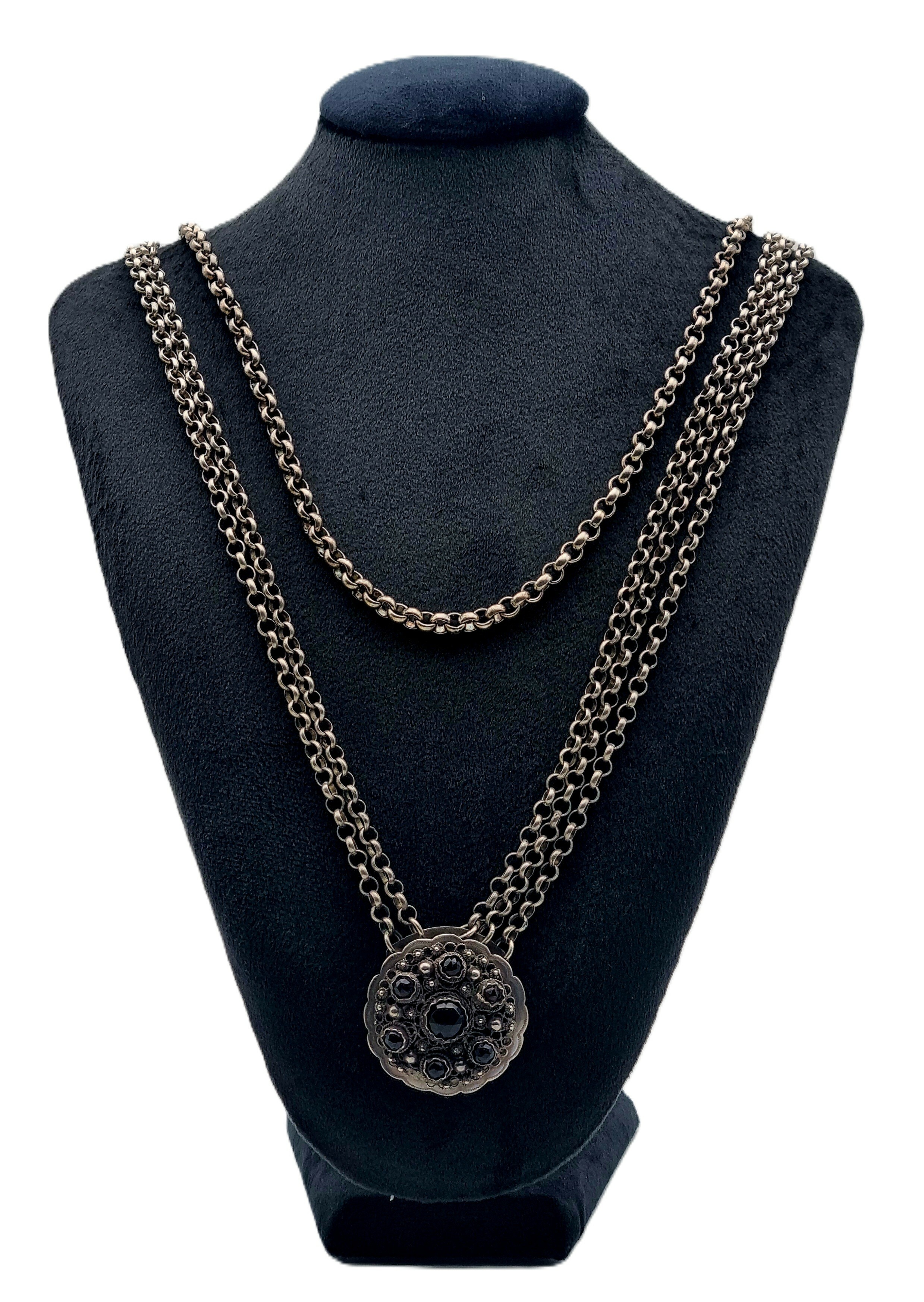 Twee zilveren kettingen, een drievoudige jasseron met ronde rozethanger die tevens als broche te dragen is, uitgevoerd met filigrain en granulatiedecor, gezet met zwarte gefacetteerde steentjes, op de achterzijde gemerkt met het Nederlandse zwaardje, datering eerste helft twintigste eeuw. Daarbij een lange ketting gemerkt 925, laat twintigste eeuw. Wil je direct deelnemen? Plaats vanaf 22 augustus alvast een schriftelijk bod via onze website! |